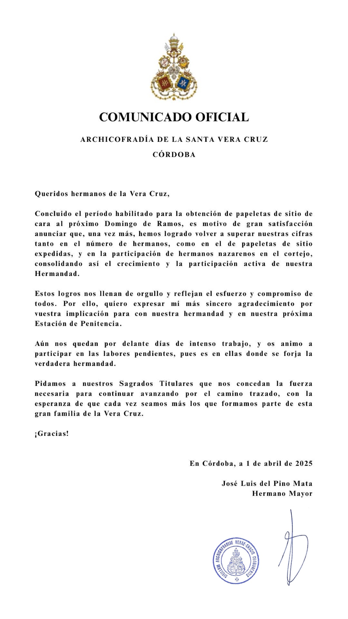Expresar el más grande de los agradecimientos posibles desde esta Archicofradía a don José María Horrillo, Marqués de Vivanco, por pensar en esta Humilde Hermandad de la Vera-Cruz de Córdoba a fin de que la Santa Reliquia del Lignum Crucis que pertenece desde el siglo XVII a su familia, sea venerada por los fieles que tenemos como símbolo universal del Cristianismo y de la Iglesia, a la Santa Cruz de Cristo.