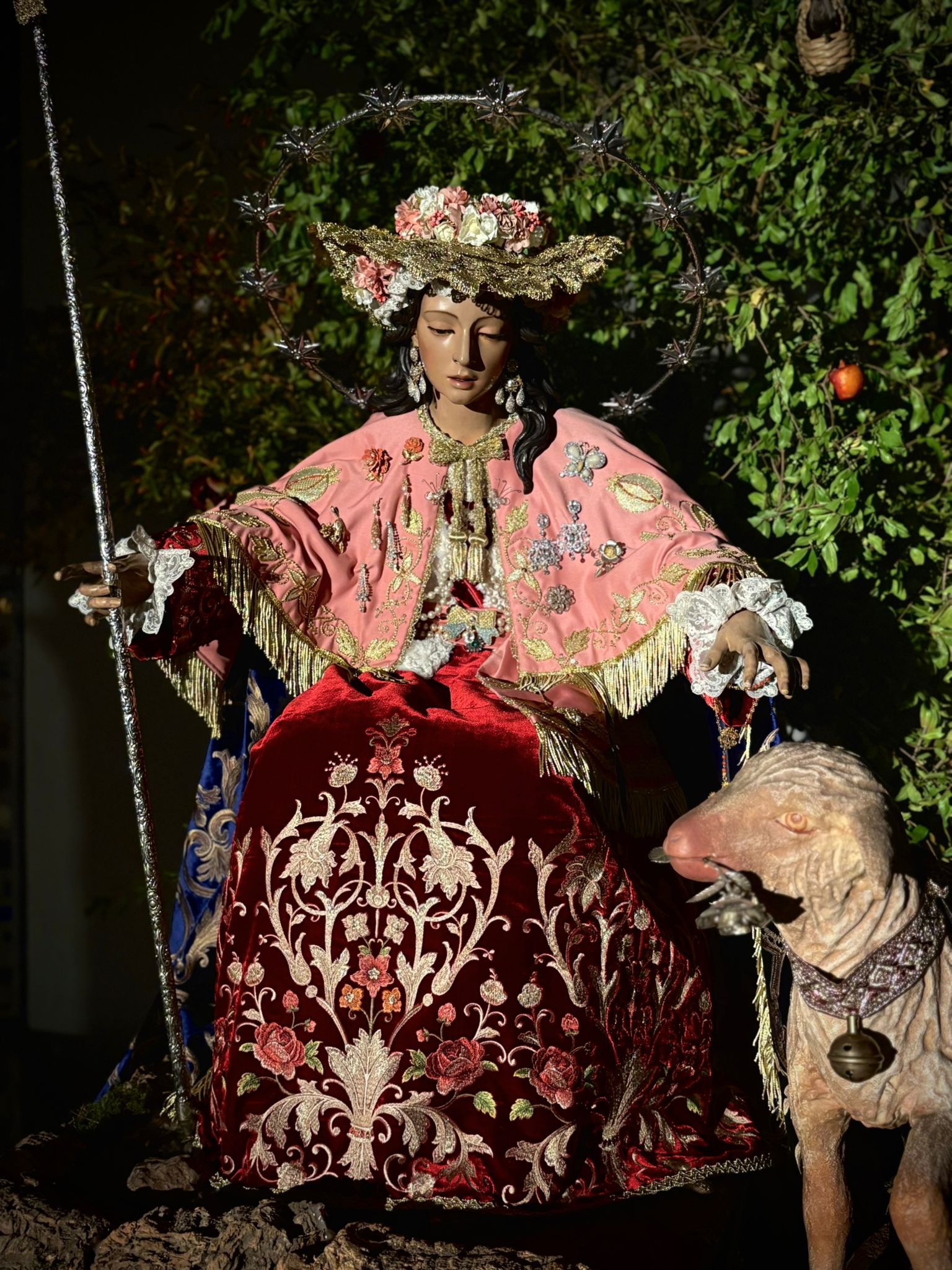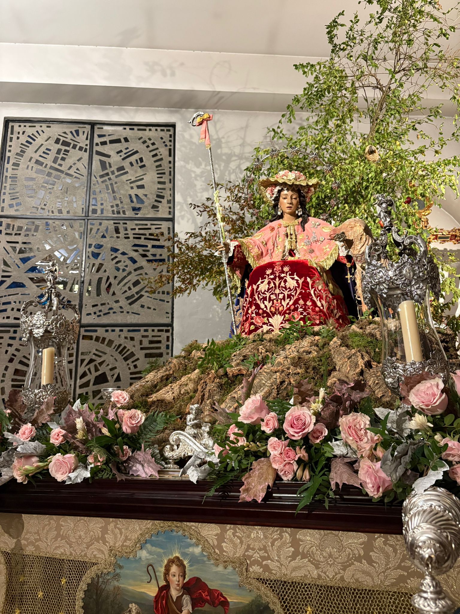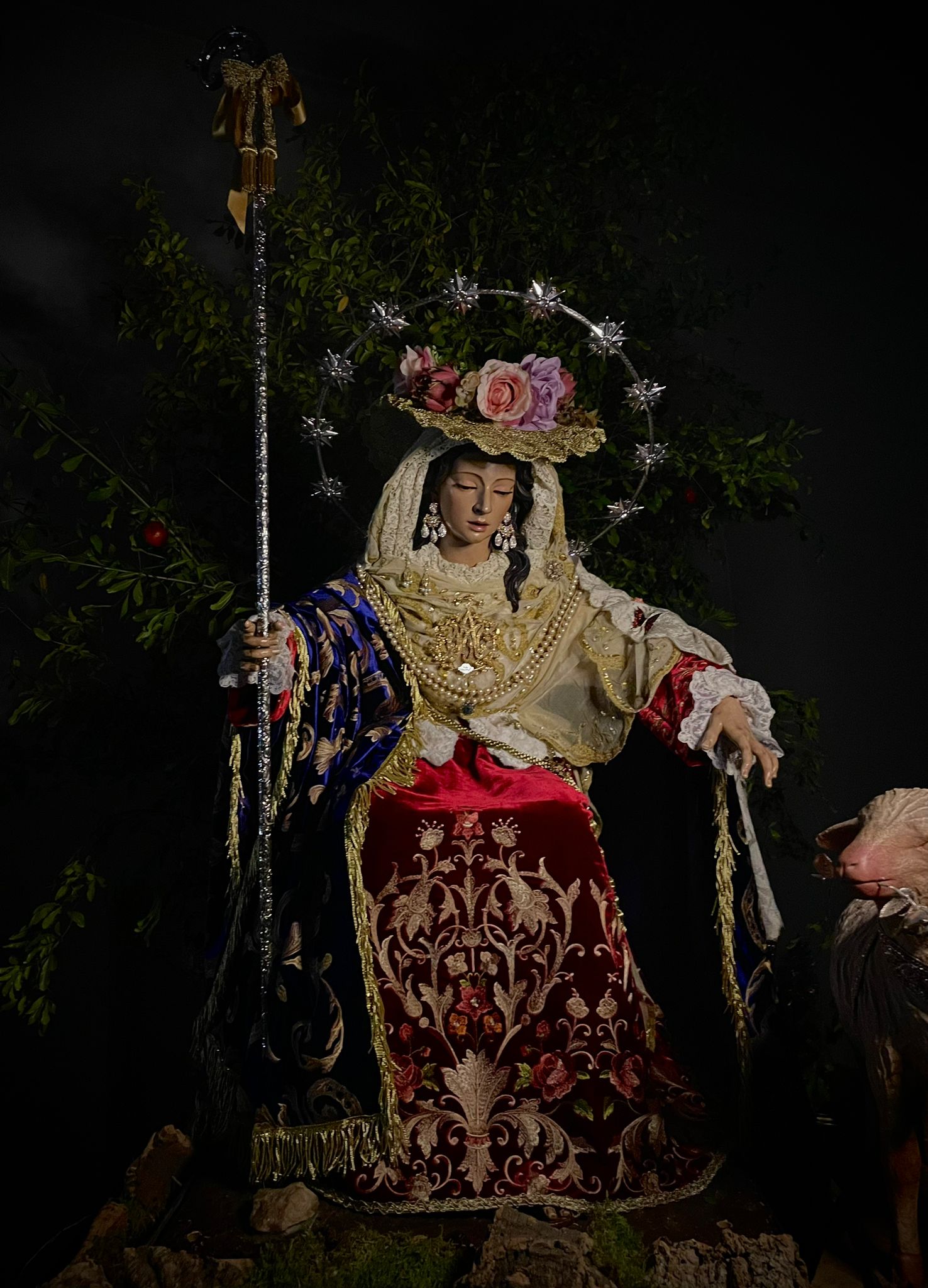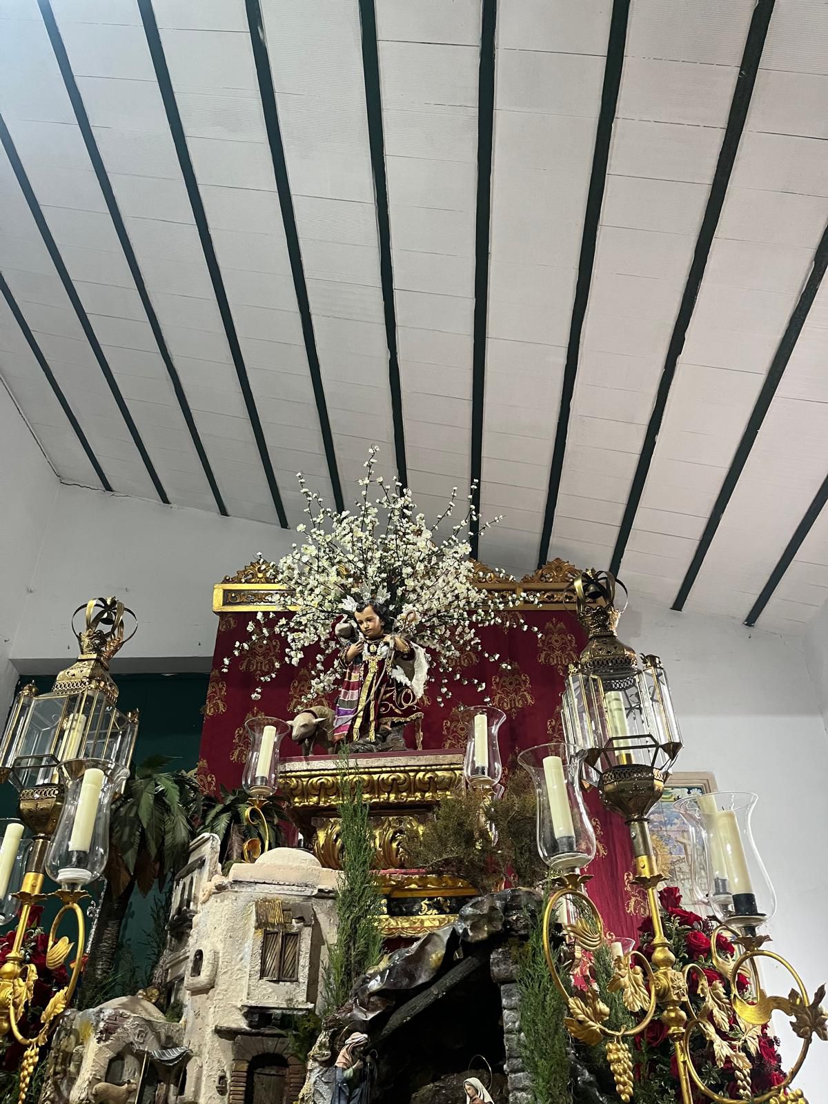 Un año más, la Divina Pastora preside el altar mayor de la parroquia, recreando con delicadeza y solemnidad el portal de Belén, acompañada por San José y aguardando con esperanza el Nacimiento de Nuestro Señor Jesucristo. Ambas imágenes se disponen bajo un cobertizo de madera, evocador de la sencillez del pesebre, y aparecen rodeadas de aperos de labranza y cestas con frutos, símbolos del trabajo humilde y de los dones de la tierra ofrecidos al Redentor.