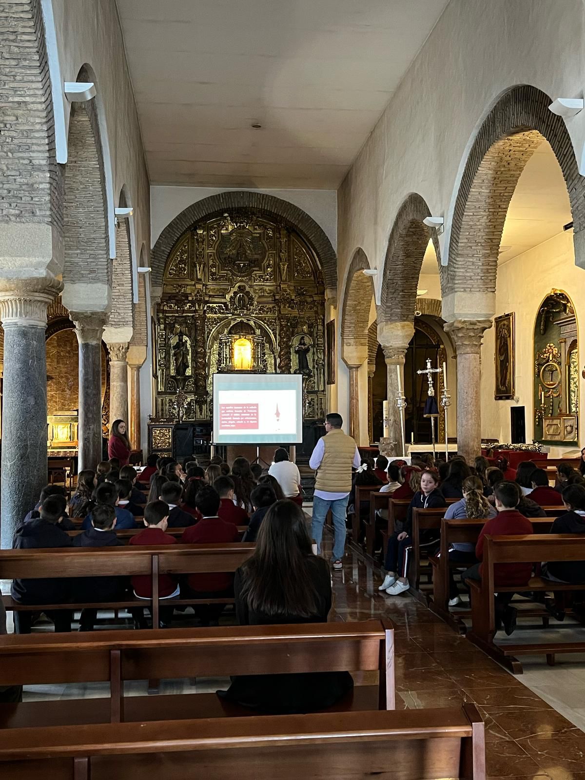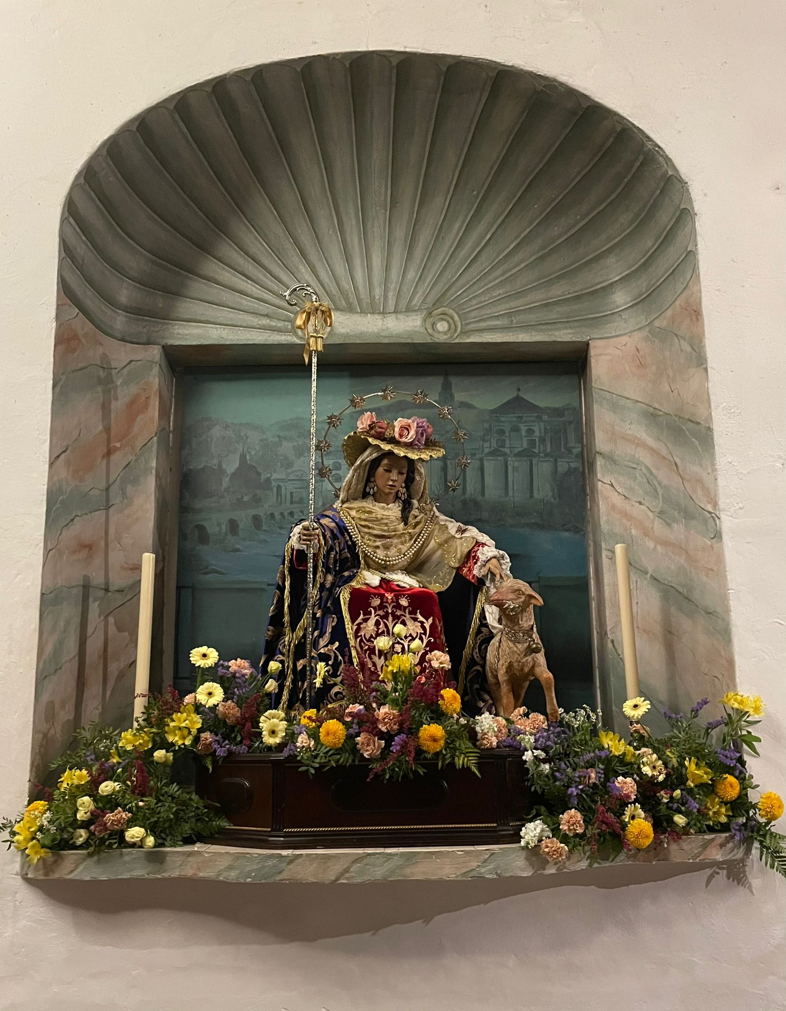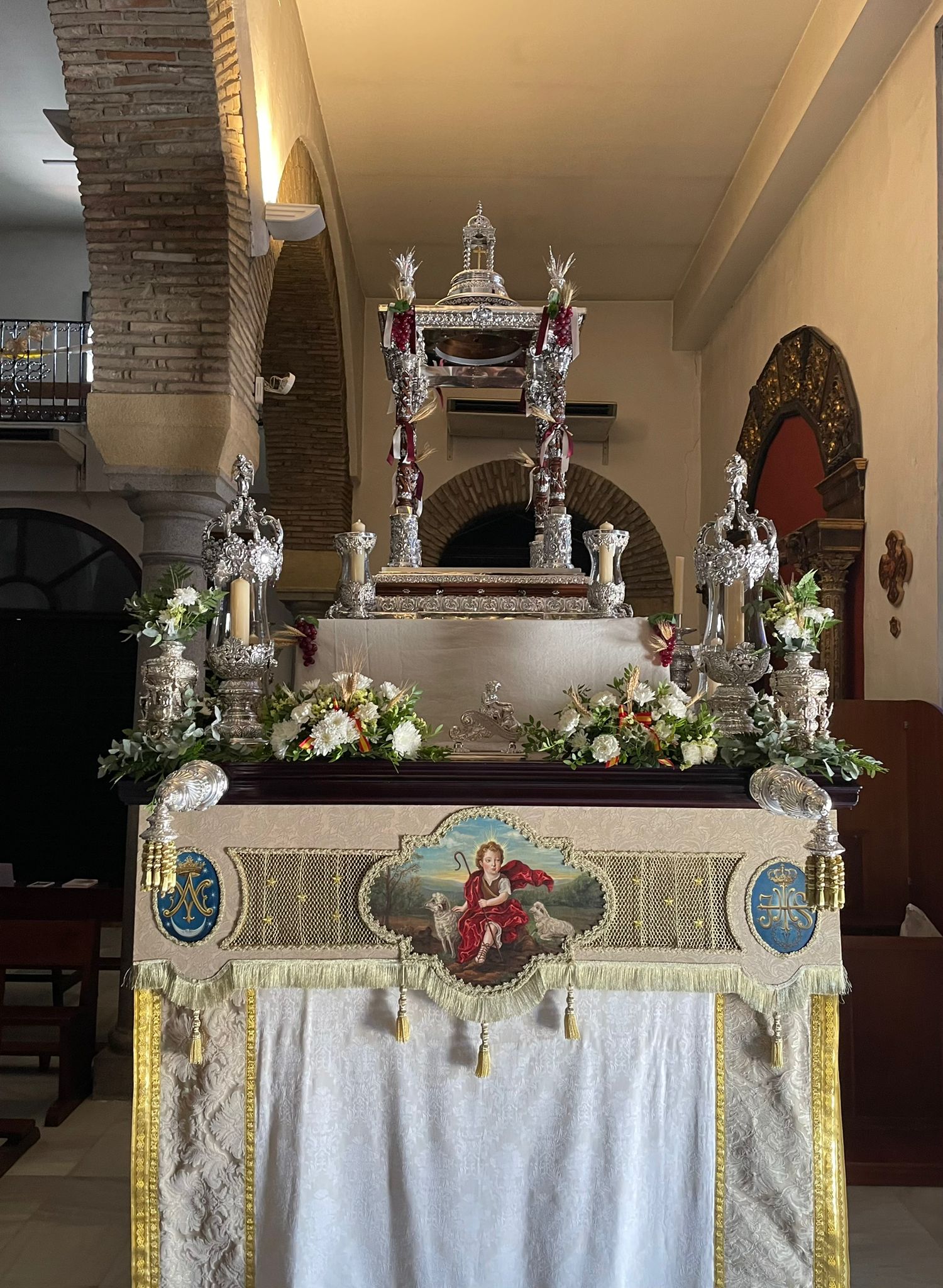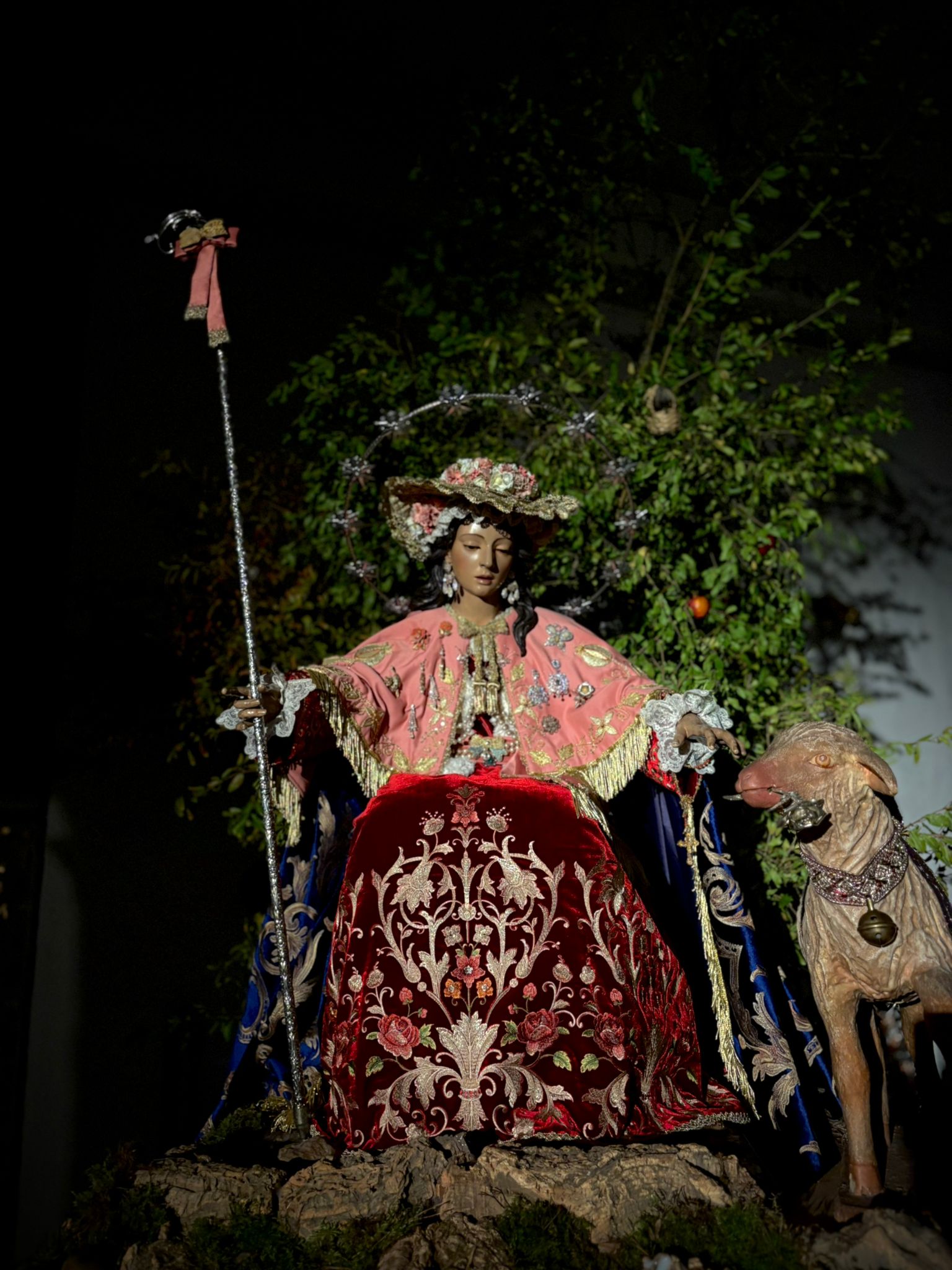Un año más, la Divina Pastora preside el altar mayor de la parroquia, recreando con delicadeza y solemnidad el portal de Belén, acompañada por San José y aguardando con esperanza el Nacimiento de Nuestro Señor Jesucristo. Ambas imágenes se disponen bajo un cobertizo de madera, evocador de la sencillez del pesebre, y aparecen rodeadas de aperos de labranza y cestas con frutos, símbolos del trabajo humilde y de los dones de la tierra ofrecidos al Redentor.