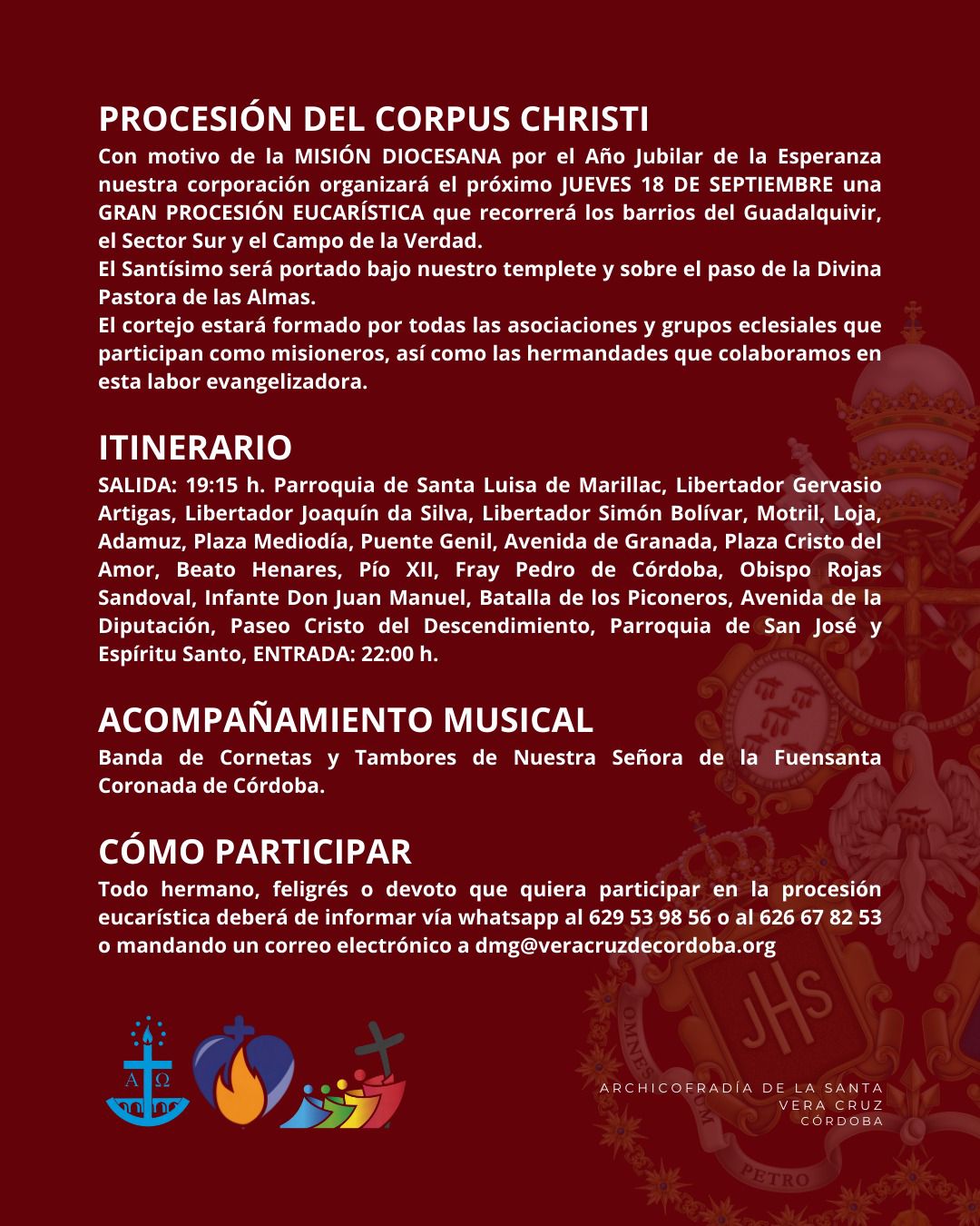 Rogamos a todos los hermanos que deseen participar que formalicen su solicitud dentro del plazo establecido, a fin de facilitar la correcta organización de la cofradía.