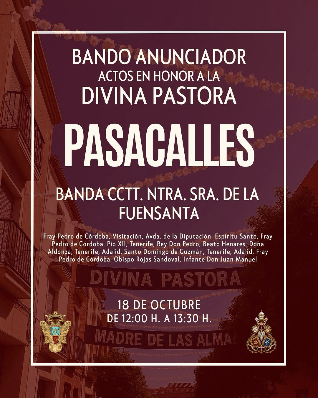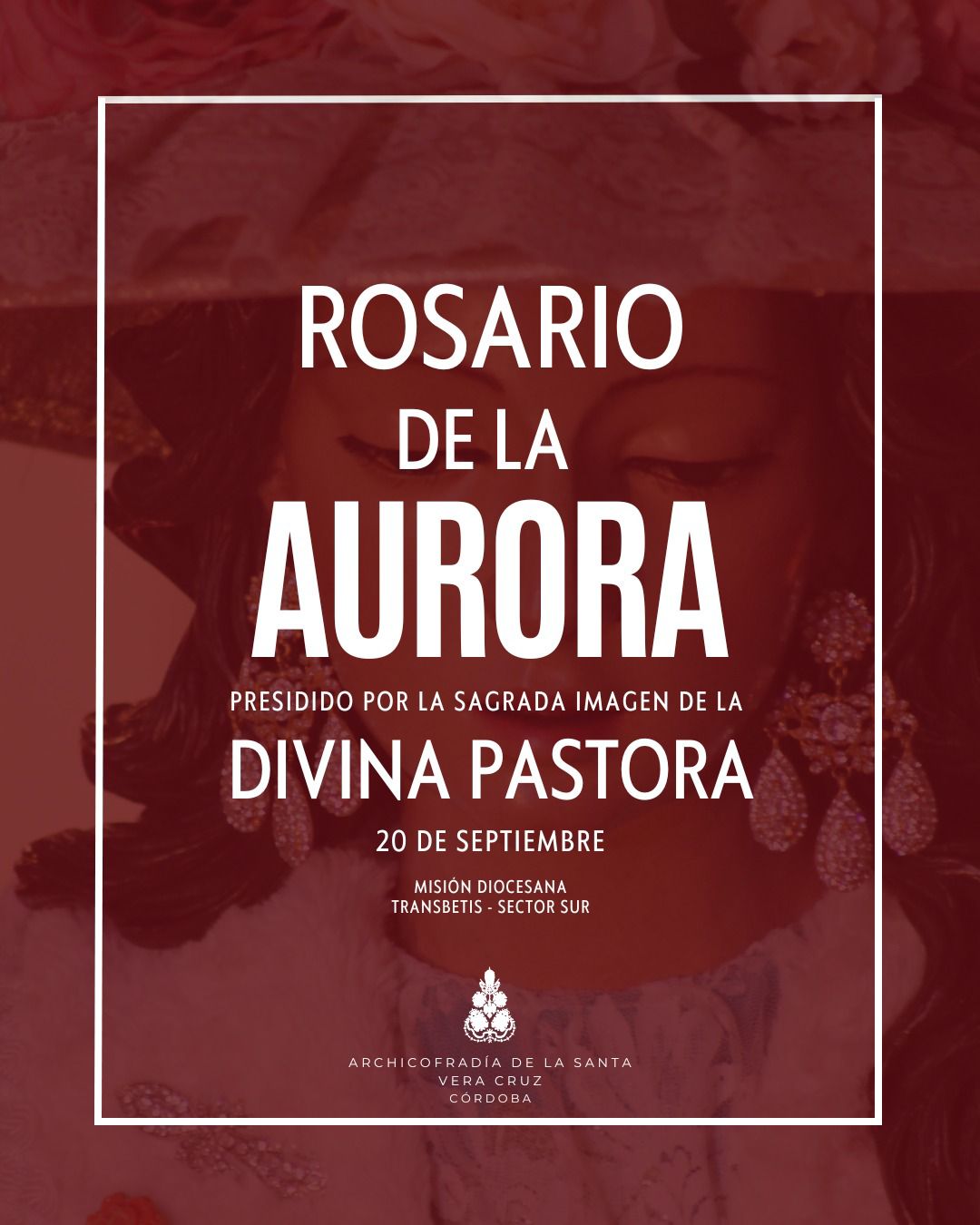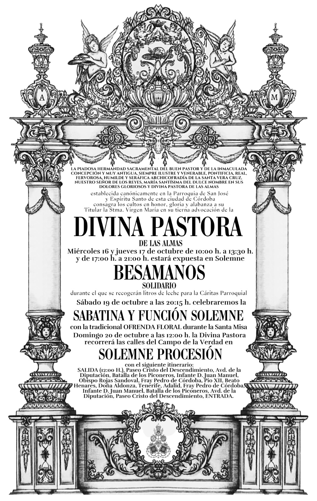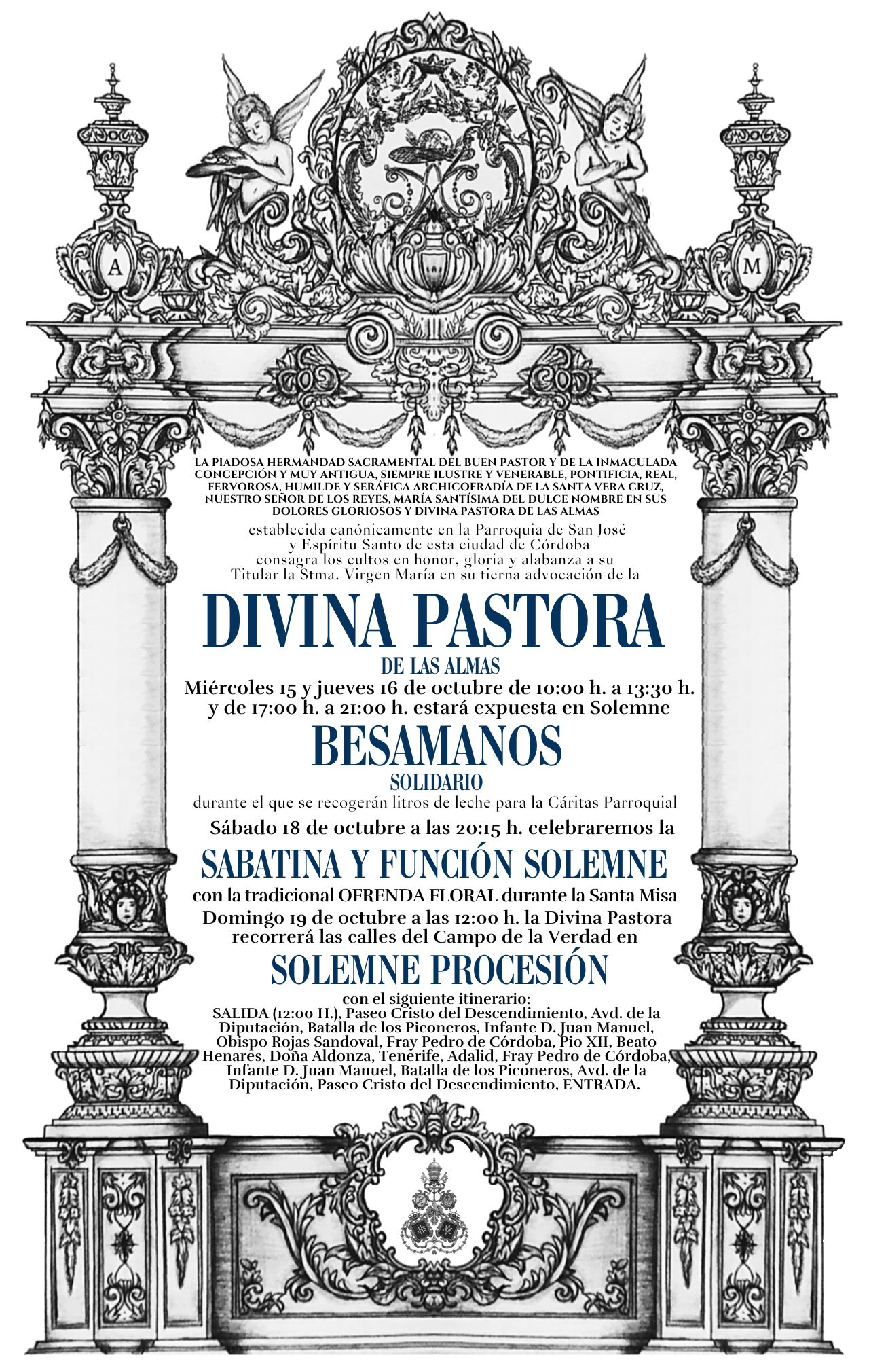 Nos adentramos de lleno en los días grandes en torno a la Divina Pastora de las Almas, Titular de Gloria de nuestra Archicofradía. Así, el sábado 15 de octubre celebramos la Función Principal en Su honor a las 20:30 horas en nuestra Parroquia. Durante la misma se realizará la ofrenda de flores que serán depositadas ante Ella, que ya estará entronizada en Su Paso. Las flores podrán ser adquiridas en la puerta de la Parroquia antes del comienzo de la Santa Misa. La Función Principal será armonizada musicalmente por el Coro Yerbabuena.