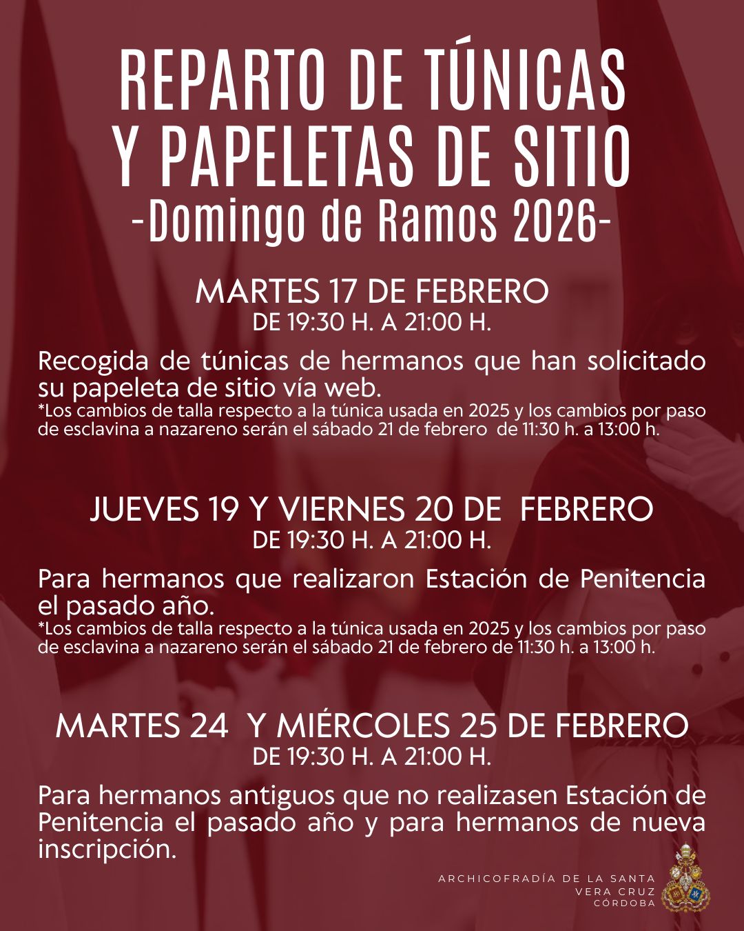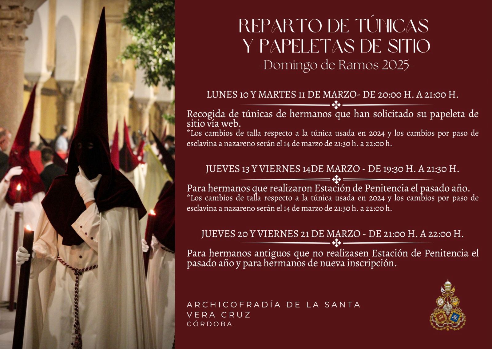 Calendario de los días de reparto de túnicas y papeletas de sitio en nuestra casa de hermandad.Recordamos que puedes solicitar tu papeleta de sitio por la web para agilizar el proceso.