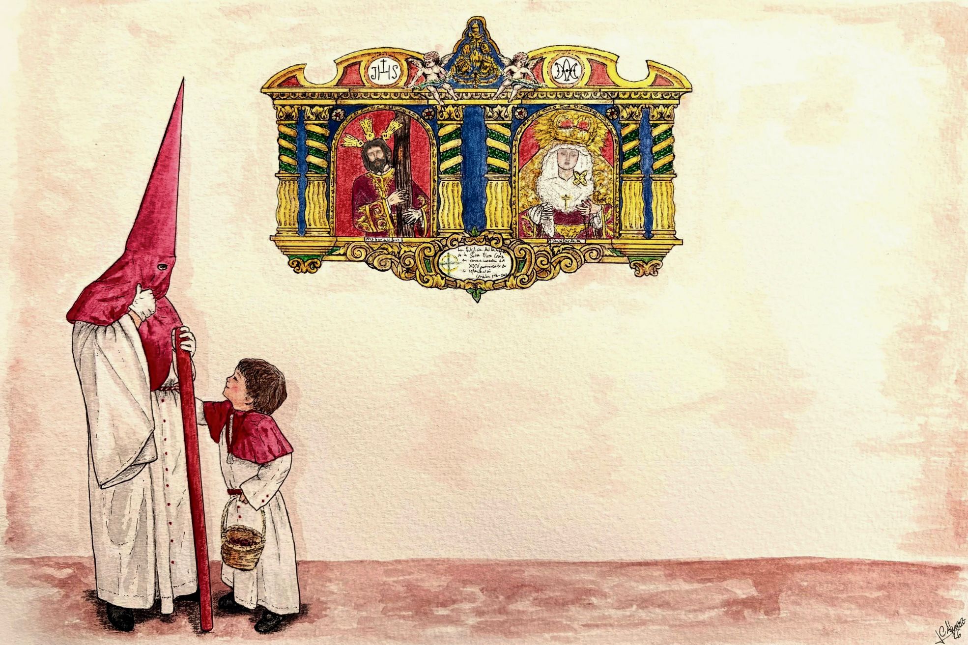 La obra refleja el espíritu de nuestra Estación de Penitencia, representando un Nazareno y una esclavina como símbolo de la savia nueva de la Hermandad, esa nueva generación de hermanos que, con ilusión renovada, vienen a dar continuidad al legado recibido, aportando vida, compromiso y futuro a nuestra corporación. Junto a ellos, aparece el azulejo corporativo situado en el lateral de nuestra parroquia.