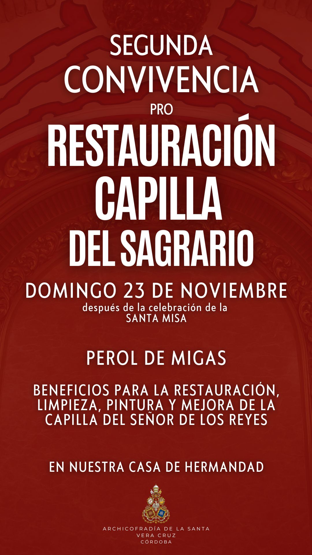 Esta Pontificia y Real Archicofradia se congratula al poder informar a hermanos y devotos que un sueño mucho tiempo anhelado por esta corporación, será una realidad el próximo día 28 de octubre. Gracias a la Fundación Marqués de Vivanco y a Don José María Horrillo López del Rey, presidente de la misma y actual marqués, la Vera-Cruz tendrá su Lignum Crucis. El ha pensado en esta humilde corporación para depositar de forma permanente Sine Die, la Sagrada y Santa Reliquia, que durante siglos pertenece a su familia, para que en nuestra casa reciba culto y veneración. Agradecer desde esta Archicofradía a Don José María y a su Fundación este gran gesto para con nosotros. Una vez que la Santa Reliquia de la Cruz de Cristo esté entre nosotros, podrá ser contemplada y venerada en la Magna Exposición 'Eterna es Su Misericordia' que organiza nuestra Archicofradía entre el 23 de octubre y el 20 de noviembre en la Santa Iglesia Catedral de Córdoba.