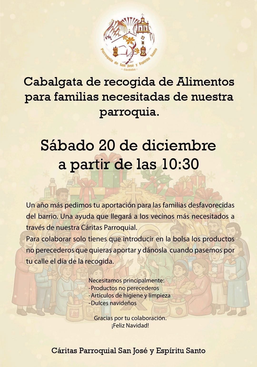 El próximo sábado recorreremos las calles de nuestra feligresía en la ya tradicional Cabalgata de Recogida de Alimentos Navideña, una iniciativa llena de solidaridad y espíritu cristiano. Durante el recorrido, recogeremos alimentos no perecederos y donativos destinados a ayudar a las familias más necesitadas atendidas por nuestra Cáritas Parroquial.