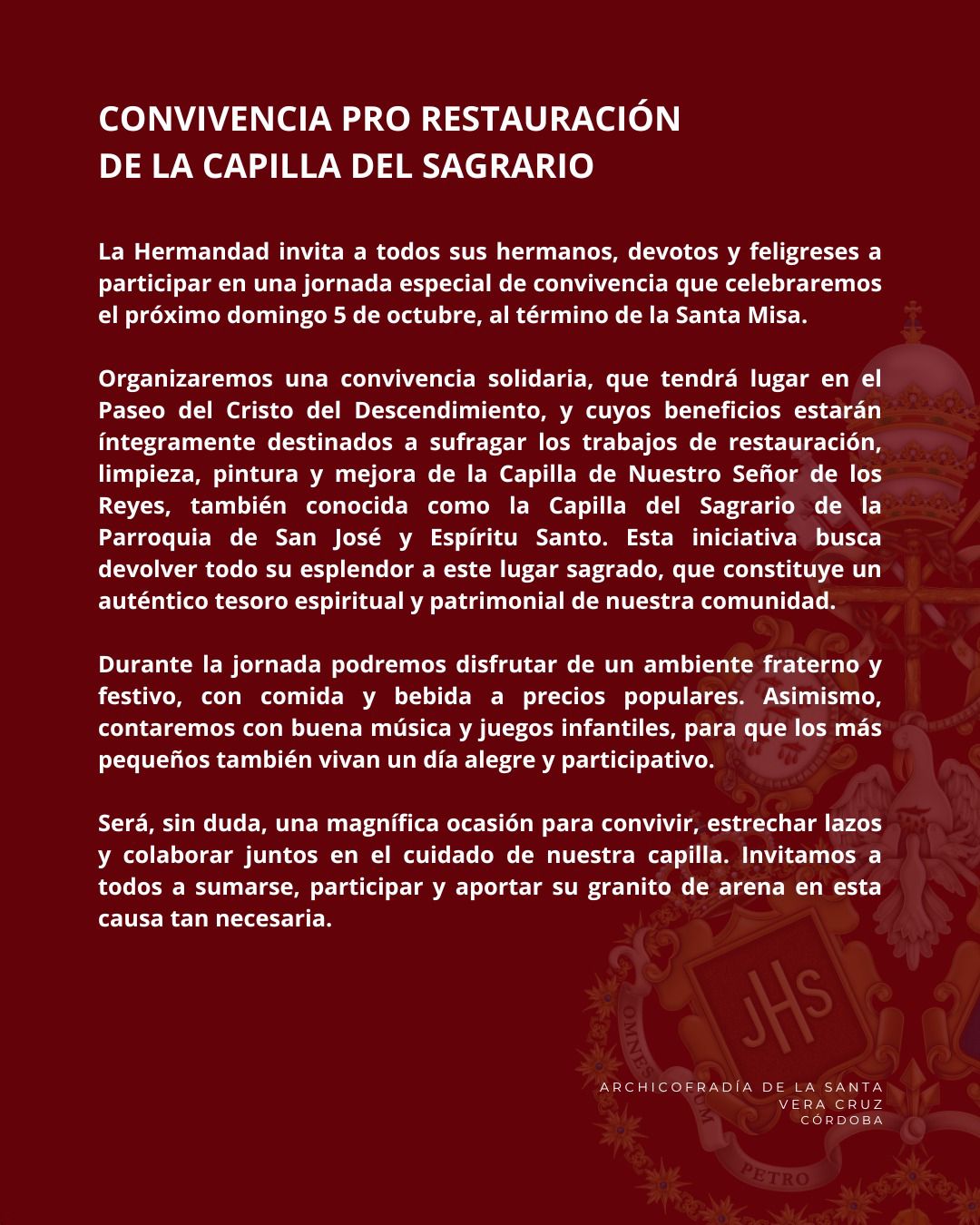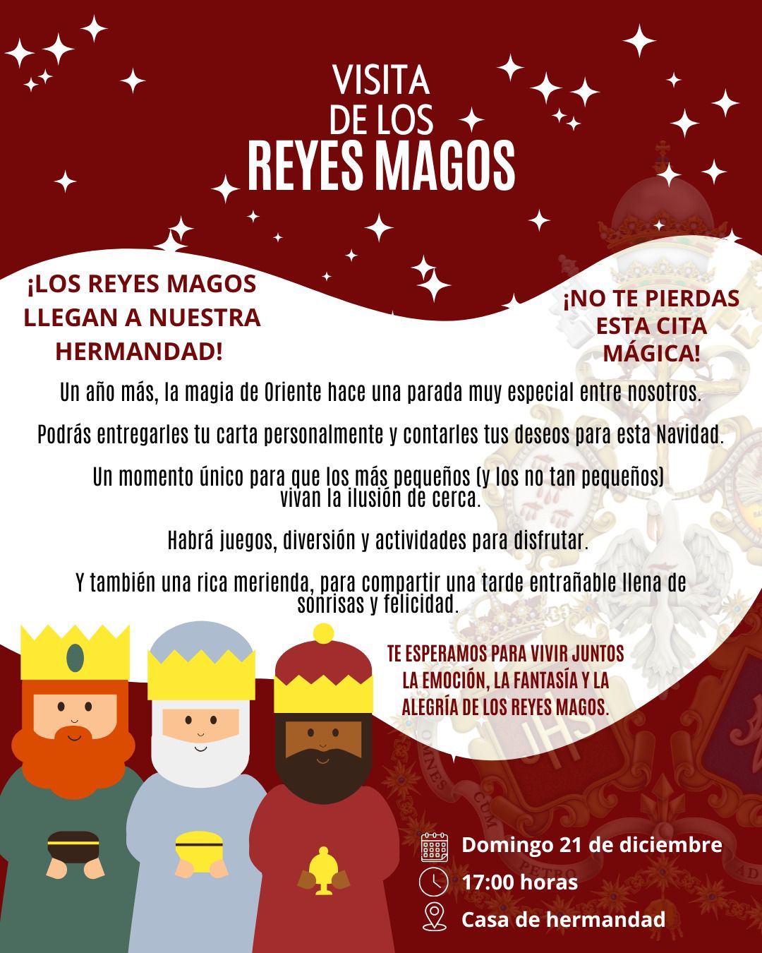 Será una ocasión especial para convivir, disfrutar del espíritu navideño y fortalecer los lazos de nuestra hermandad, viviendo juntos una tarde cargada de magia, ilusión y esperanza. Os esperamos para celebrar la Navidad como se merece, en compañía y con el corazón abierto a la alegría de estas fechas. 🎄✨