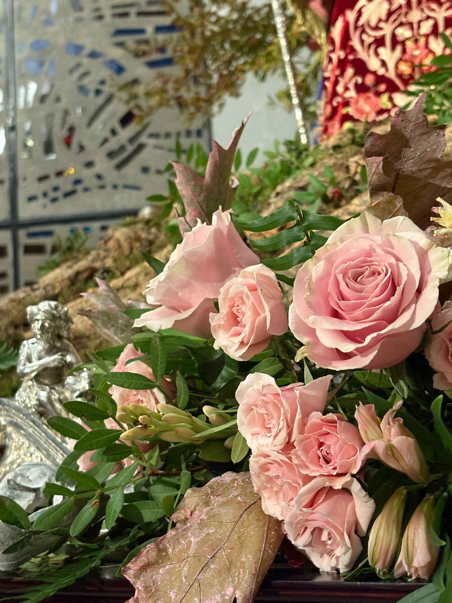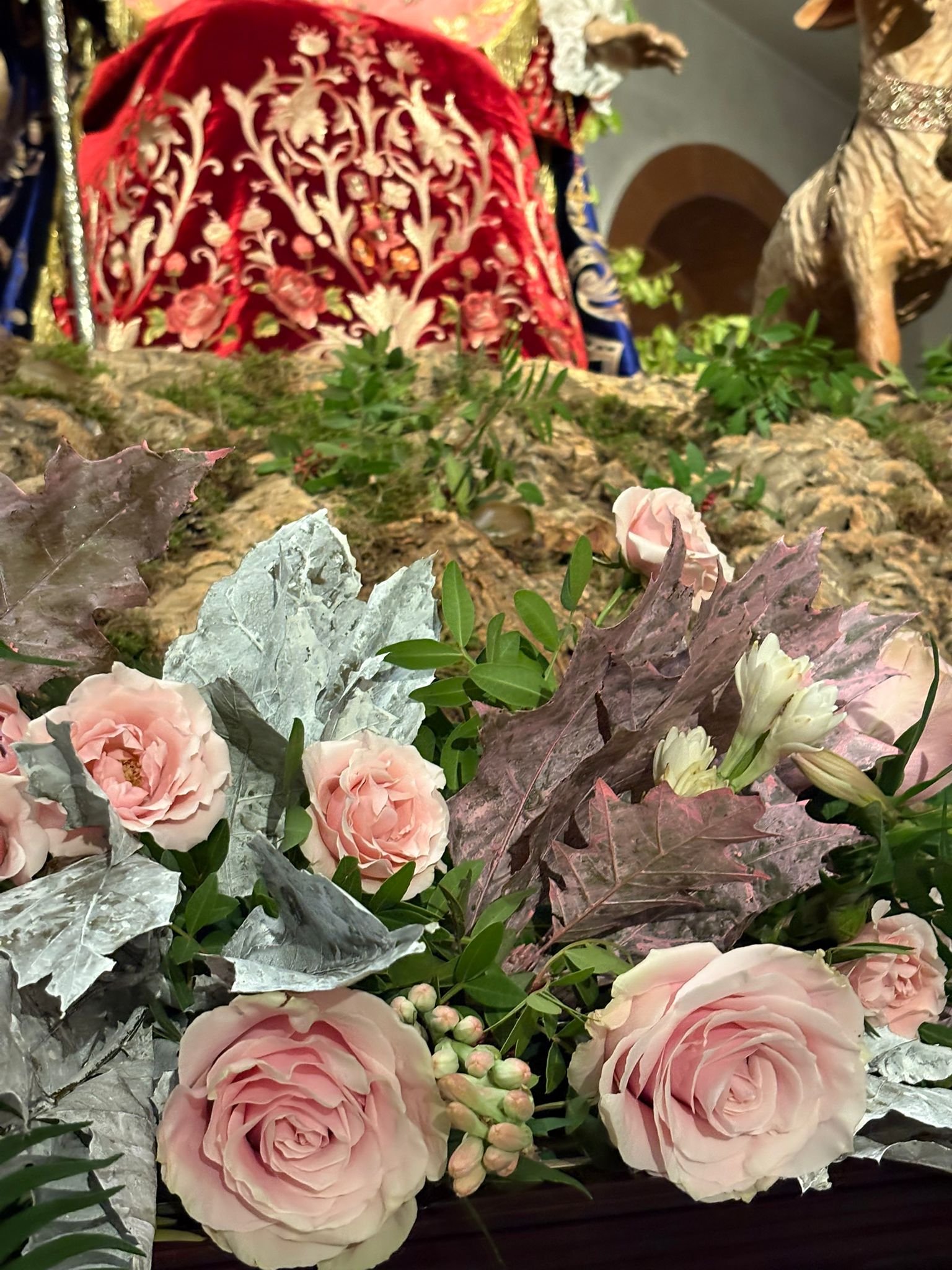 La composición floral que enmarca este conjunto se ha realizado con lentisco natural y lentisco teñido en tonos dorados y rojos, eucalipto burdeos, algodón, hojas de roble en distintas tonalidades, ramas de acebo y limonium de variados colores, creando una armonía cromática que realza el carácter litúrgico y festivo propio de estas fechas.