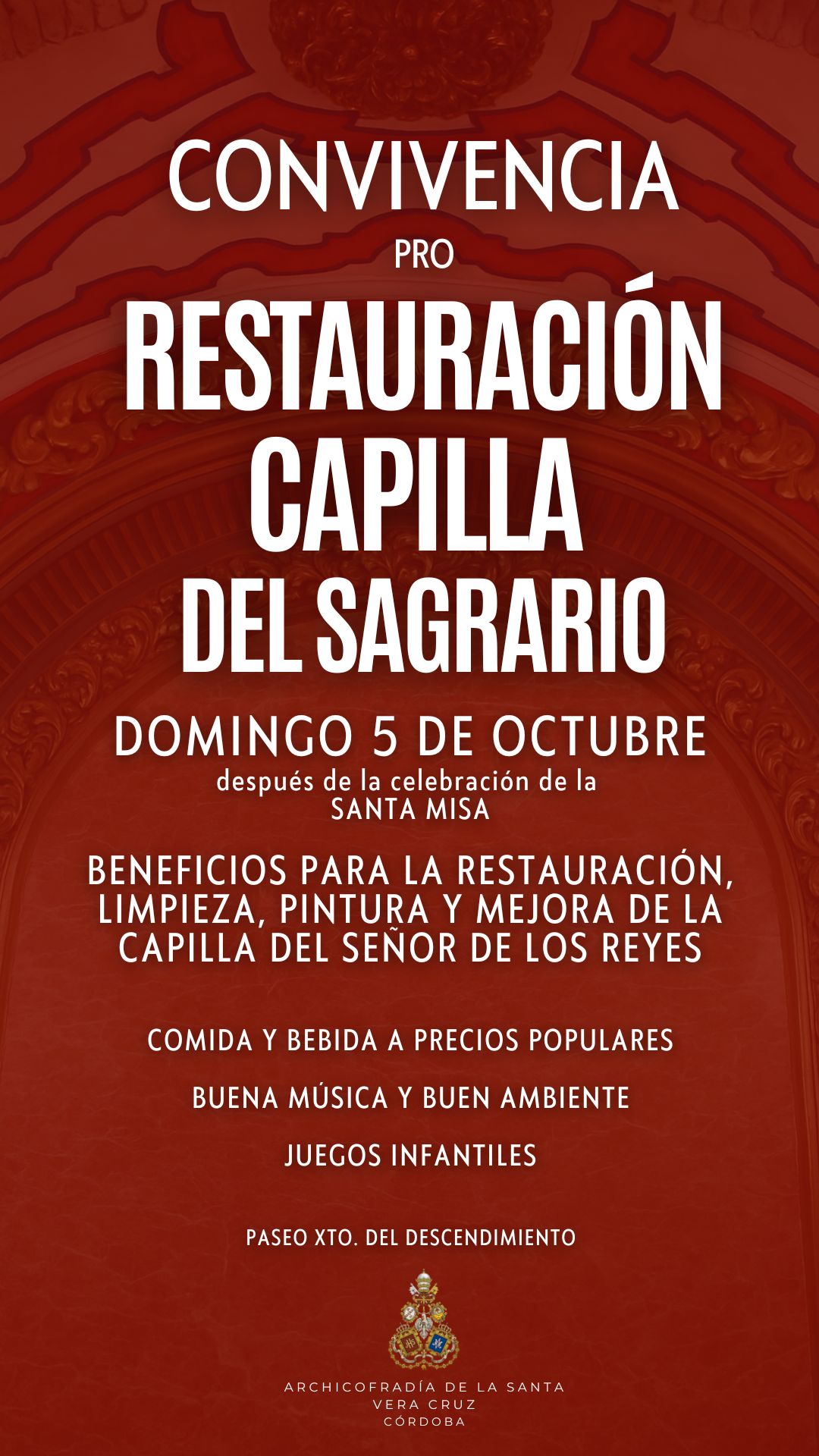 Este domingo, dia 23 de Octubre, celebraremos la Santa Misa en la Santa Iglesia Catedral de Córdoba. Comenzará a las 12 de la mañana y al término será inaugurada oficialmente la Exposición 'Eterna es Su Misericordia: la Vera-Cruz en la Diócesis de Córdoba', en la que como ya hemos informado se podrán contemplar y venerar Imágenes Titulares de las hermandades de la Vera-Cruz de nuestra provincia incluyendo la de nuestra Archicofradía. La Exposición se encuentra ubicada en las naves de la Mezquita-Catedral, en la zona de ampliación de Almanzor. Por lo tanto la entrada a la misma coincide con la entrada de visitantes al monumento. Habrá que acudir a taquilla a retirar una entrada, recordando que para los nacidos o con residencia en Córdoba, es gratuita. La muestra podrá ser visitada hasta el domingo 20 de noviembre.