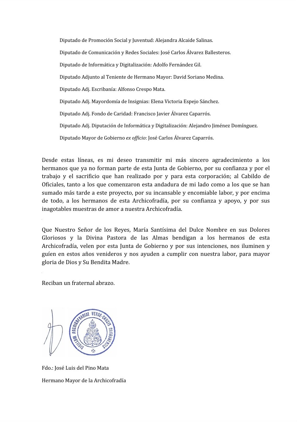 Pedimos al Señor de los Reyes que continúe colmándolo de gracia en su caminar, y que su profunda y sincera devoción a María Santísima del Dulce Nombre siga siendo faro y guía en su ministerio y en su vida, bajo su amparo y bendición.