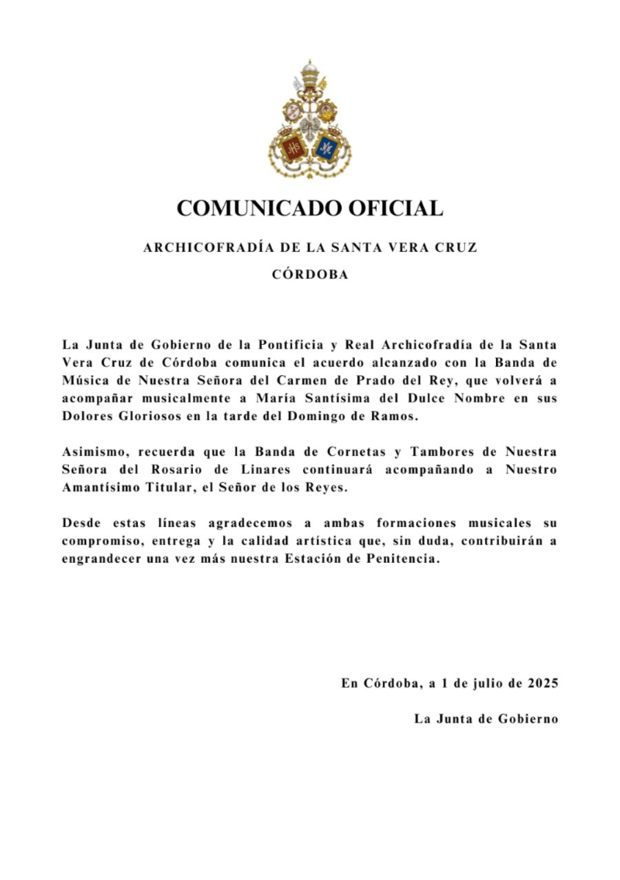 El acompañamiento musical correrá a cargo de la banda de música María Santísima de la Esperanza de Córdoba.