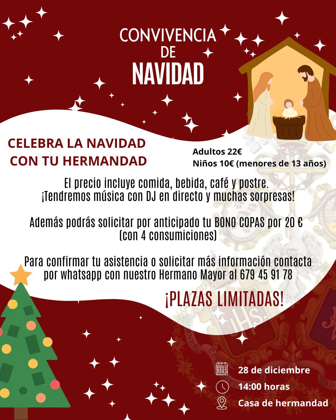 ¡Celebra la Navidad con tu hermandad! 🎄✨.Vuelve nuestra convivencia de Navidad; comida, bebida, música y el mejor ambiente navideño. Reserva tu plaza contactando al 679 45 91 78.