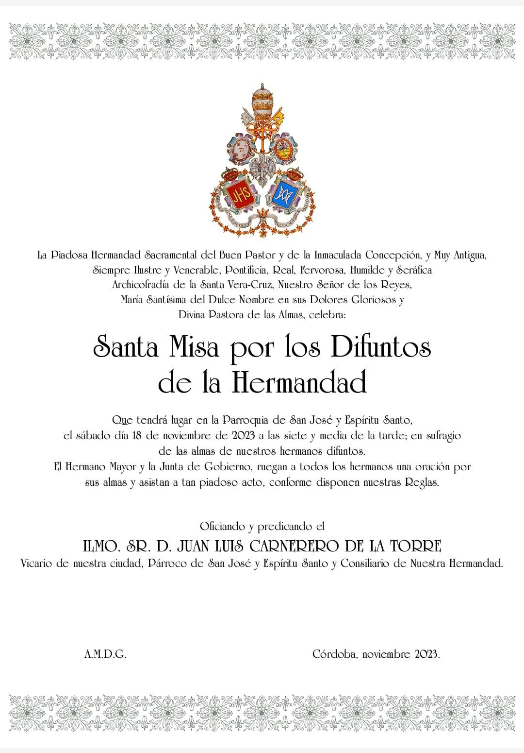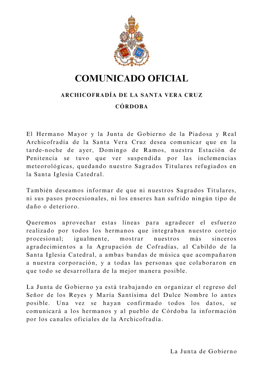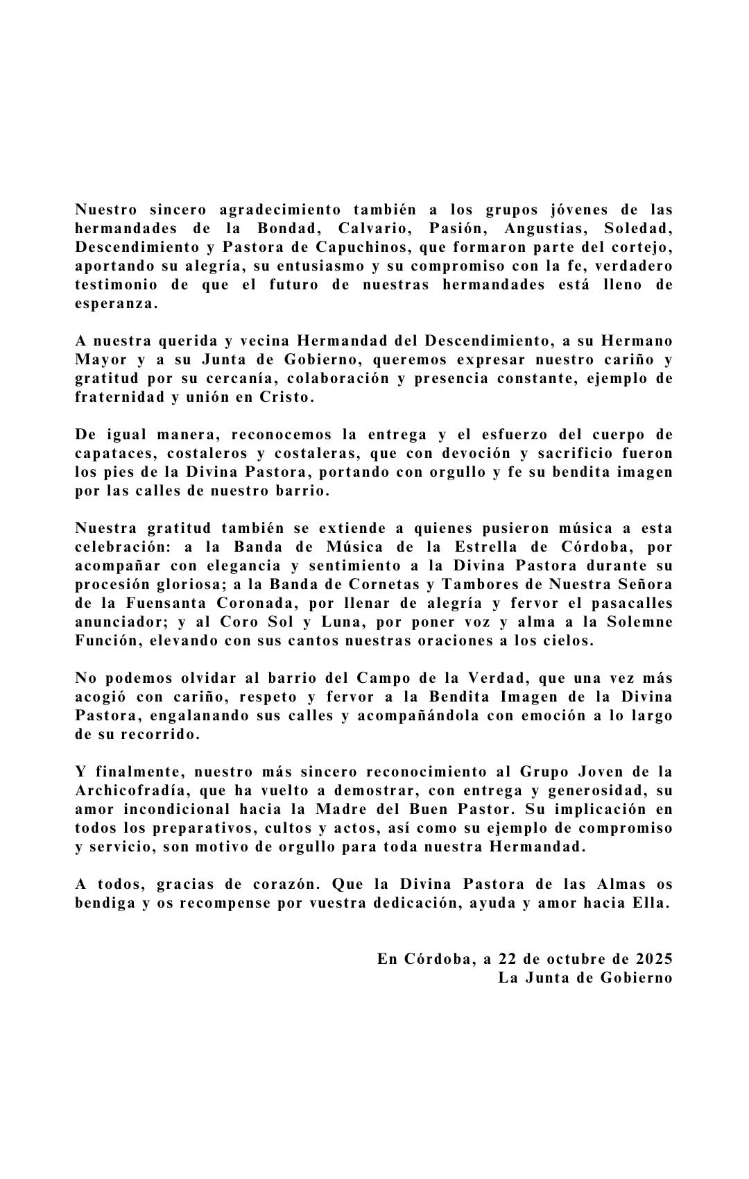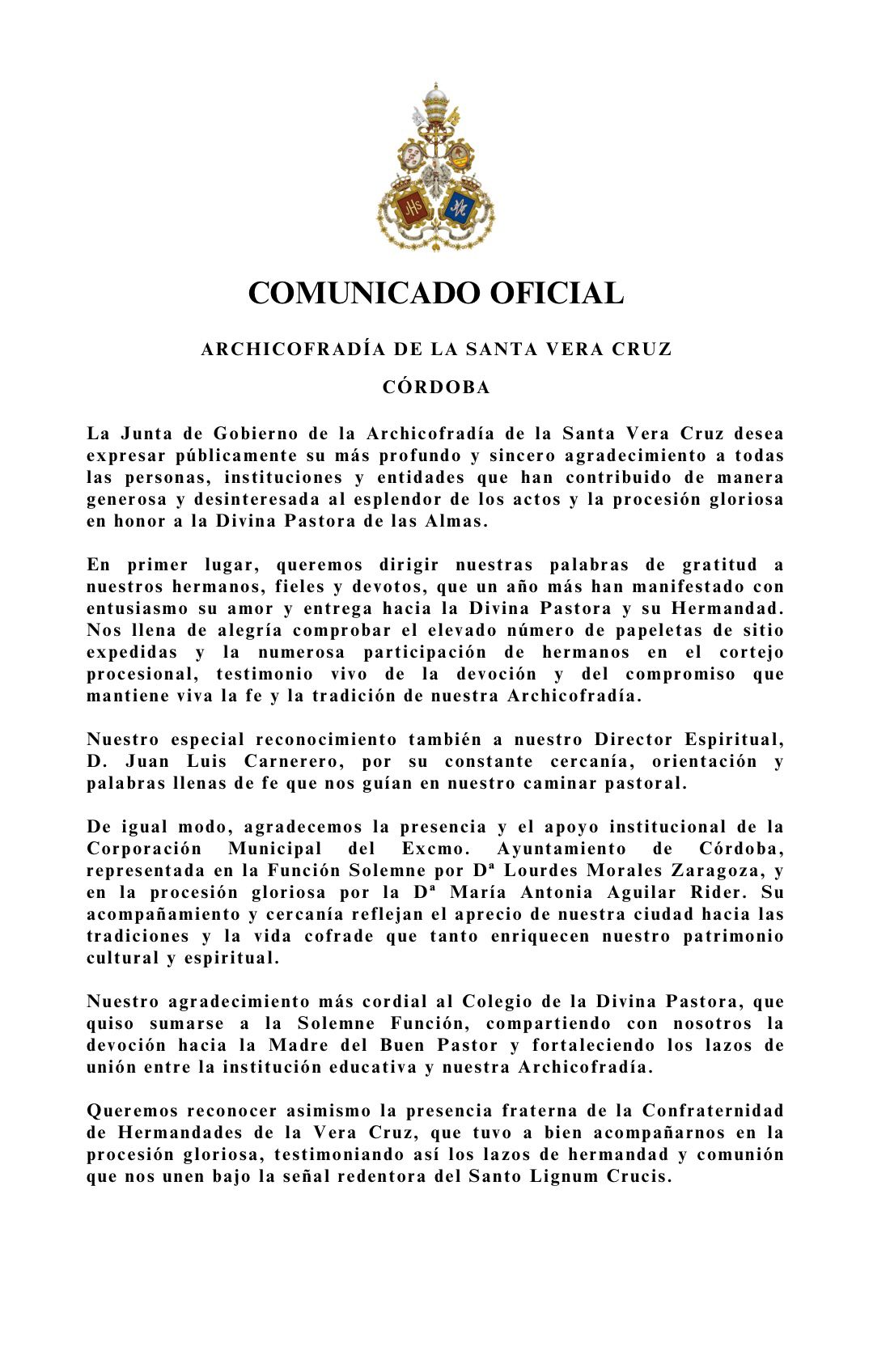 Desde esta Junta de Gobierno queremos agradecer la colaboración y apoyo de nuestro Obispo, el Excmo. y Rvdmo. Señor Don Demetrio Fernández González, al Cabildo Catedral y su Deán Ilustre Sr. Don Manuel Pérez Moya y a nuestro Director Espiritual y Delegado Diocesano de Hermandades y Cofradías de Córdoba, el Ilustre Sr. Don Pedro Soldado Barrios.