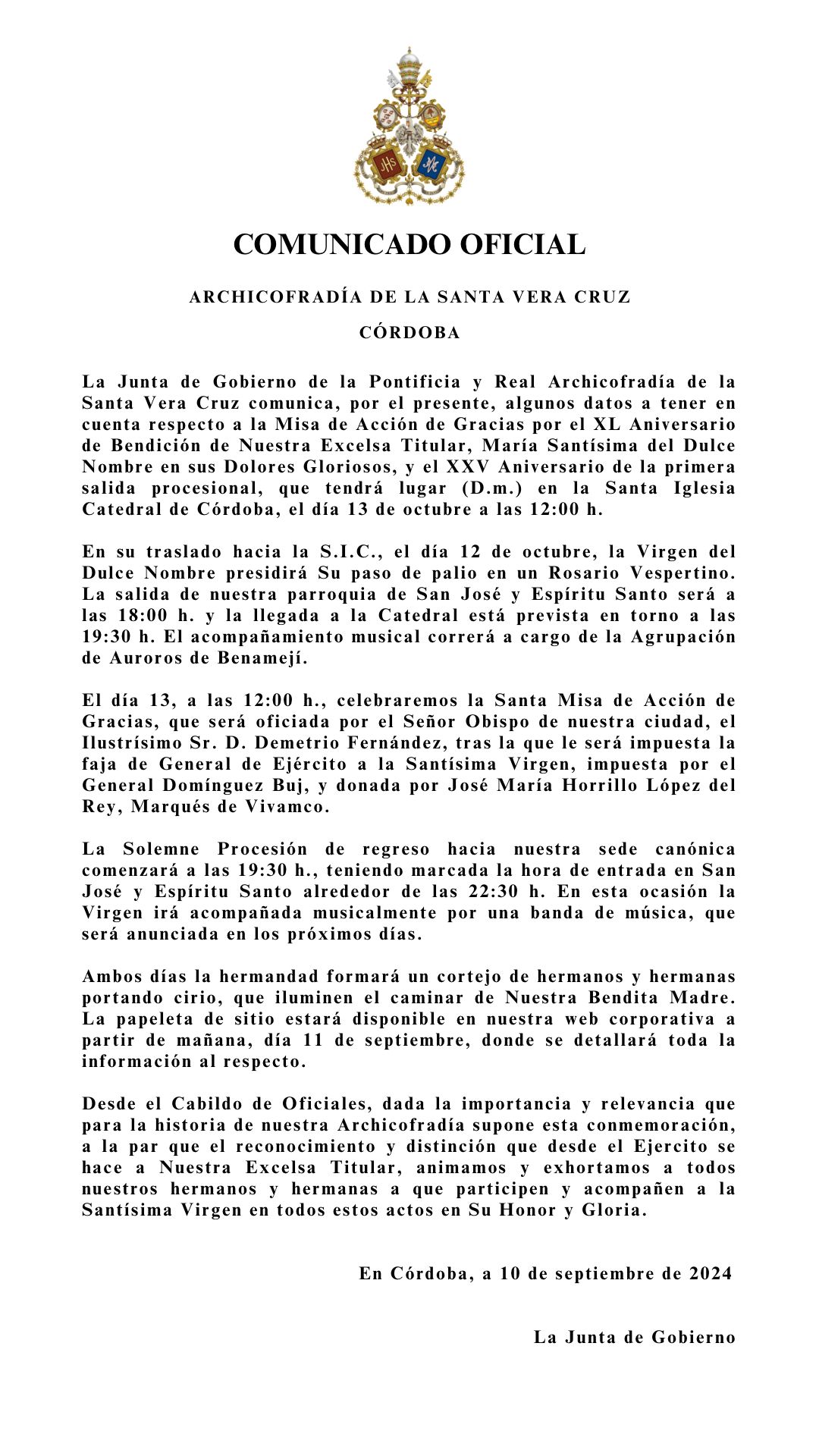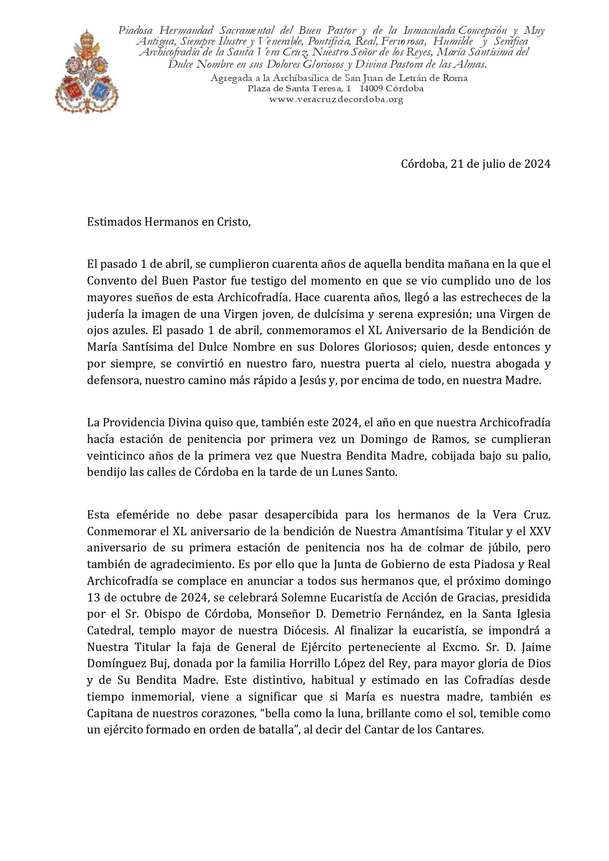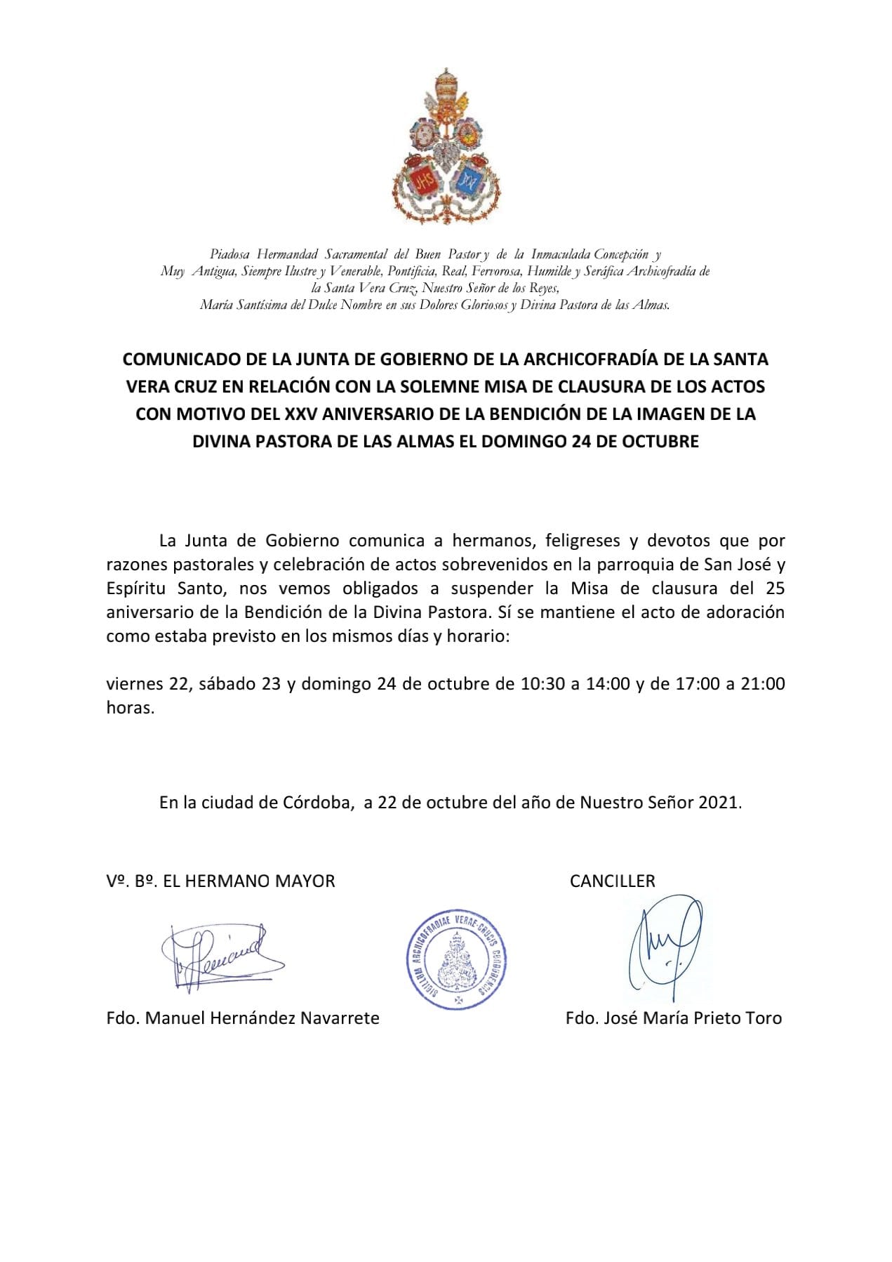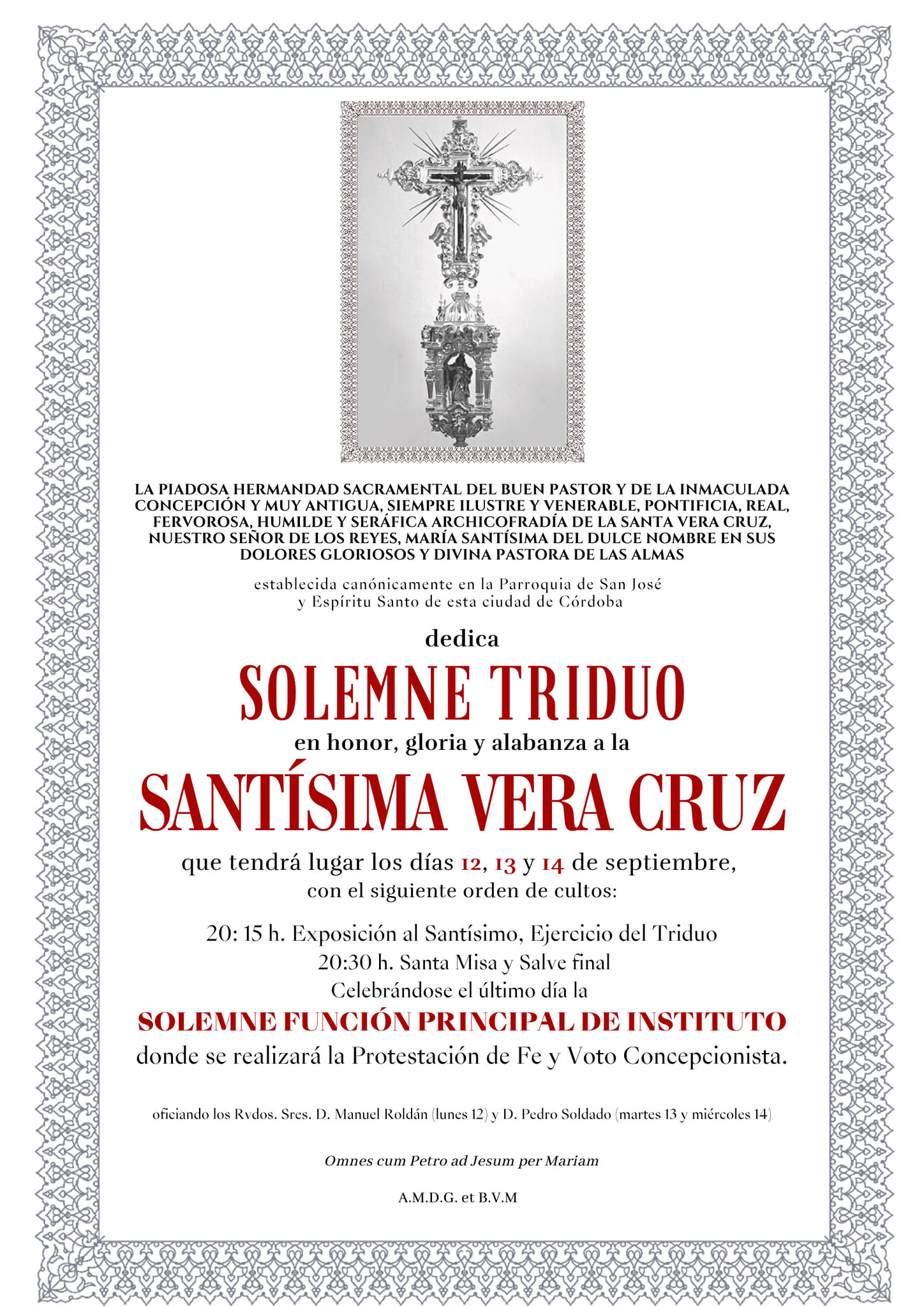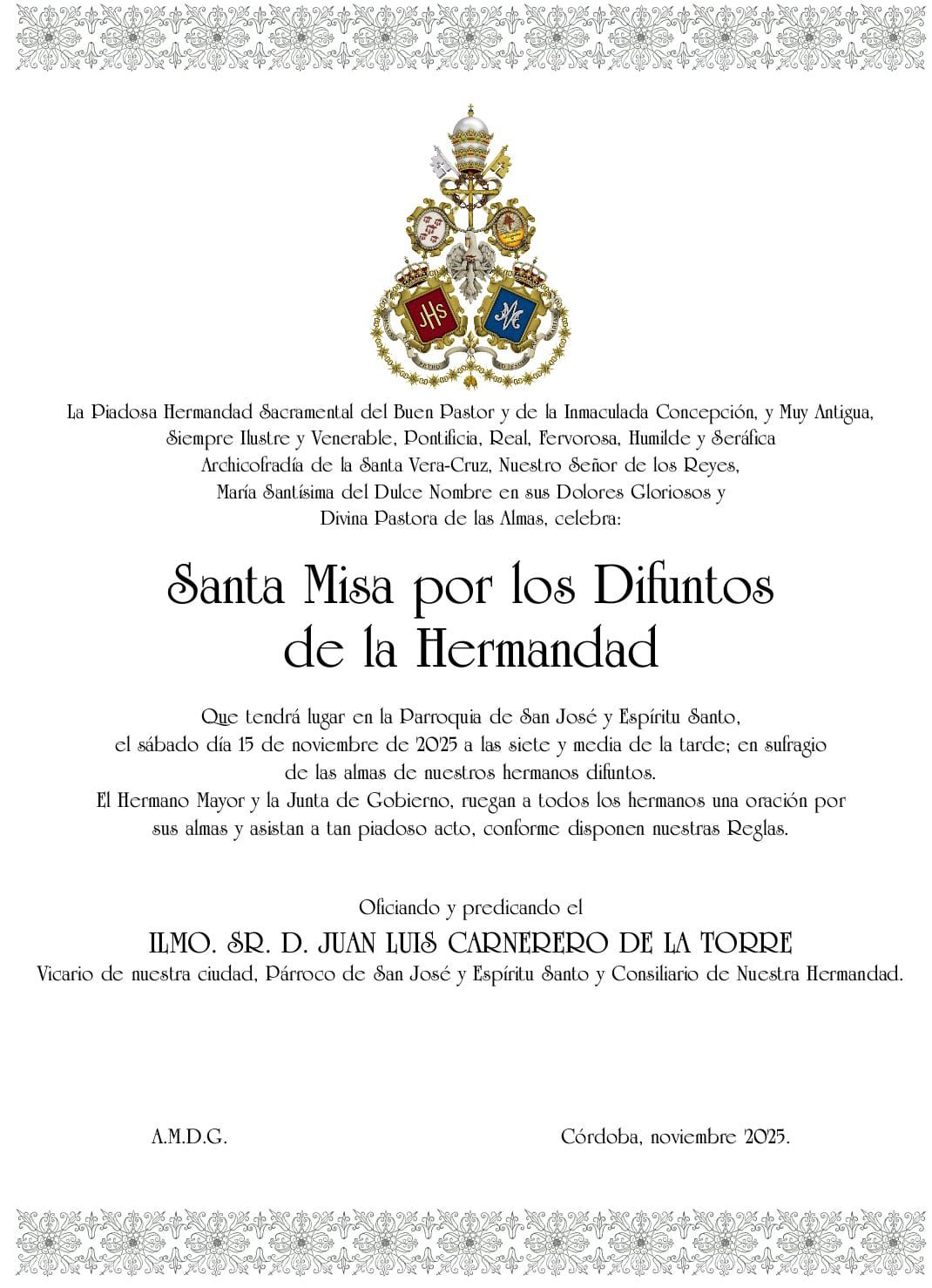 Desde esta Junta de Gobierno queremos agradecer la colaboración y apoyo de nuestro Obispo, el Excmo. y Rvdmo. Señor Don Demetrio Fernández González, al Cabildo Catedral y su Deán Ilustre Sr. Don Manuel Pérez Moya y a nuestro Director Espiritual y Delegado Diocesano de Hermandades y Cofradías de Córdoba, el Ilustre Sr. Don Pedro Soldado Barrios.