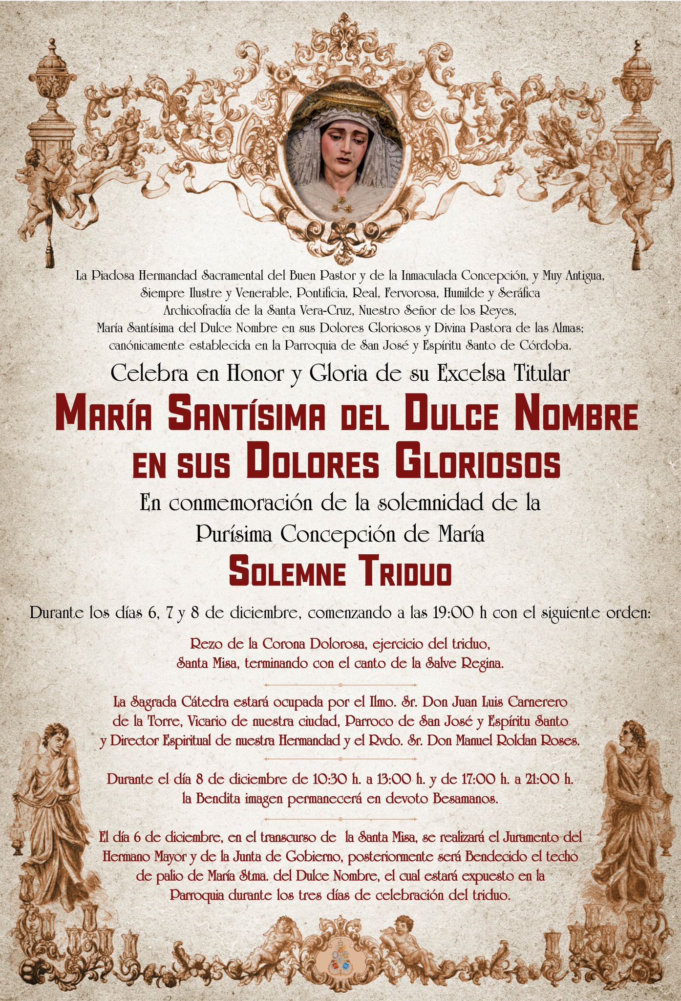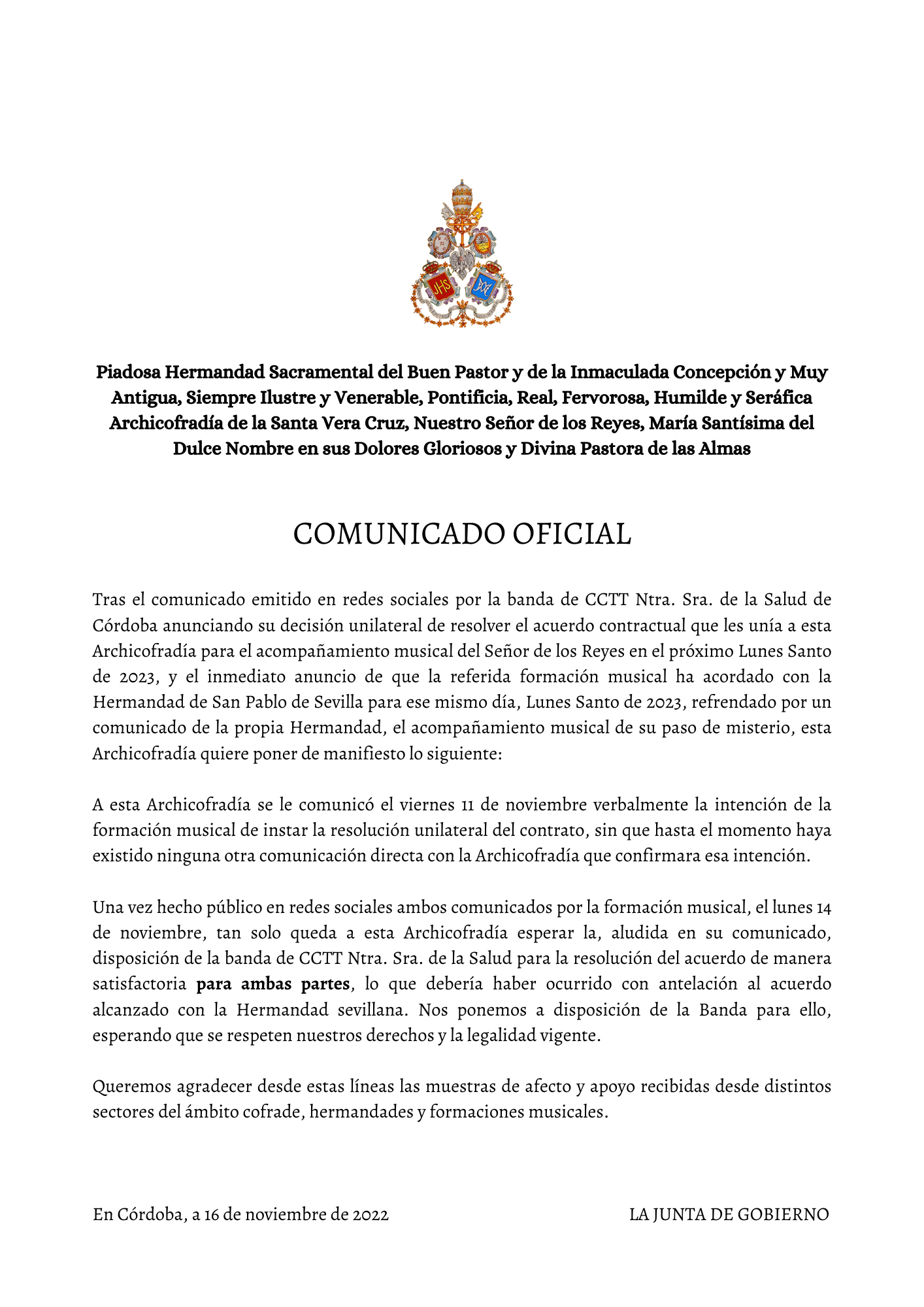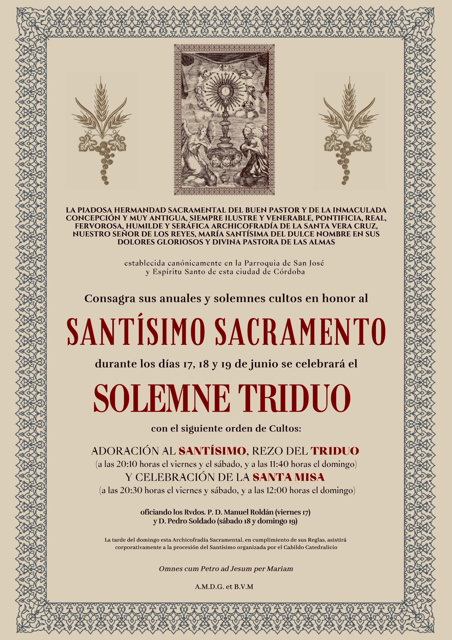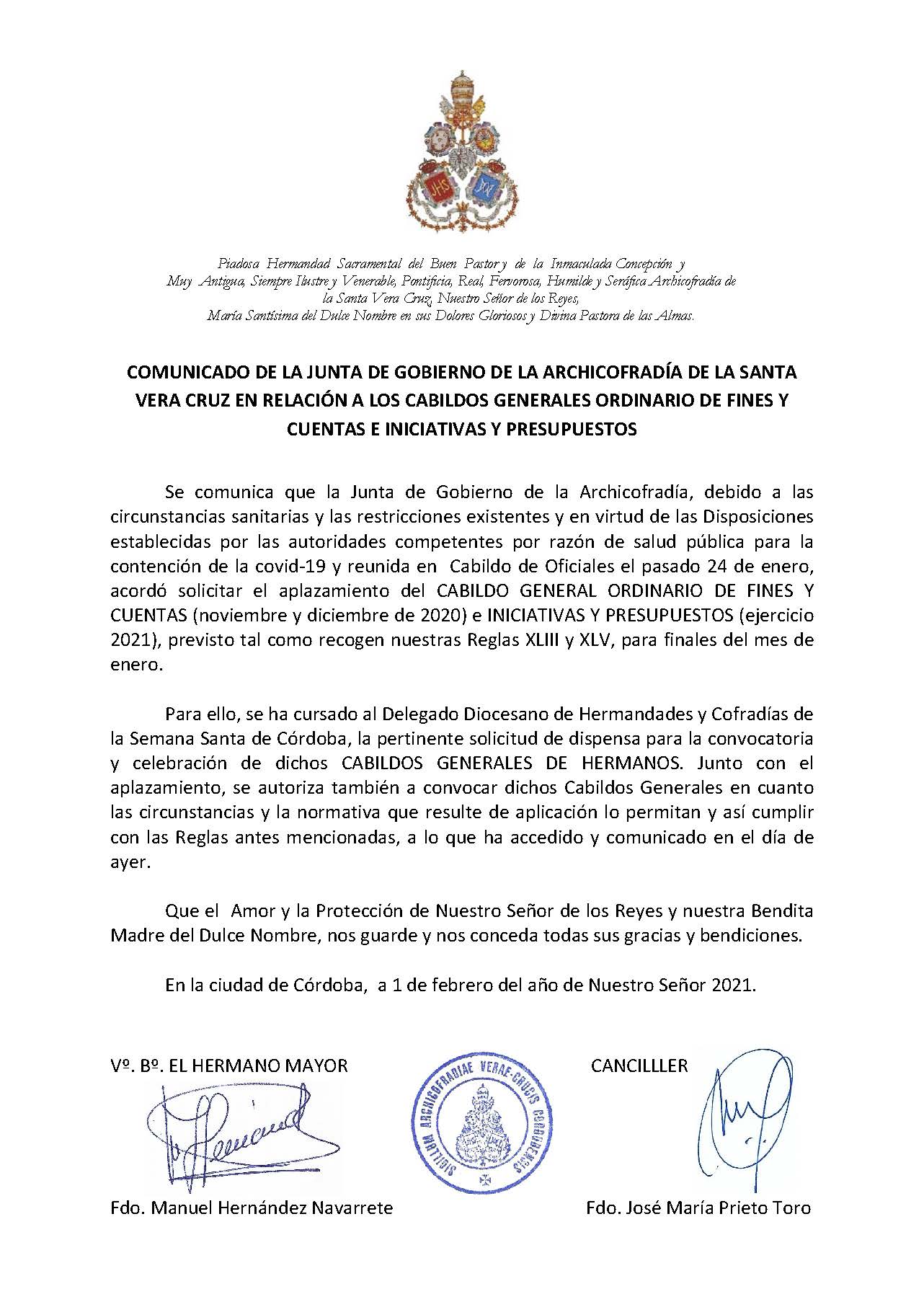Desde esta Junta de Gobierno queremos agradecer la colaboración y apoyo de nuestro Obispo, el Excmo. y Rvdmo. Señor Don Demetrio Fernández González, al Cabildo Catedral y su Deán Ilustre Sr. Don Manuel Pérez Moya y a nuestro Director Espiritual y Delegado Diocesano de Hermandades y Cofradías de Córdoba, el Ilustre Sr. Don Pedro Soldado Barrios.