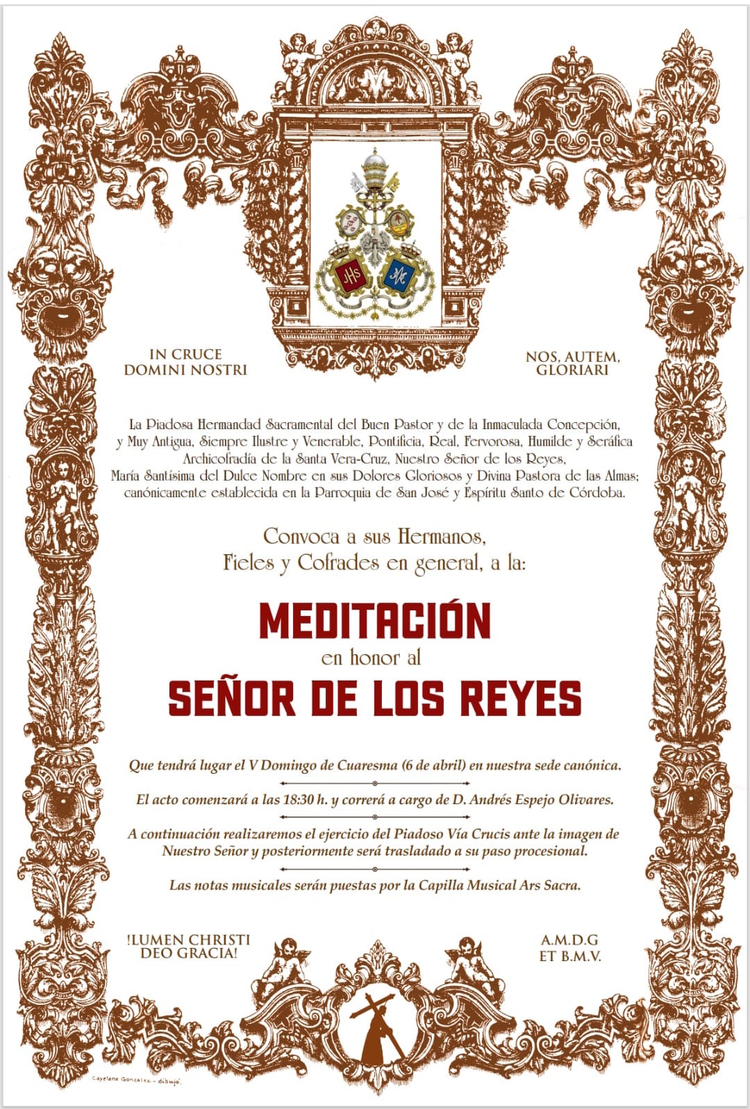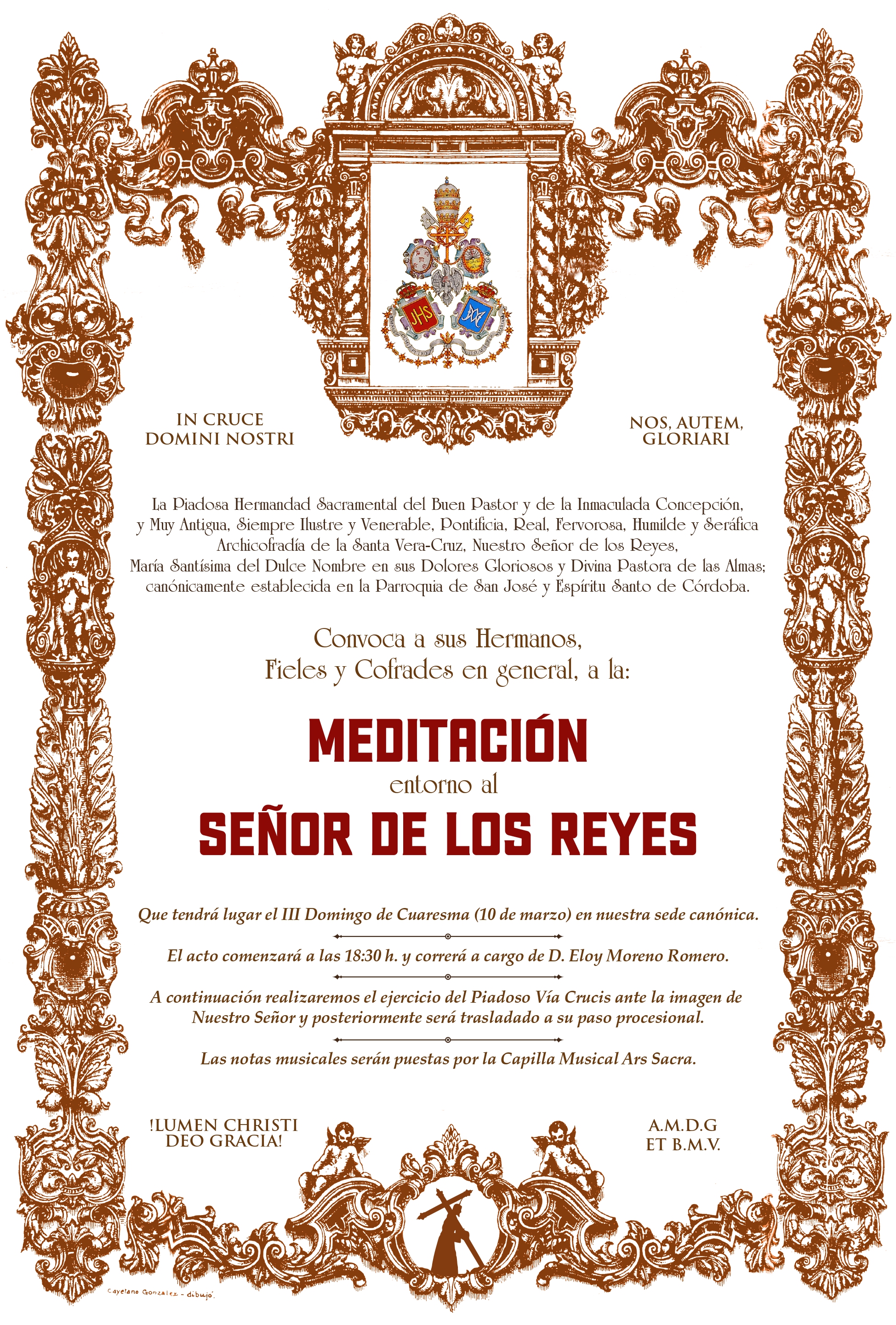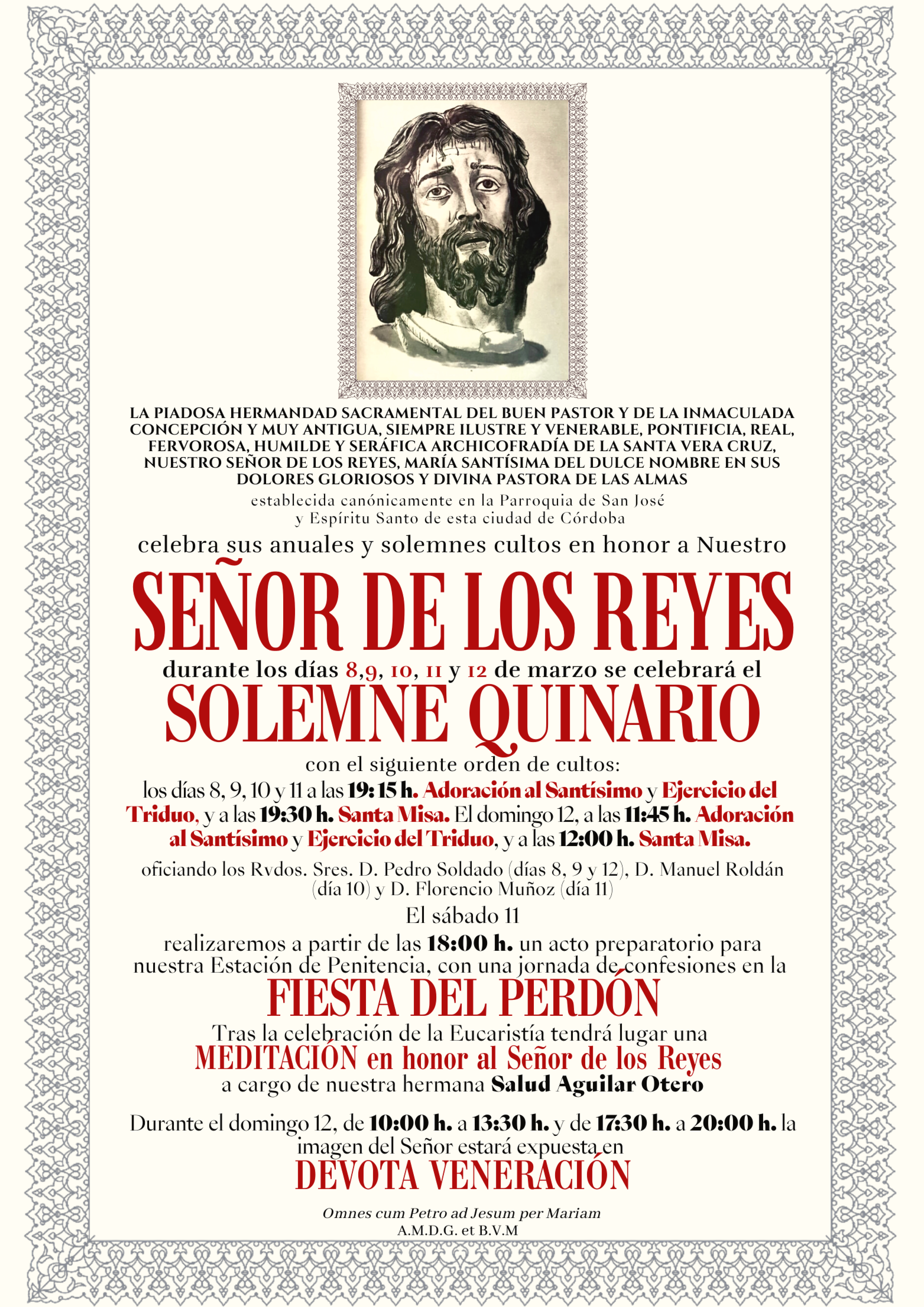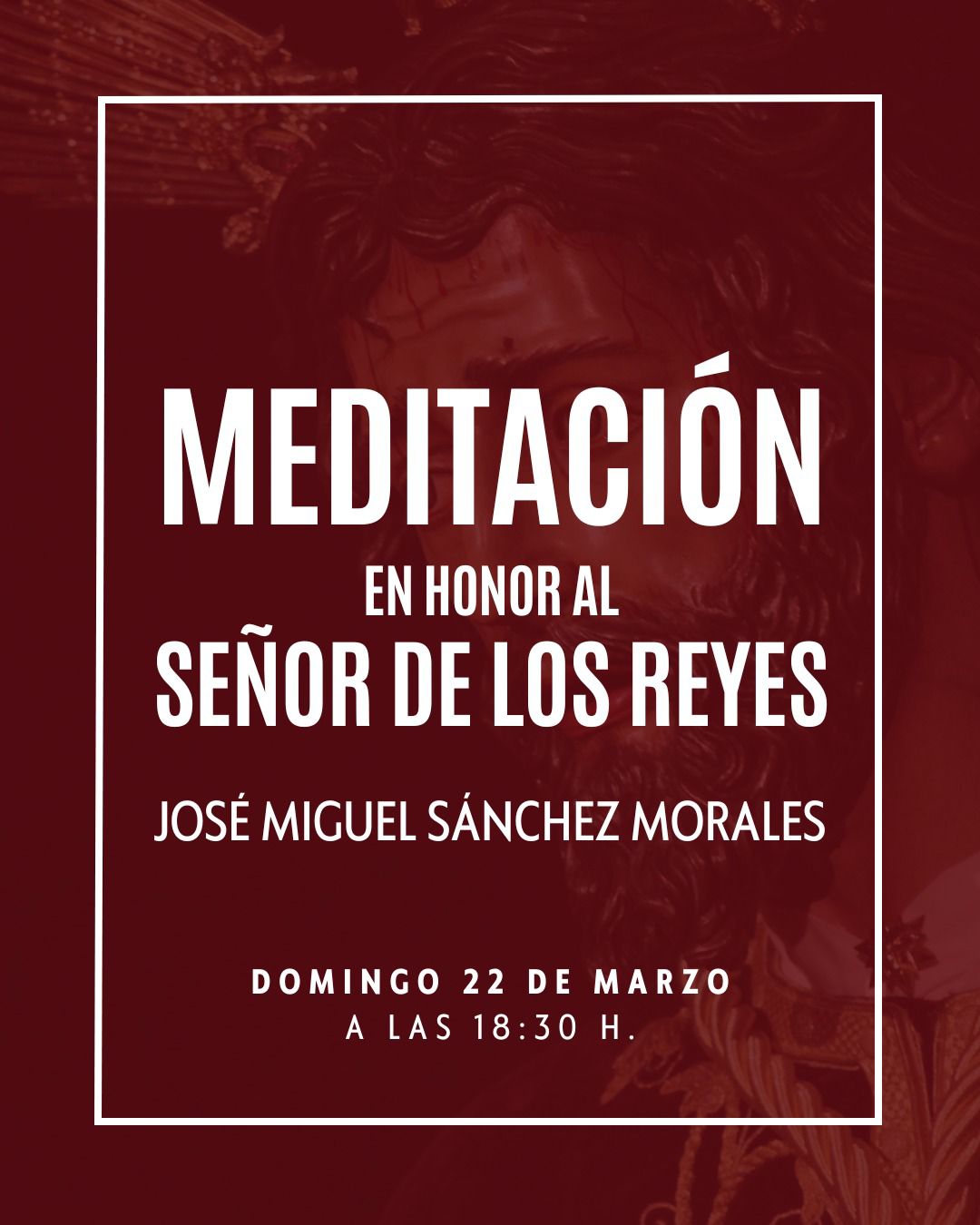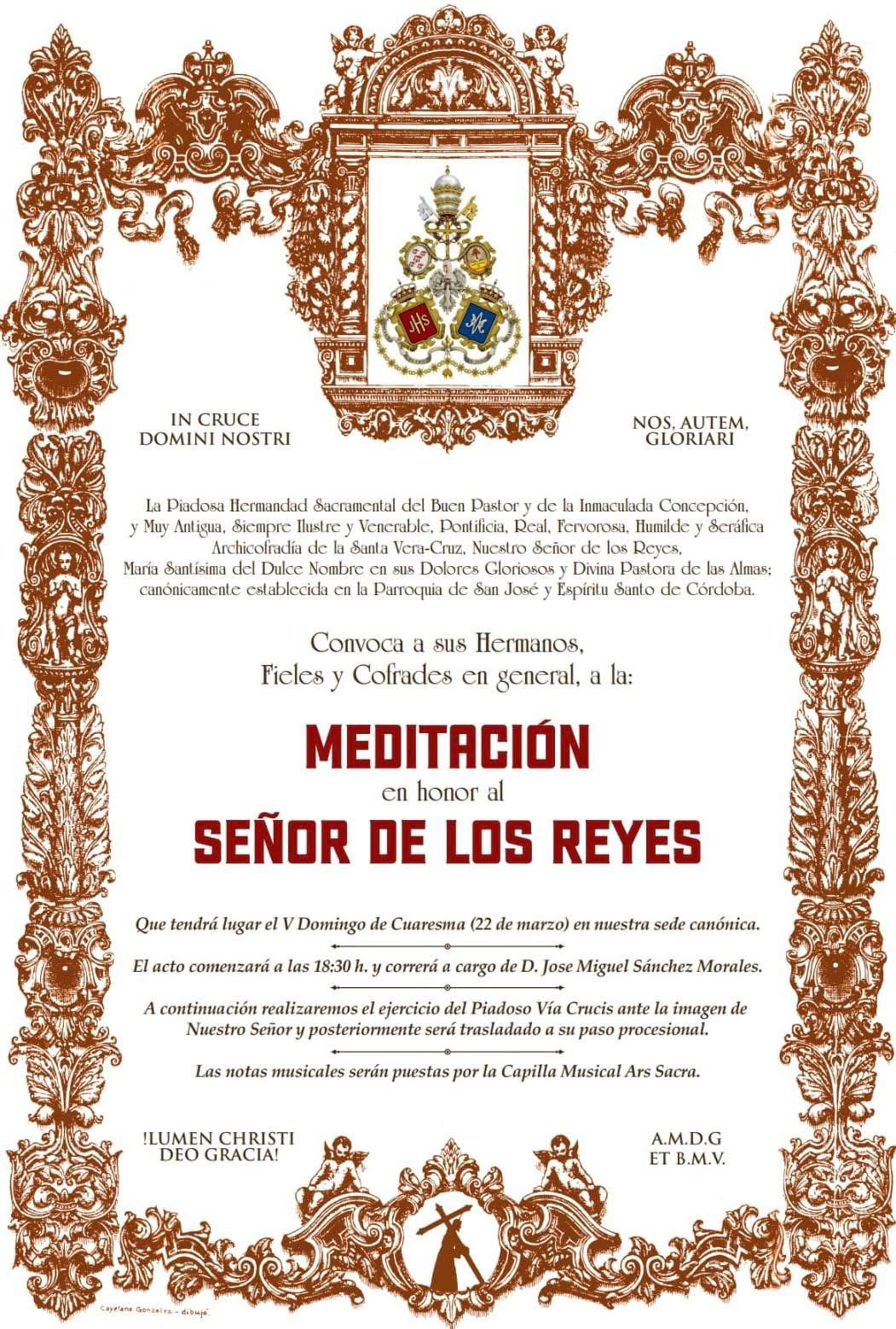 La Solemne Meditación al Señor de los Reyes tendrá lugar el domingo 22 de marzo, a las 18:30 horas, en nuestra sede canónica, a la que quedan invitados todos los hermanos, fieles y devotos que deseen acompañarnos en este acto de recogimiento y reflexión.