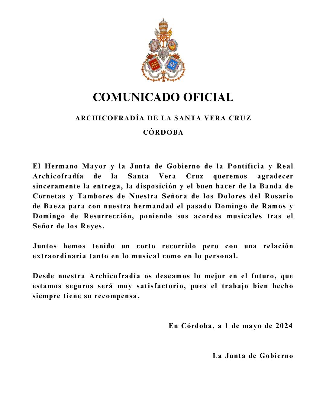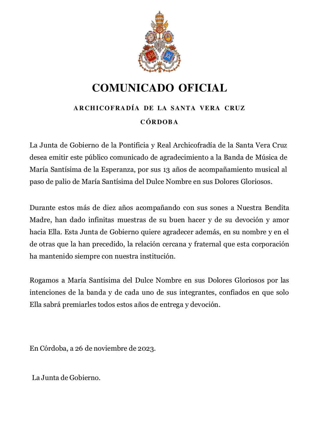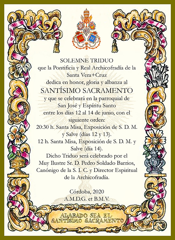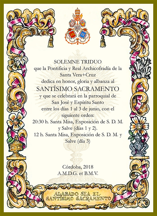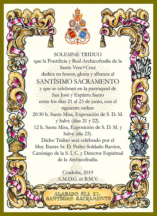Expresar el más grande de los agradecimientos posibles desde esta Archicofradía a don José María Horrillo, Marqués de Vivanco, por pensar en esta Humilde Hermandad de la Vera-Cruz de Córdoba a fin de que la Santa Reliquia del Lignum Crucis que pertenece desde el siglo XVII a su familia, sea venerada por los fieles que tenemos como símbolo universal del Cristianismo y de la Iglesia, a la Santa Cruz de Cristo.