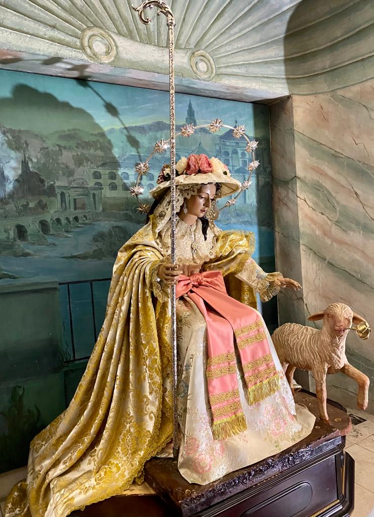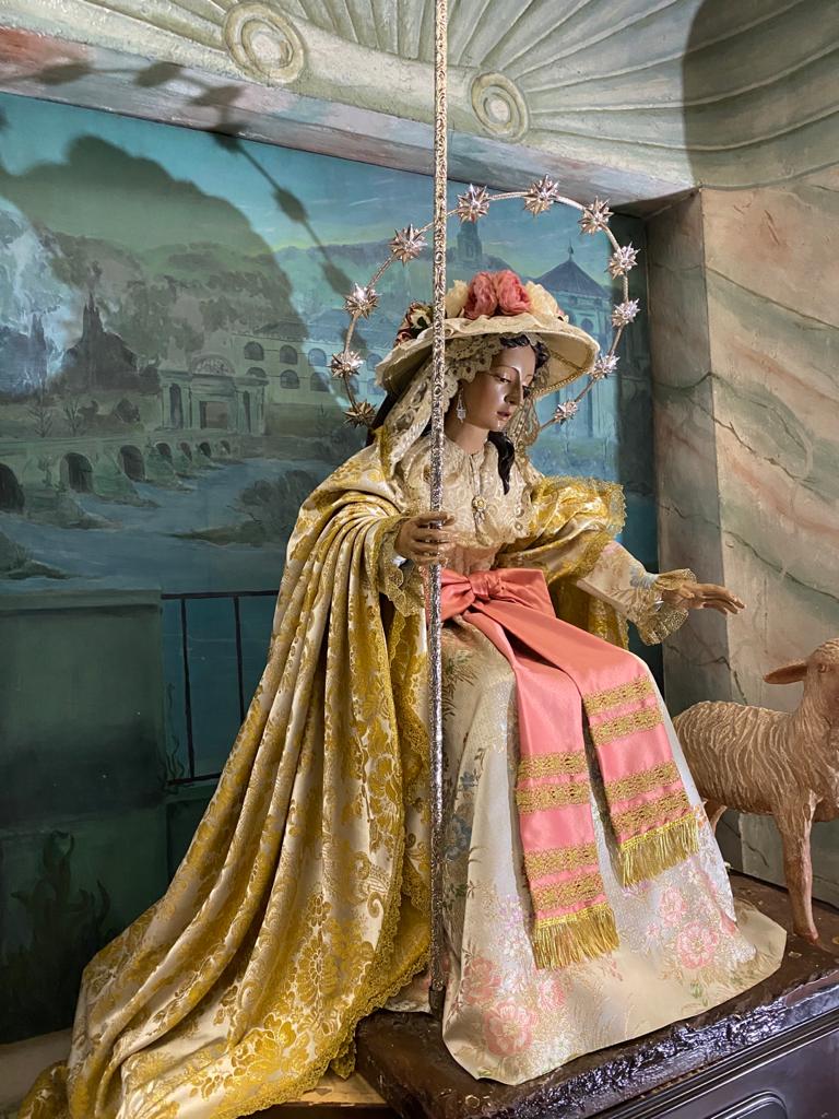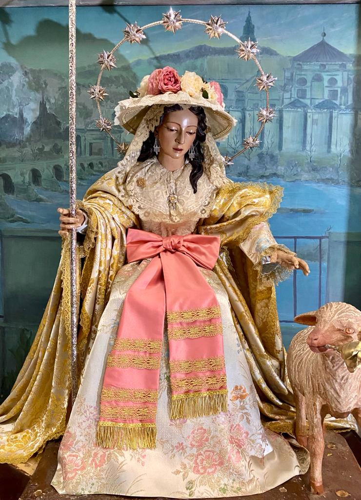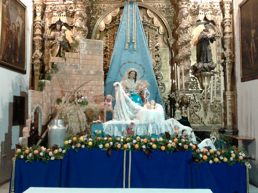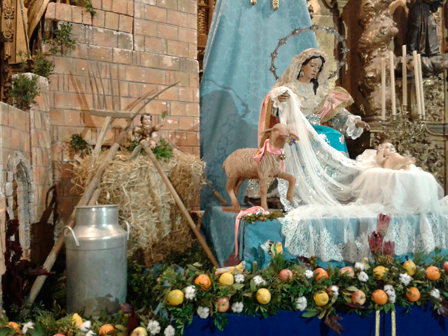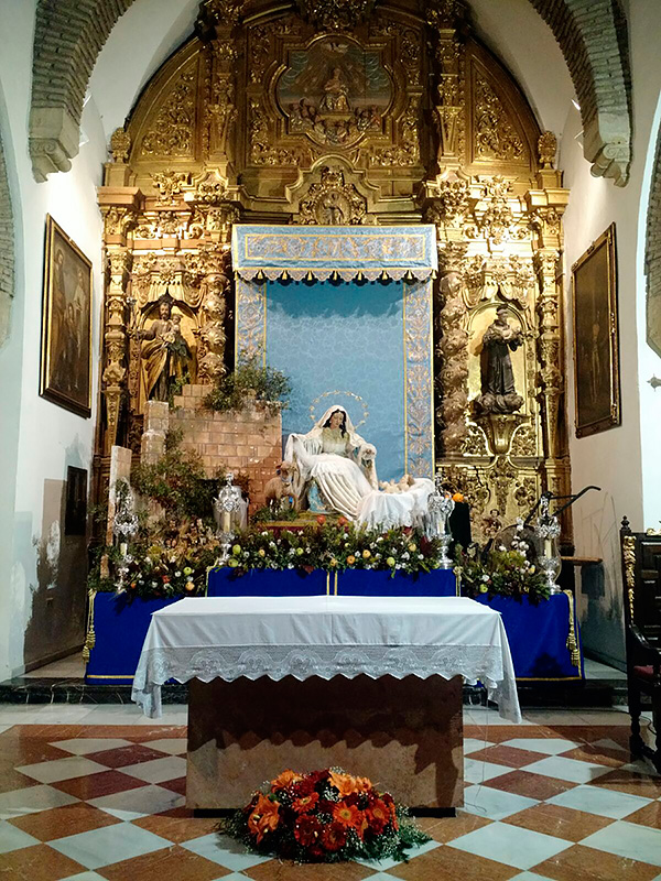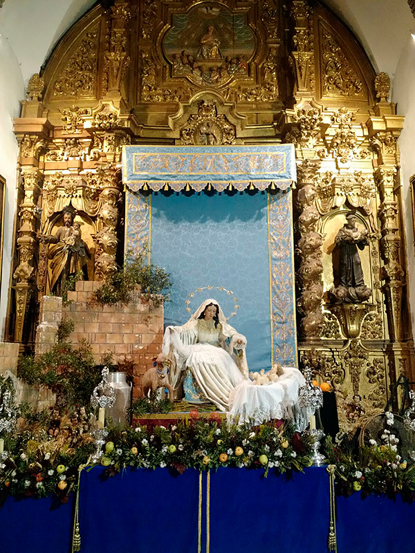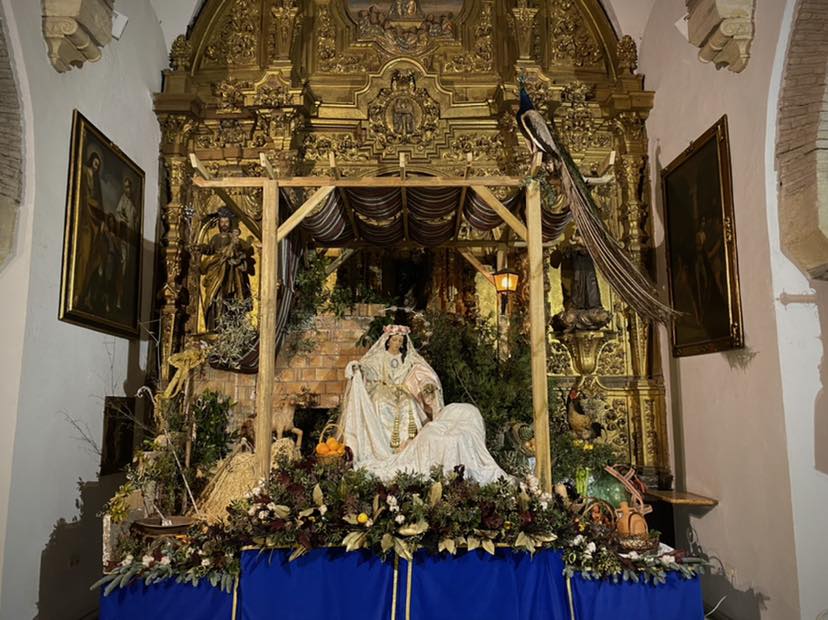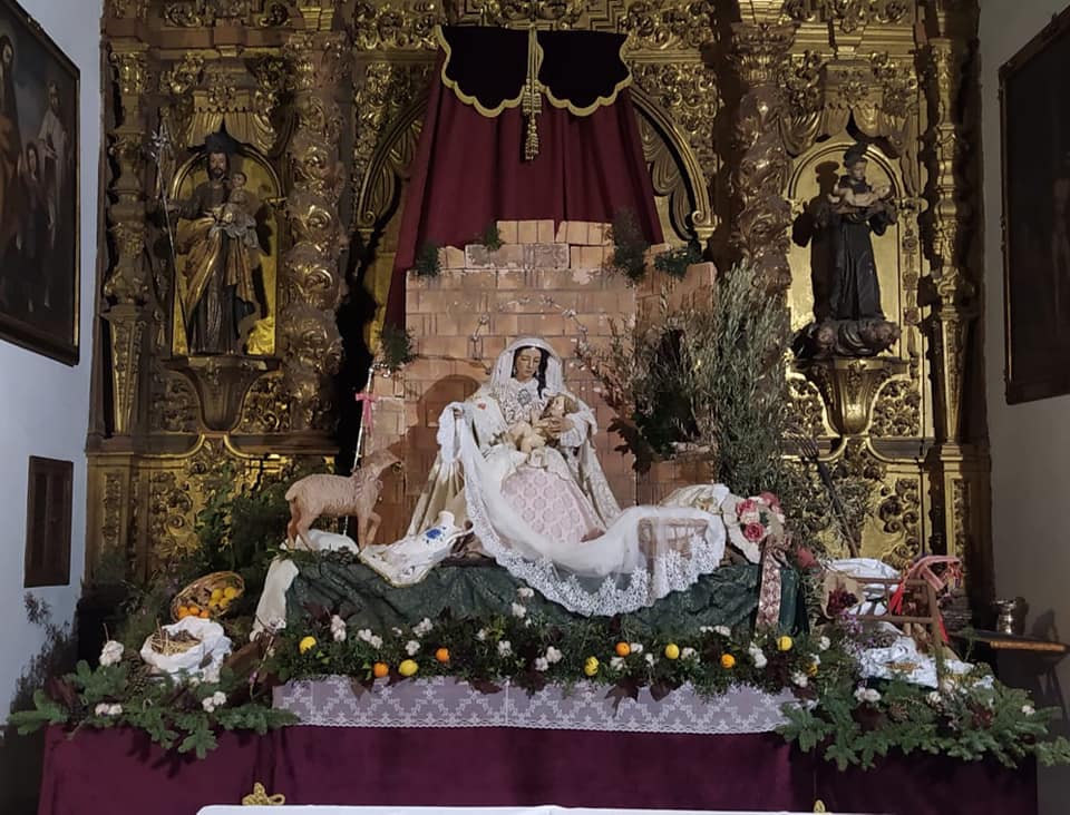 Un año más, la Divina Pastora preside el altar mayor de la parroquia, recreando con delicadeza y solemnidad el portal de Belén, acompañada por San José y aguardando con esperanza el Nacimiento de Nuestro Señor Jesucristo. Ambas imágenes se disponen bajo un cobertizo de madera, evocador de la sencillez del pesebre, y aparecen rodeadas de aperos de labranza y cestas con frutos, símbolos del trabajo humilde y de los dones de la tierra ofrecidos al Redentor.