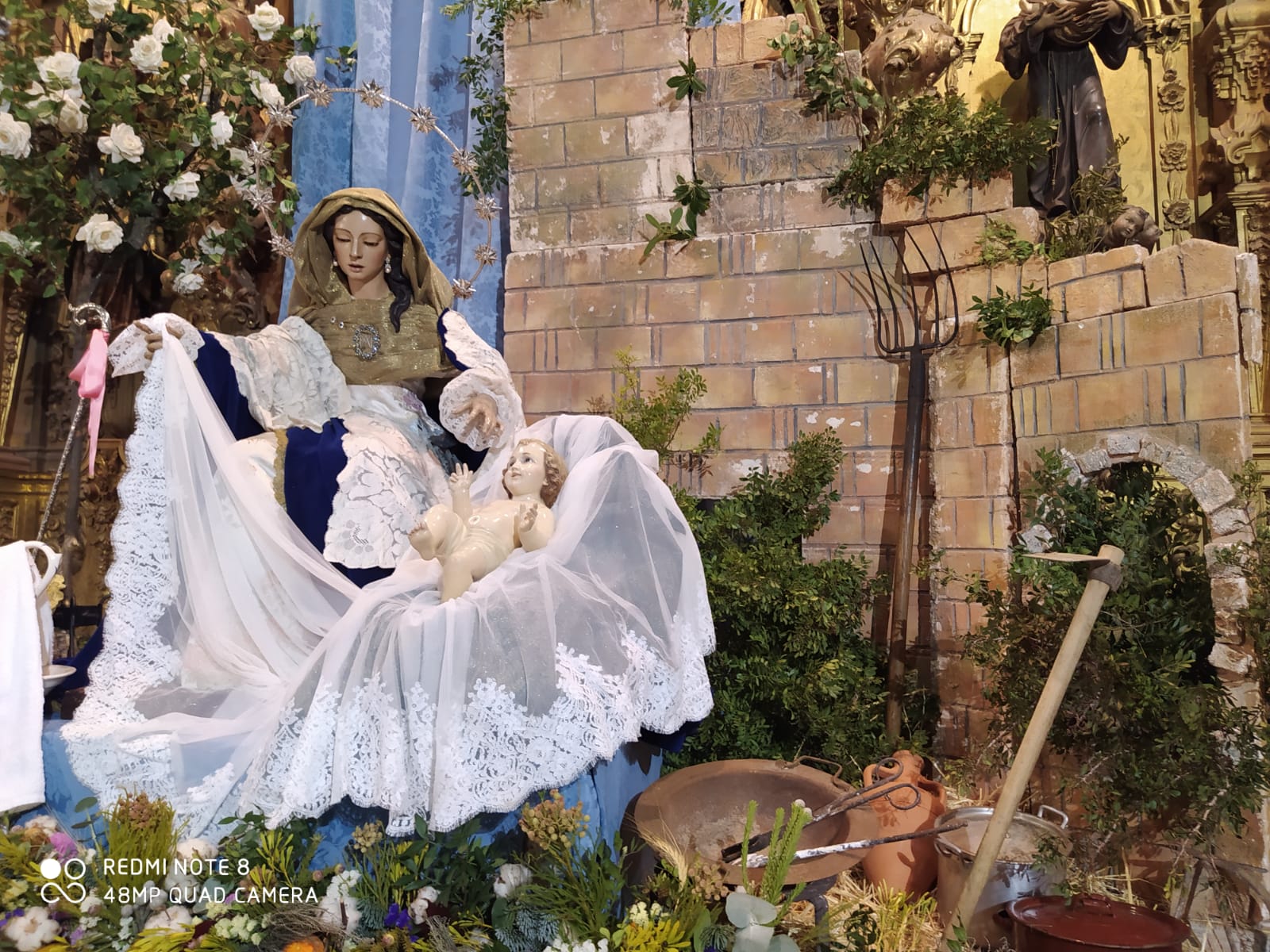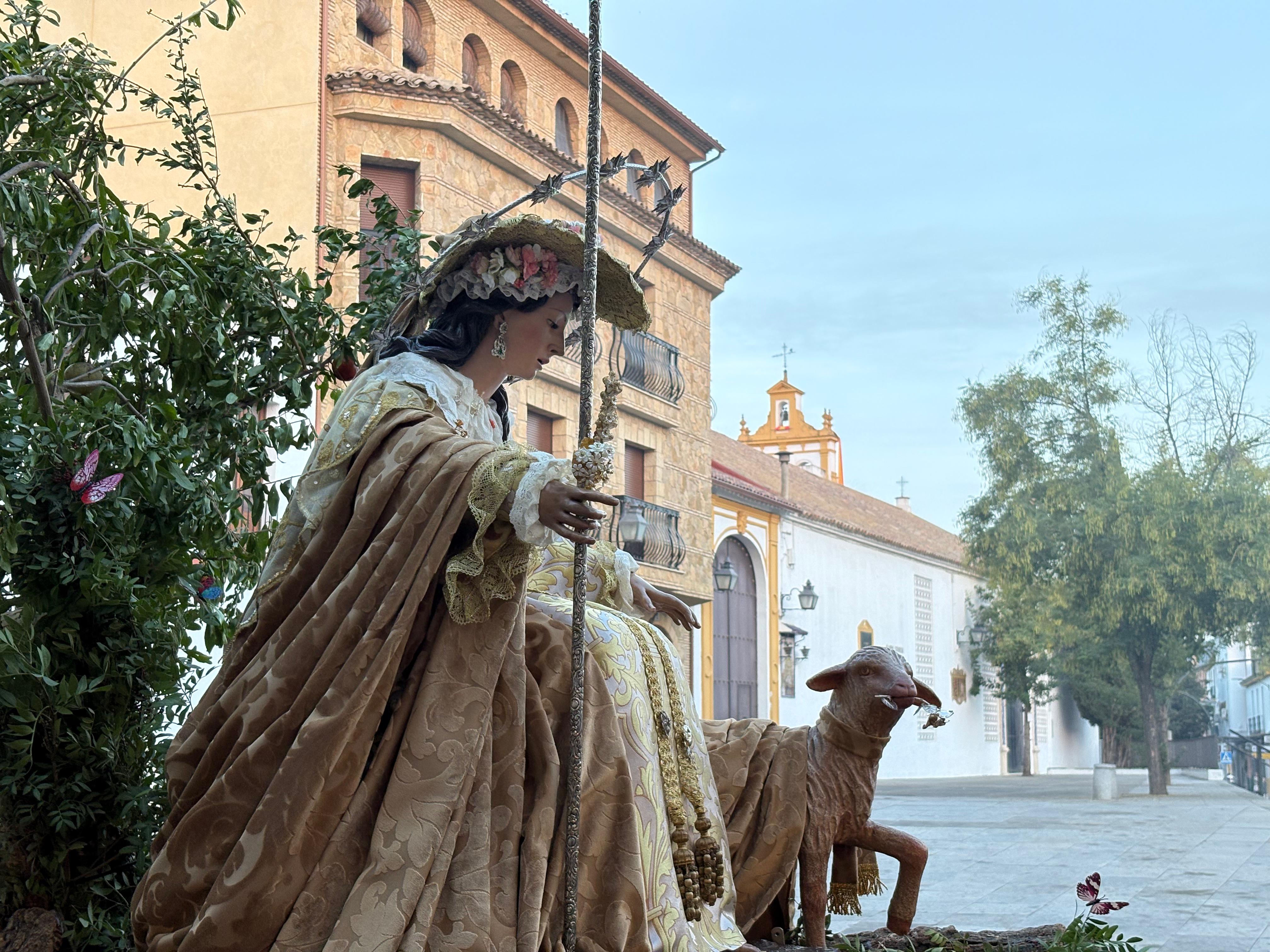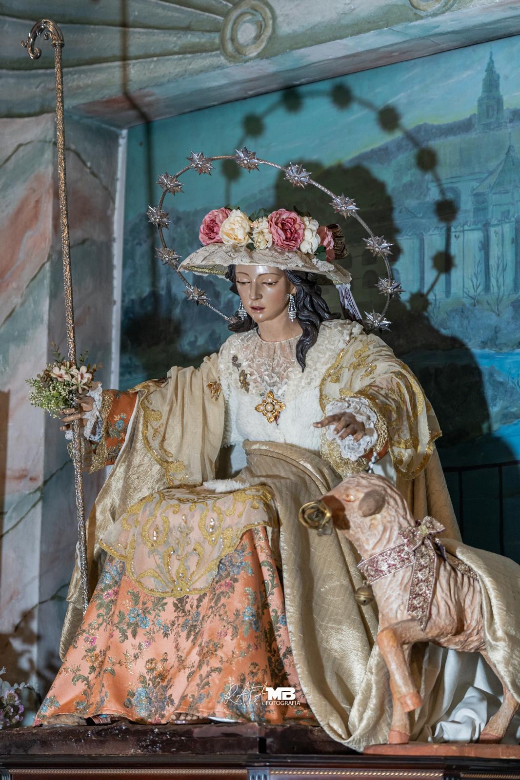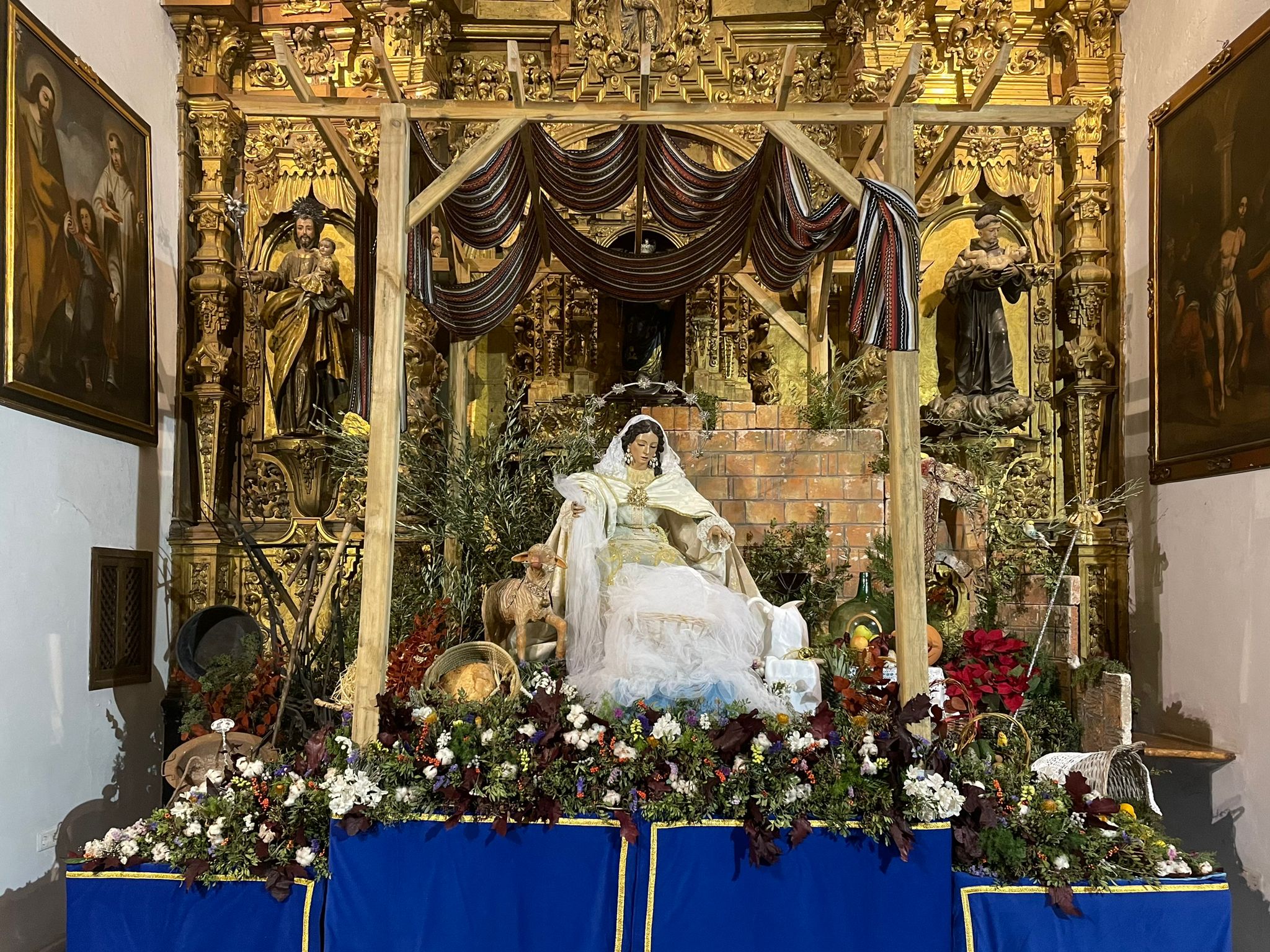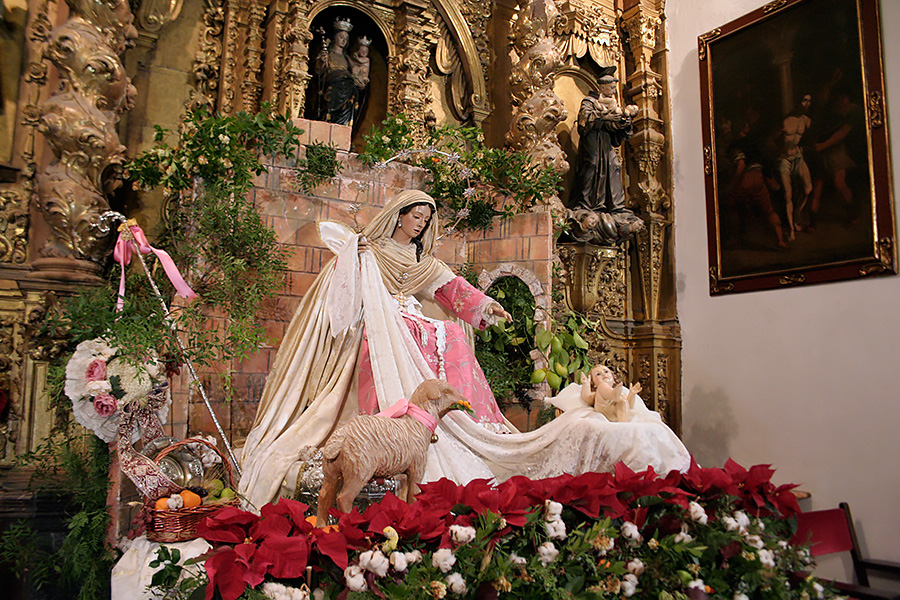 Un año más, la Divina Pastora preside el altar mayor de la parroquia, recreando con delicadeza y solemnidad el portal de Belén, acompañada por San José y aguardando con esperanza el Nacimiento de Nuestro Señor Jesucristo. Ambas imágenes se disponen bajo un cobertizo de madera, evocador de la sencillez del pesebre, y aparecen rodeadas de aperos de labranza y cestas con frutos, símbolos del trabajo humilde y de los dones de la tierra ofrecidos al Redentor.