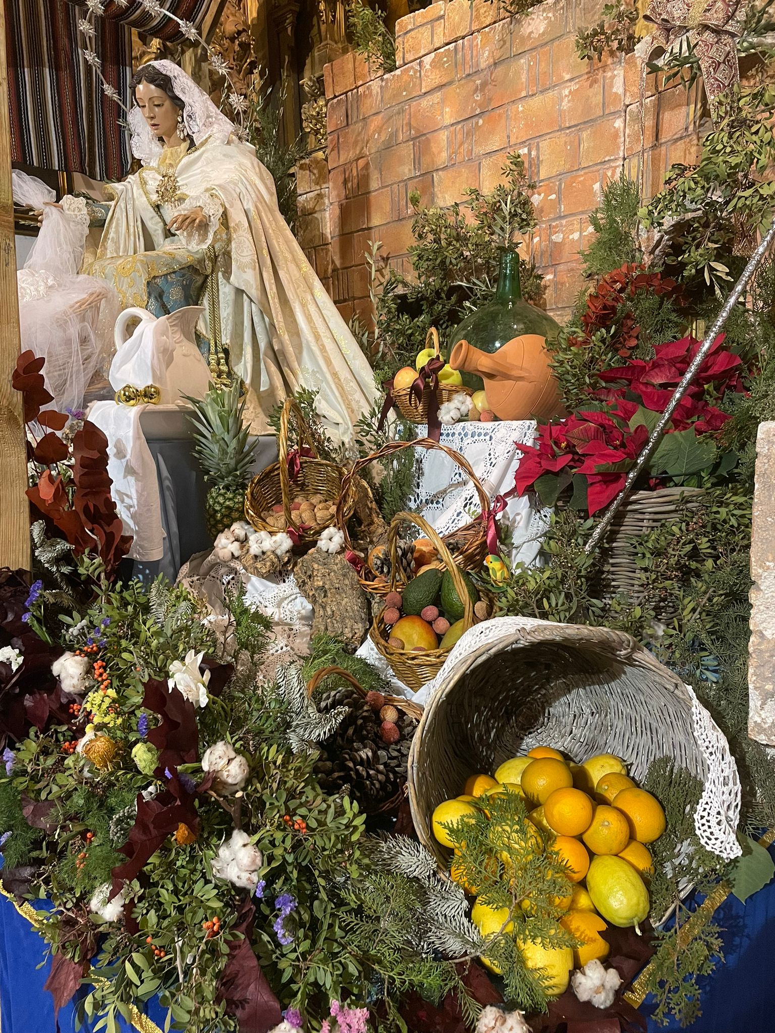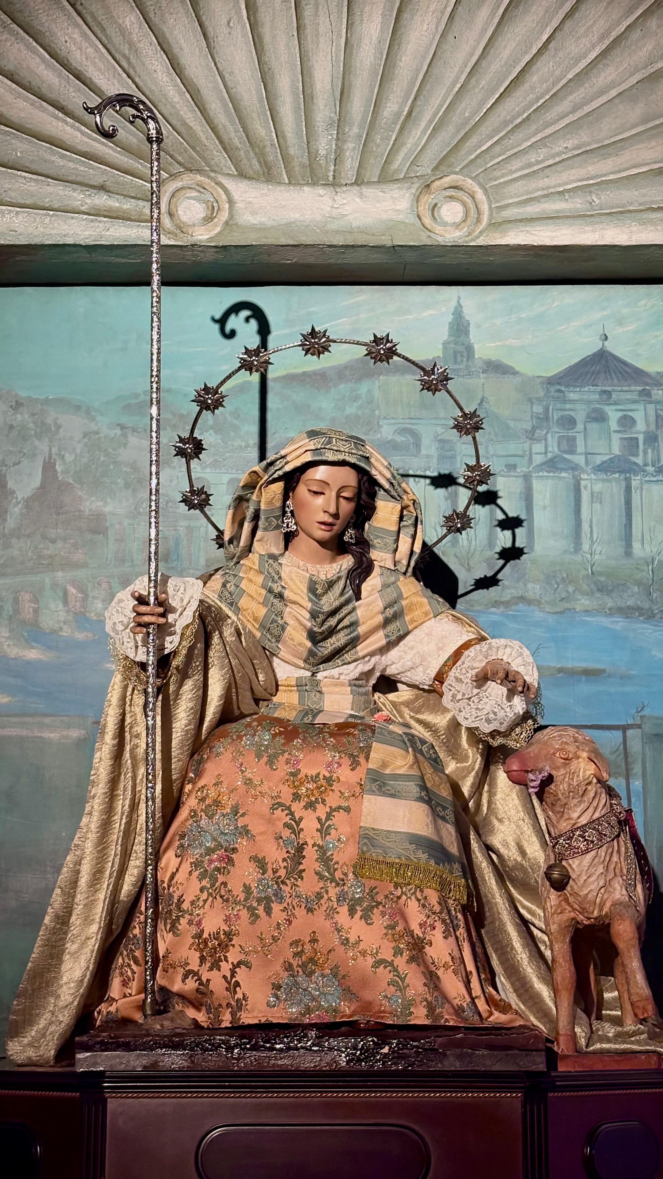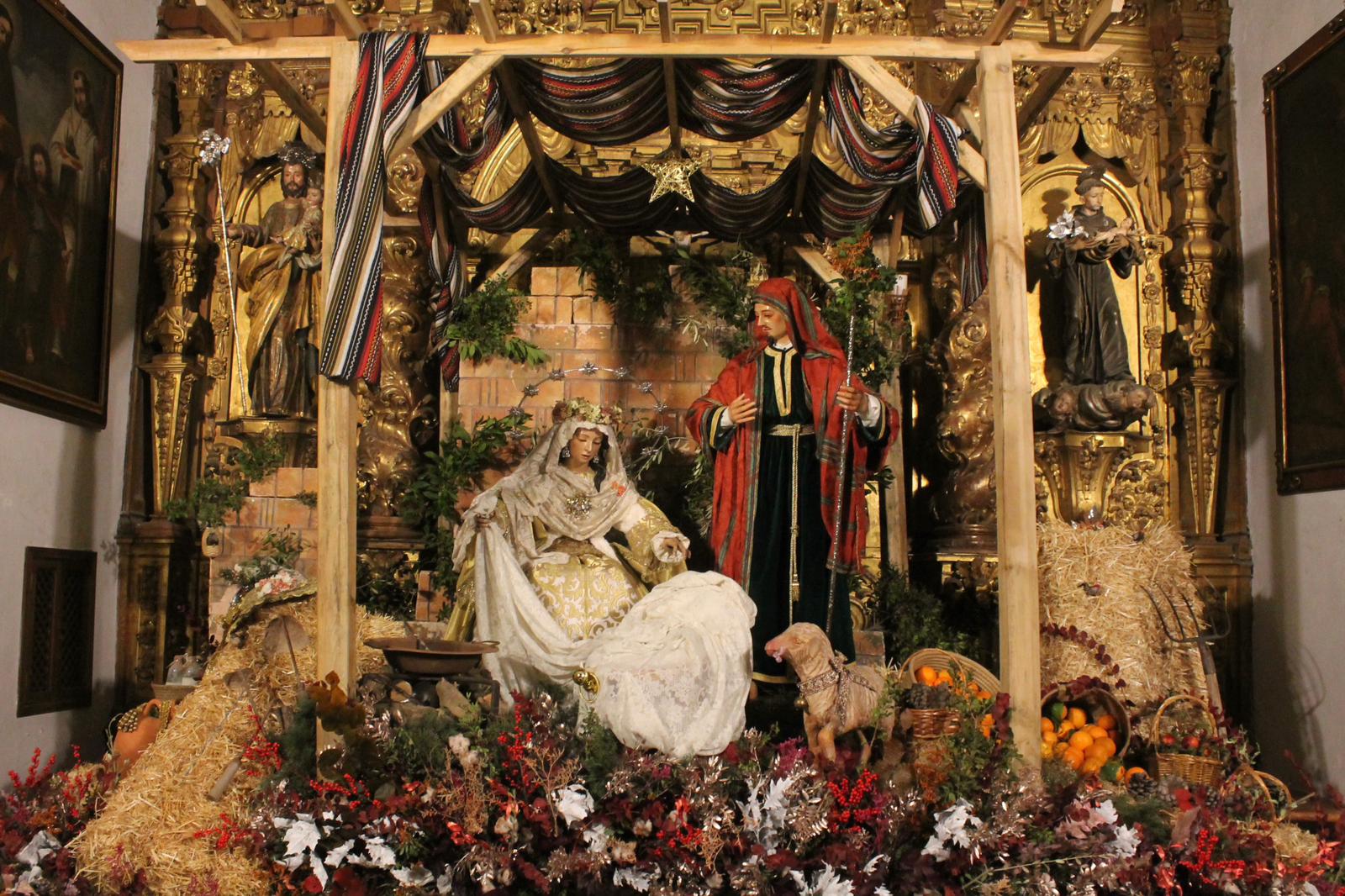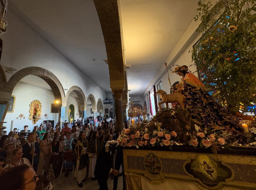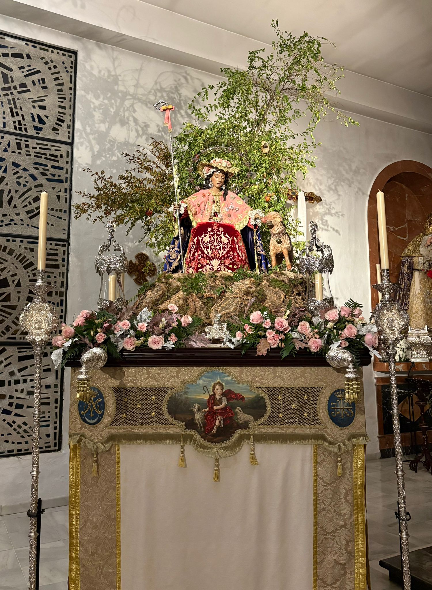 Un año más, la Divina Pastora preside el altar mayor de la parroquia, recreando con delicadeza y solemnidad el portal de Belén, acompañada por San José y aguardando con esperanza el Nacimiento de Nuestro Señor Jesucristo. Ambas imágenes se disponen bajo un cobertizo de madera, evocador de la sencillez del pesebre, y aparecen rodeadas de aperos de labranza y cestas con frutos, símbolos del trabajo humilde y de los dones de la tierra ofrecidos al Redentor.