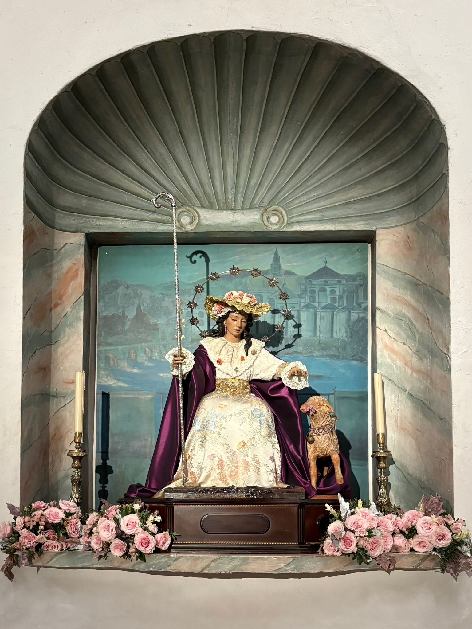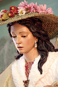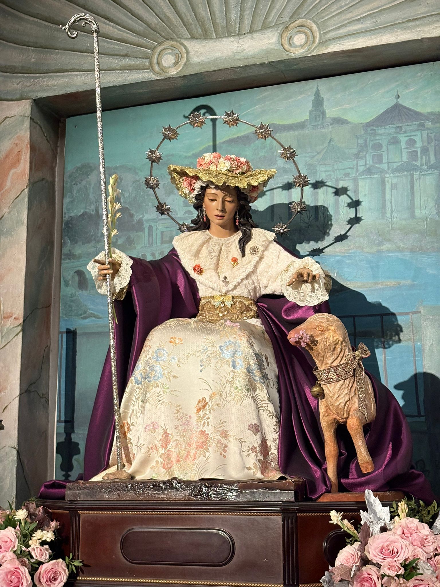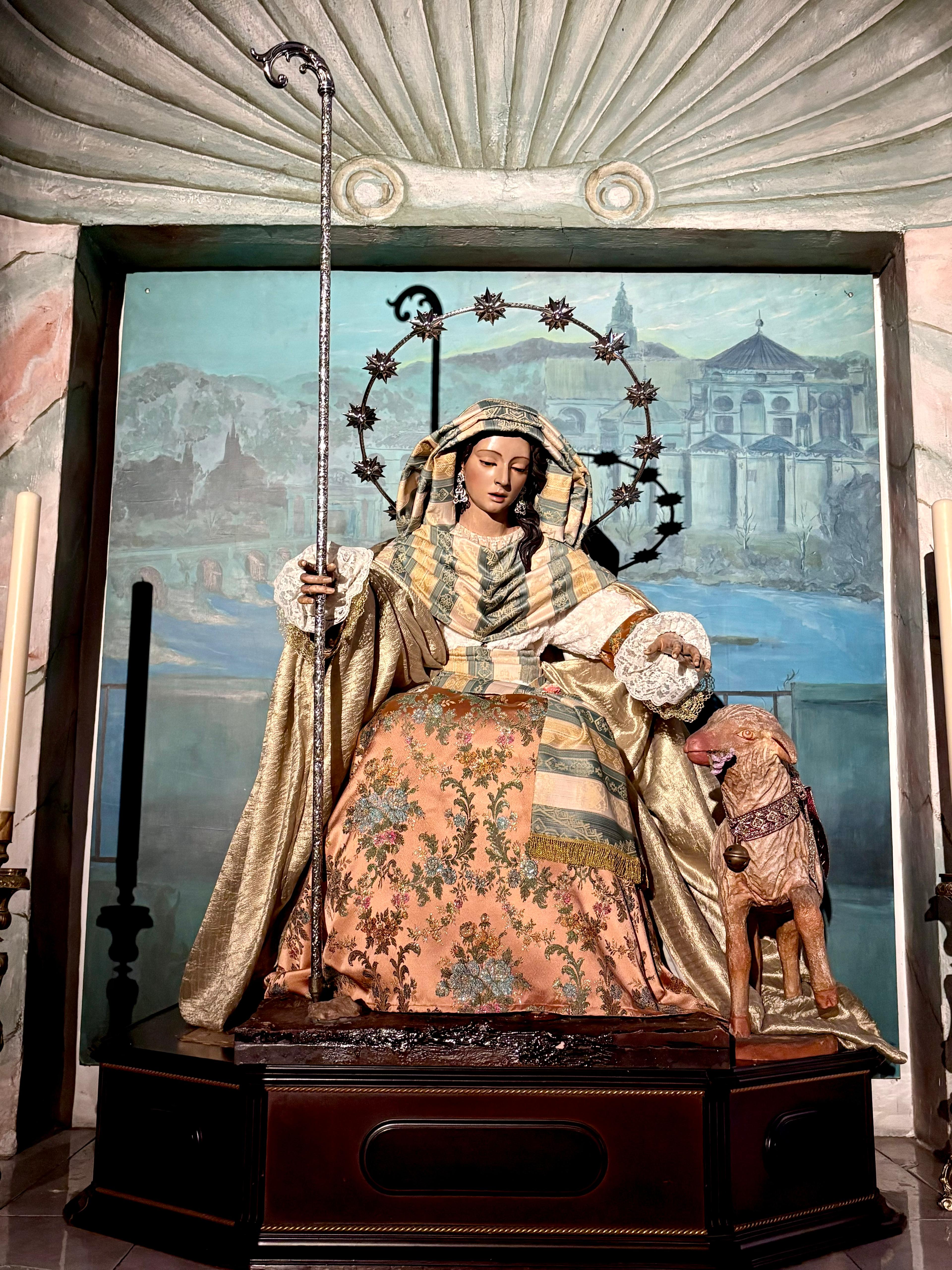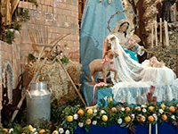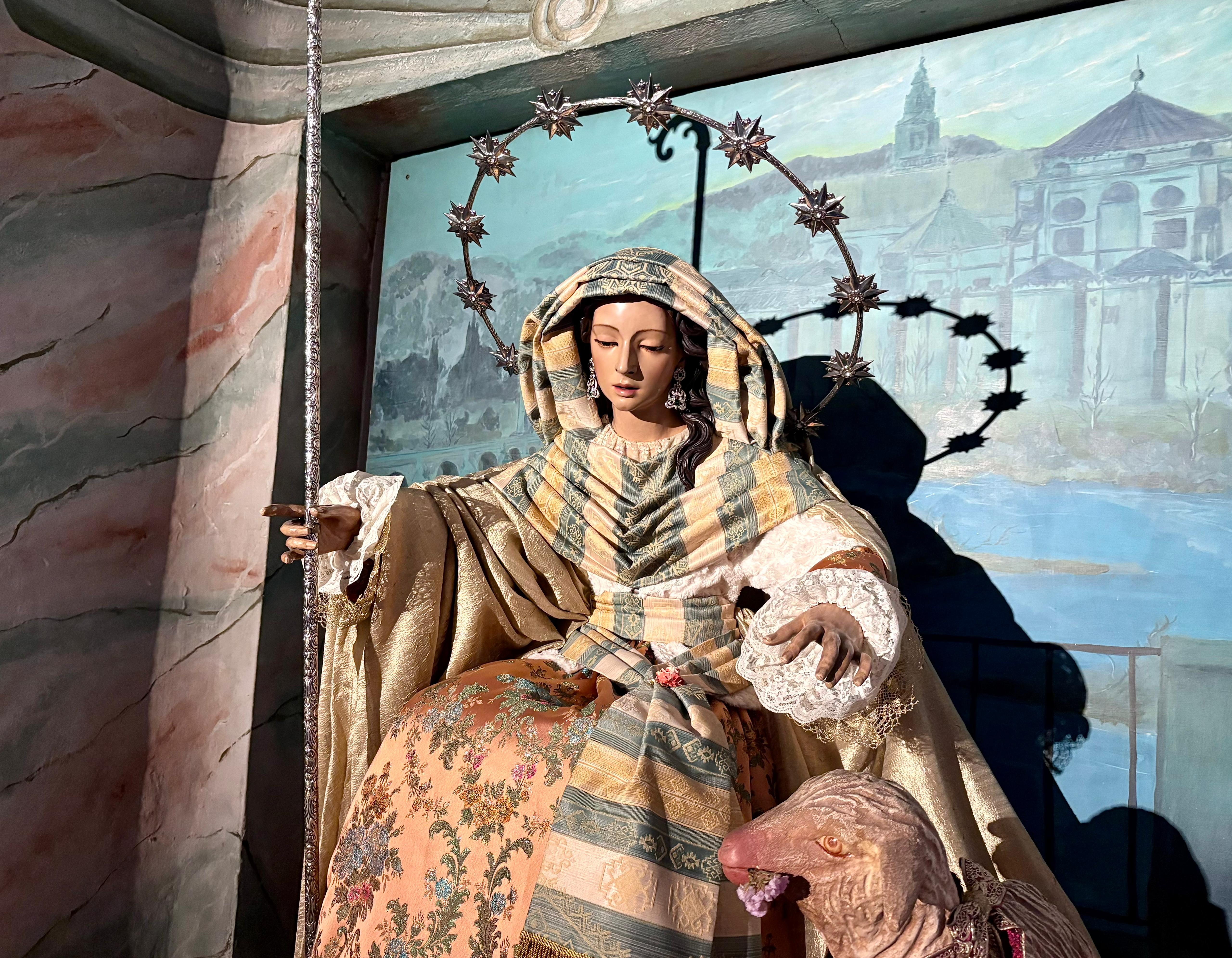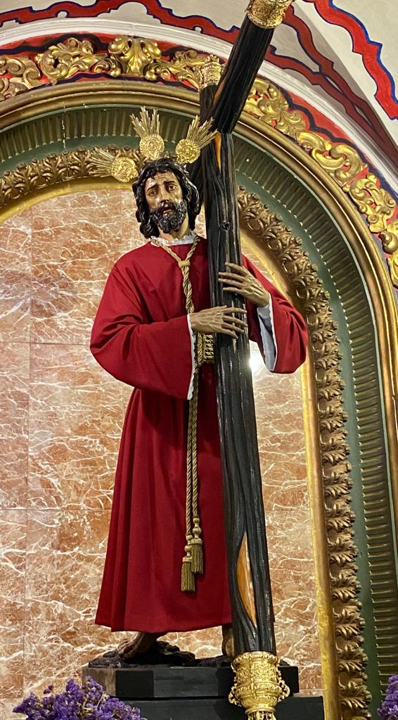 Un año más, la Divina Pastora preside el altar mayor de la parroquia, recreando con delicadeza y solemnidad el portal de Belén, acompañada por San José y aguardando con esperanza el Nacimiento de Nuestro Señor Jesucristo. Ambas imágenes se disponen bajo un cobertizo de madera, evocador de la sencillez del pesebre, y aparecen rodeadas de aperos de labranza y cestas con frutos, símbolos del trabajo humilde y de los dones de la tierra ofrecidos al Redentor.