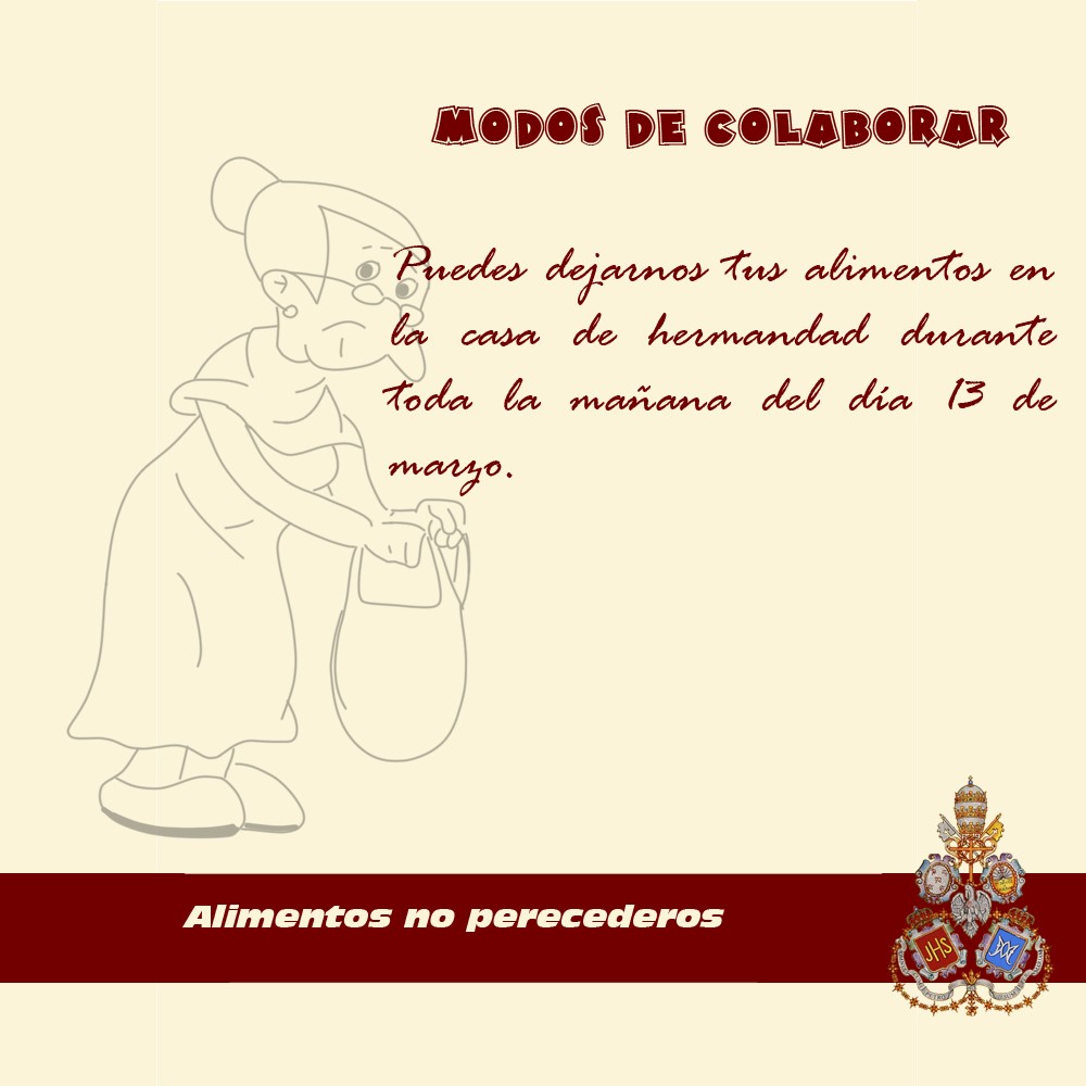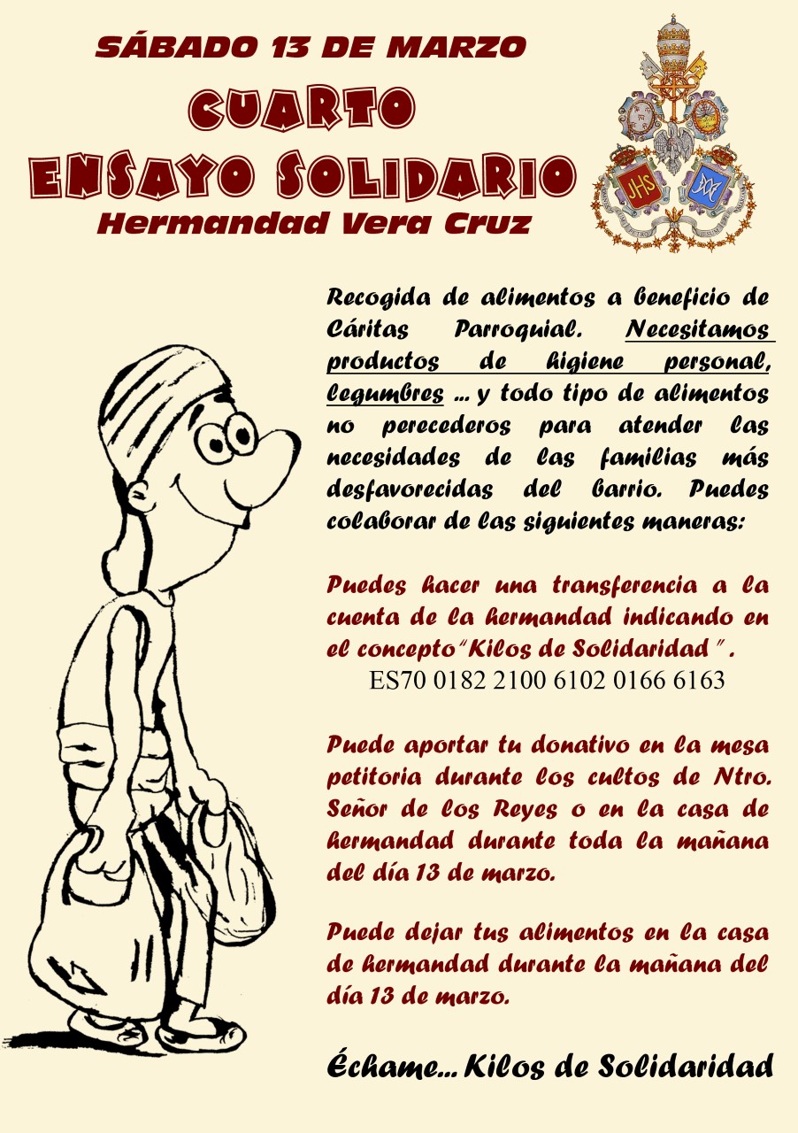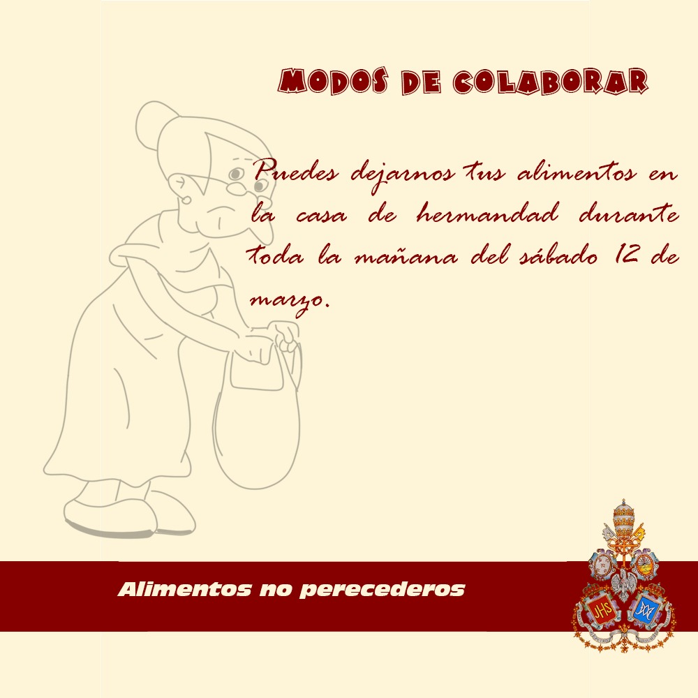 Invitamos a todos los vecinos, cofrades y devotos a participar y colaborar con esta iniciativa, aportando alimentos no perecederos o donativos que serán destinados íntegramente a quienes más lo necesitan. Juntos, un año más, haremos del ensayo un gesto de esperanza y caridad.