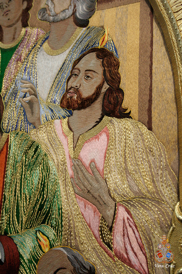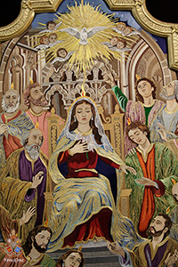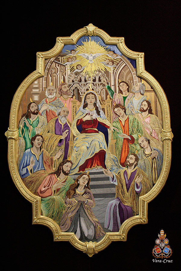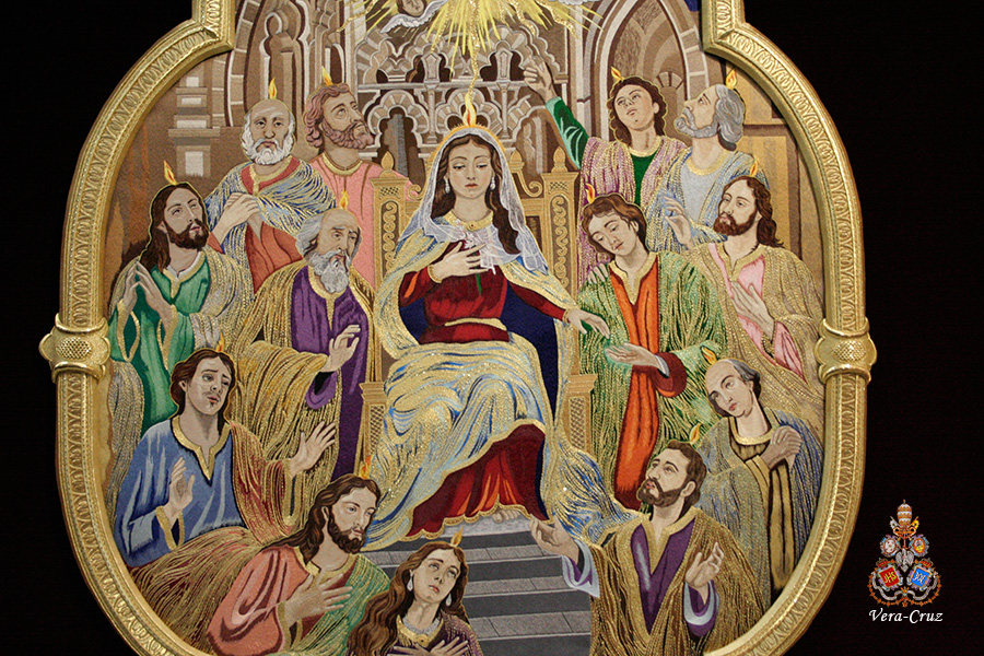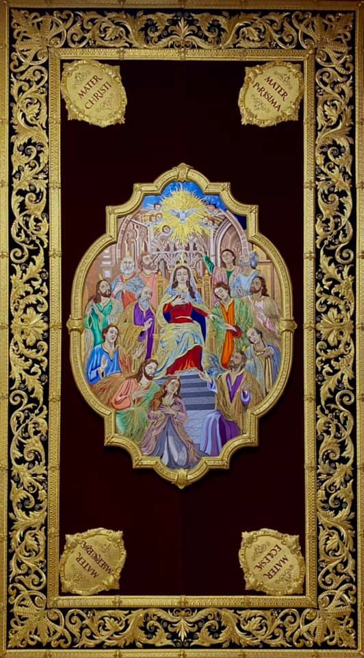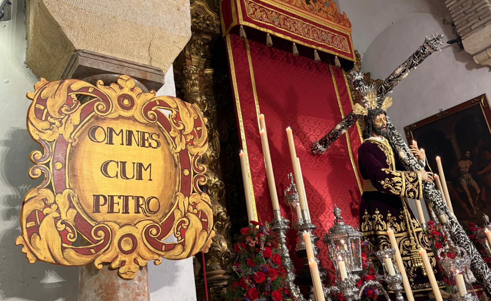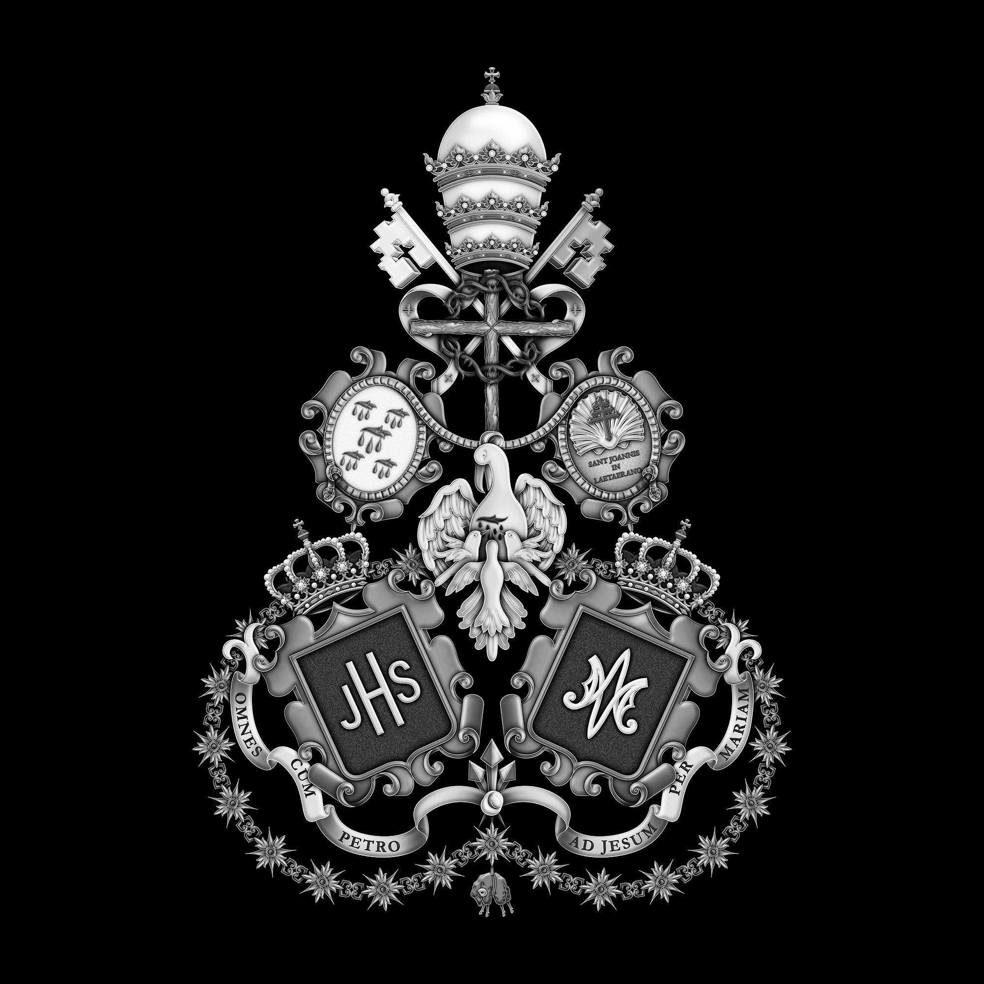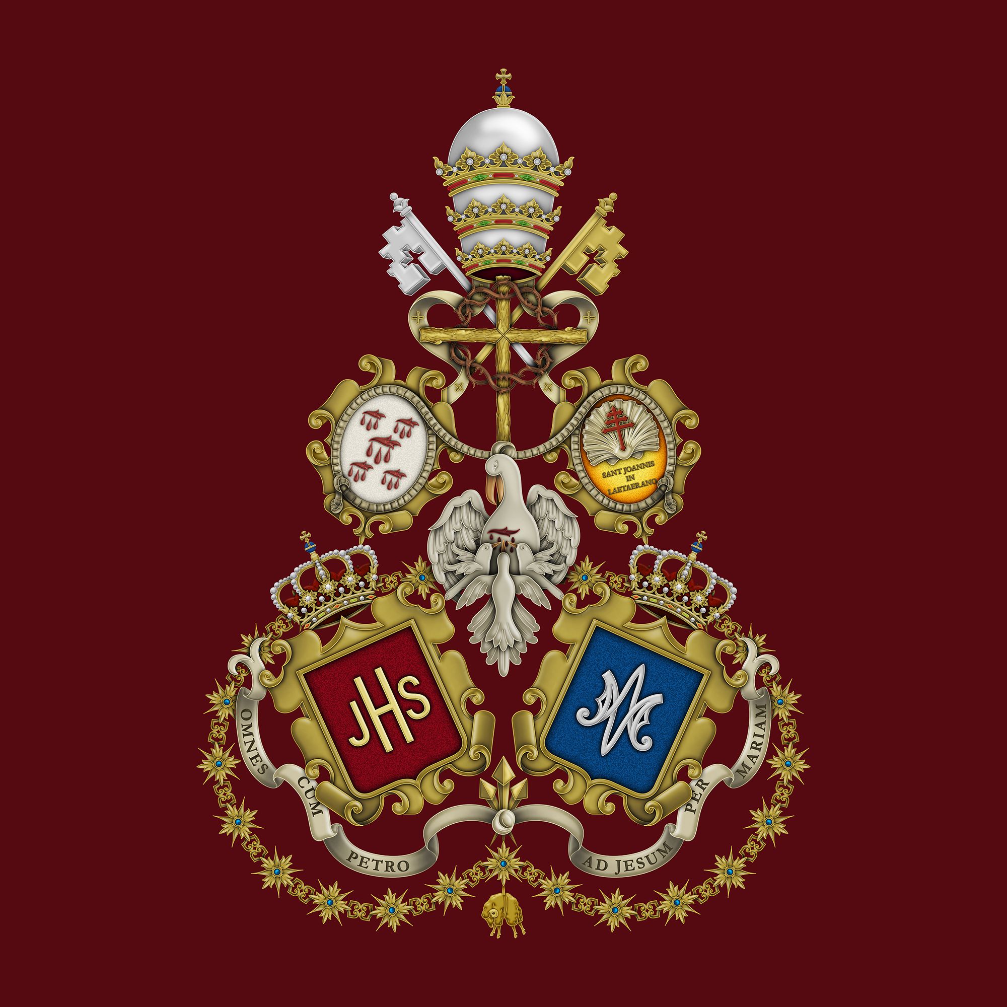 En dichos tondos figura la leyenda en latín: “OMNES CUM PETRO AD IESUM PER MARIAM”