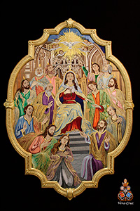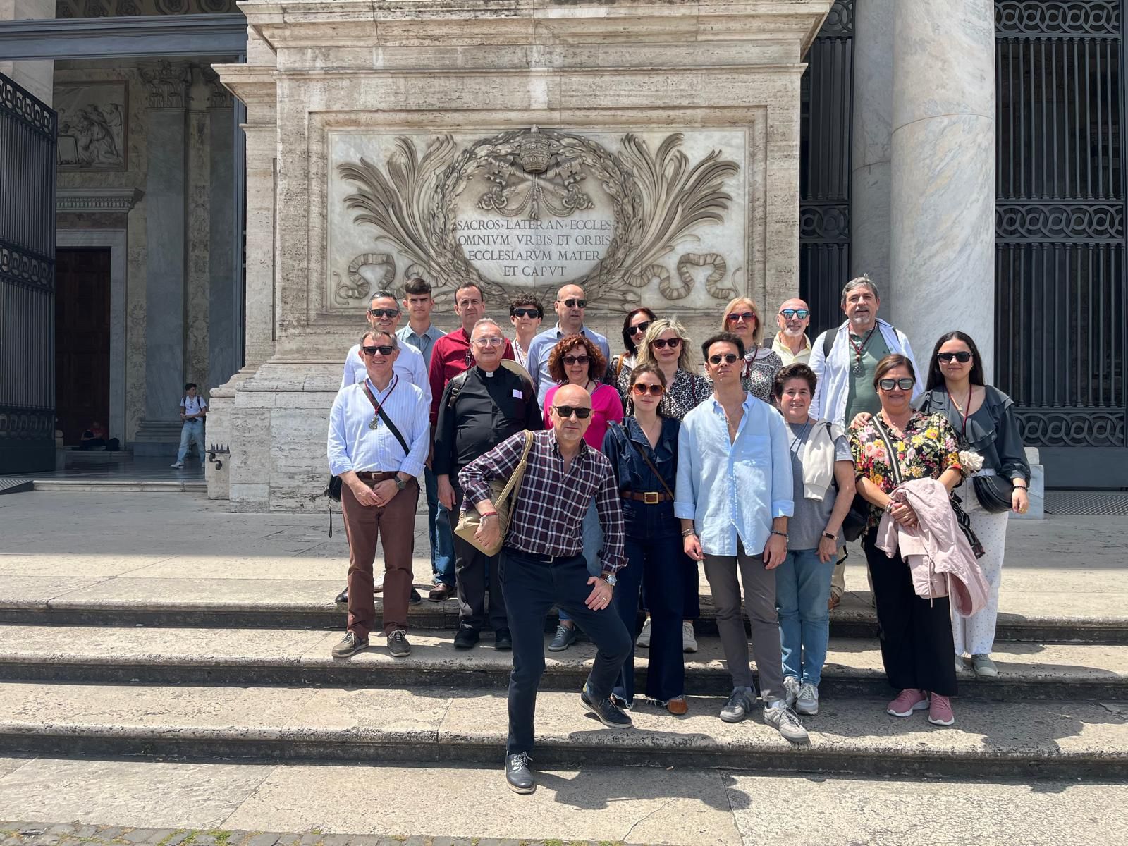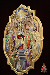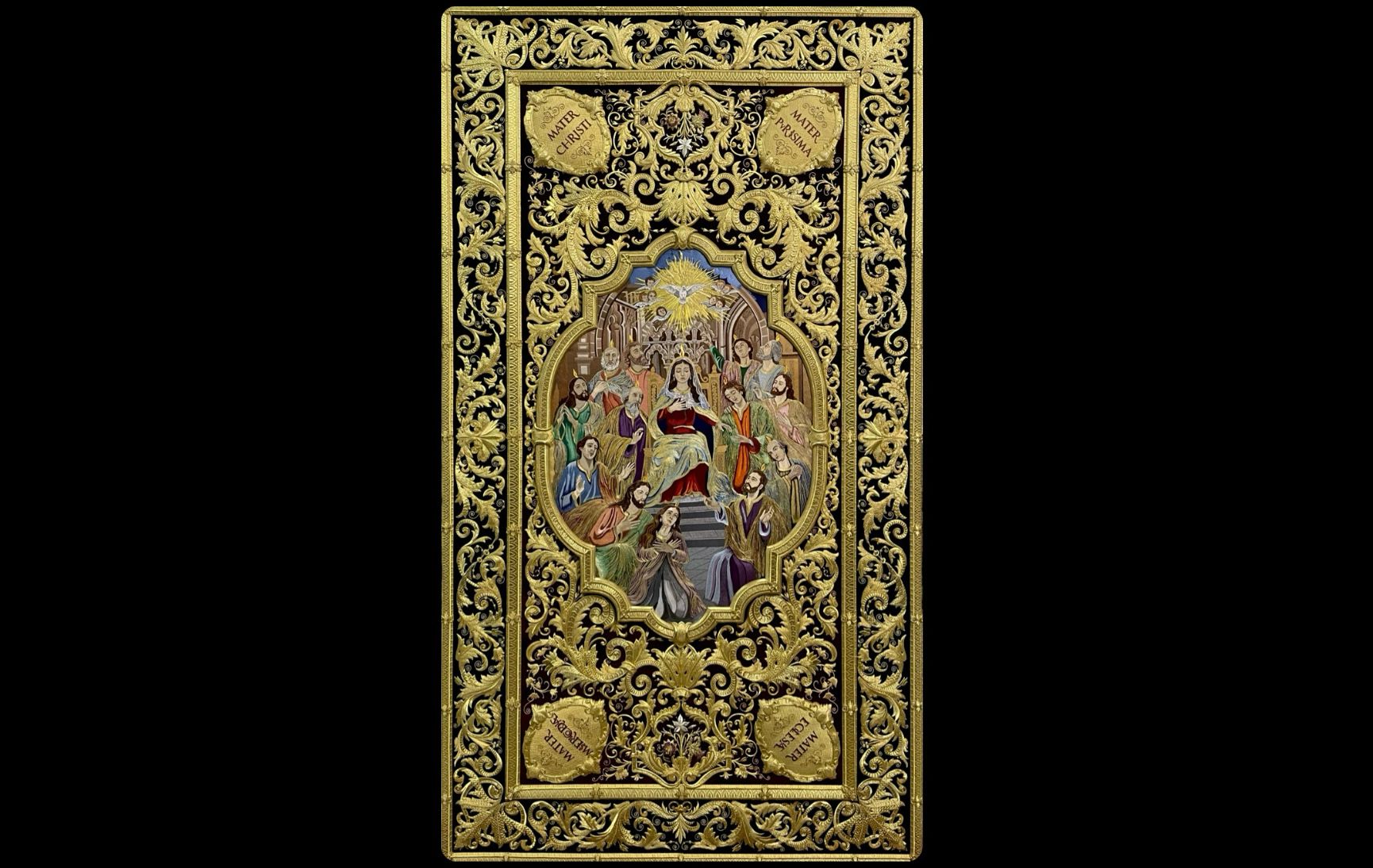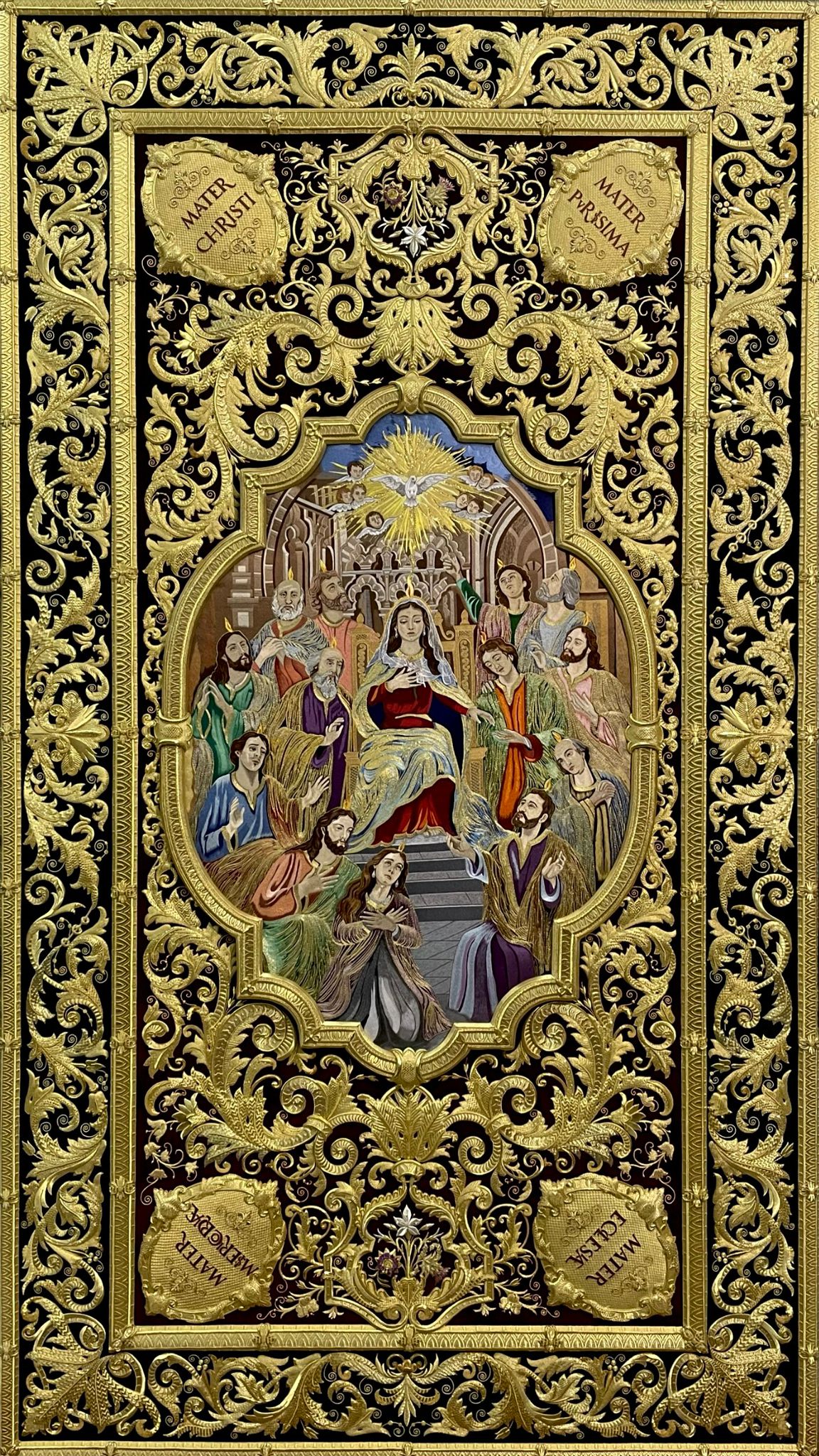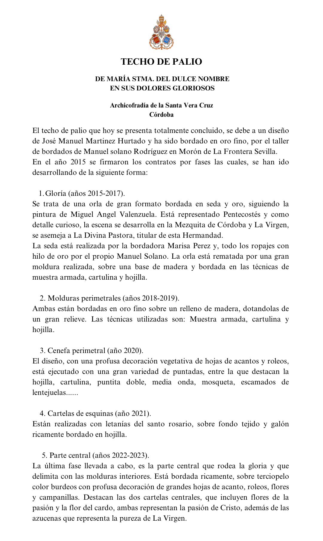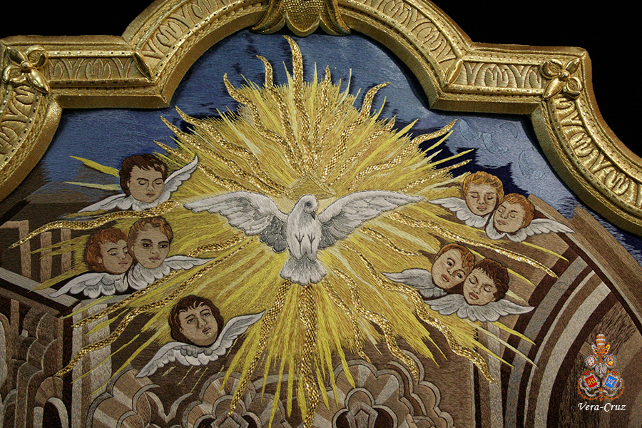 En dichos tondos figura la leyenda en latín: “OMNES CUM PETRO AD IESUM PER MARIAM”