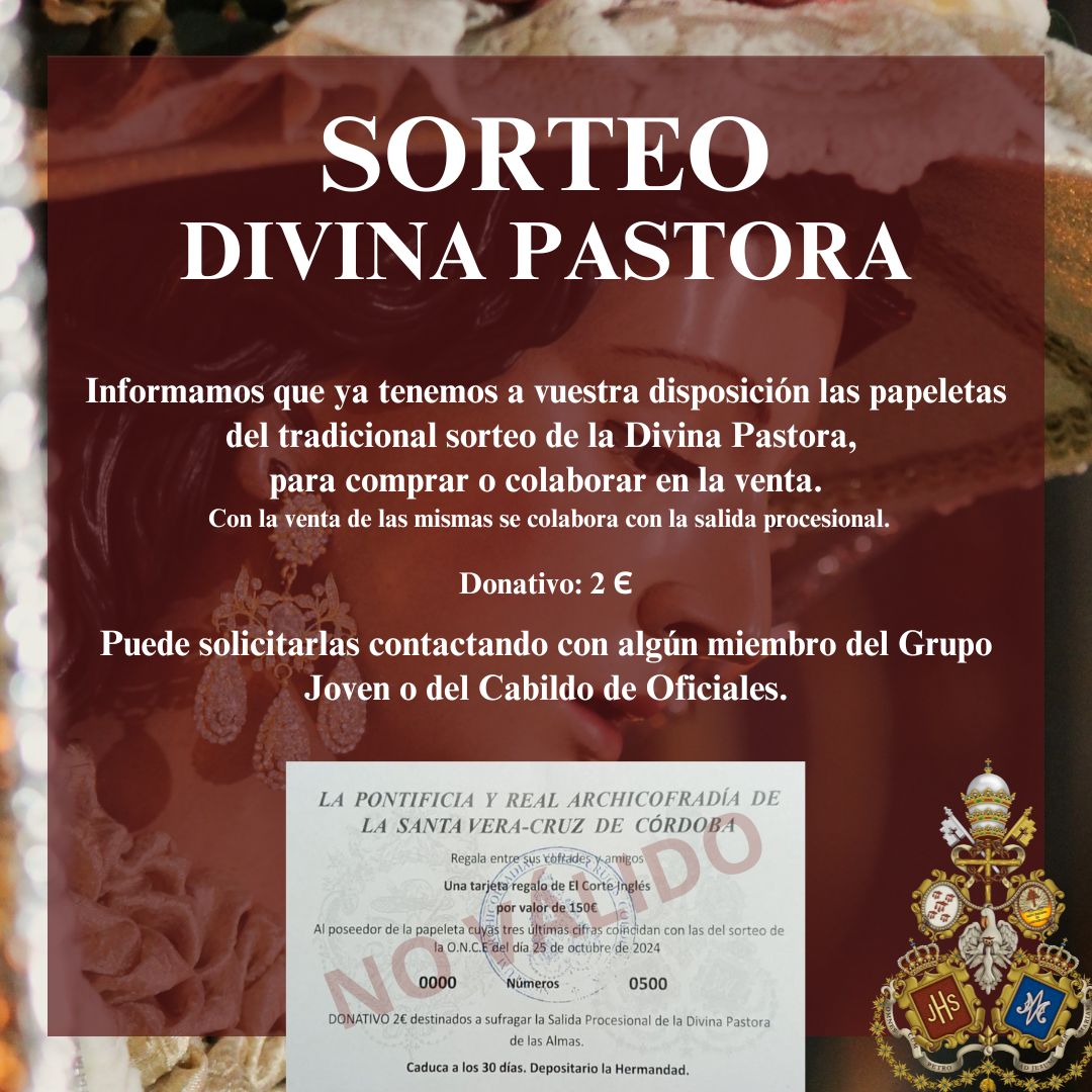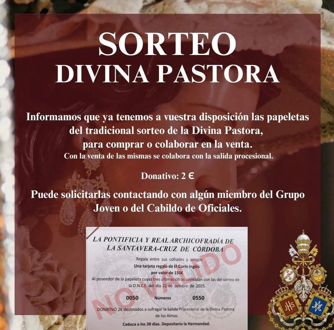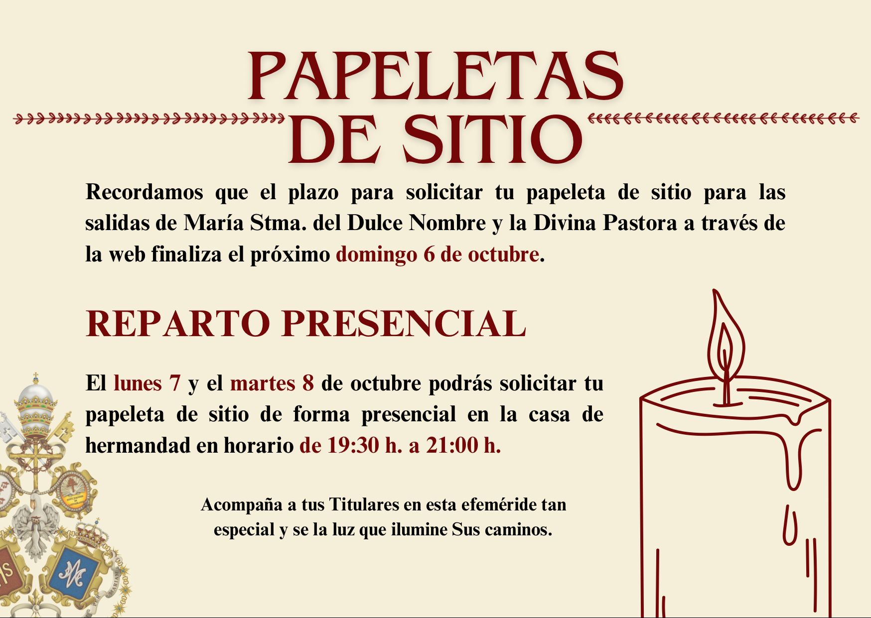 Se podrá solicitar la papeleta de sitio en la casa de hermandad los días sábado 15 de octubre, de 11 a 14 horas y tras la Función a la Divina Pastora que comenzará a las 20:30 horas, el domingo 16 de octubre tras la Procesión de la Divina Pastora y el miércoles 19 de octubre de 21 a 21:30 horas.