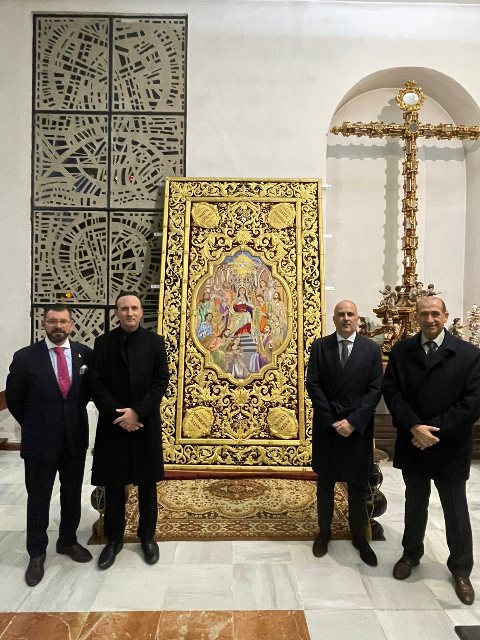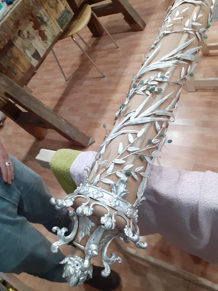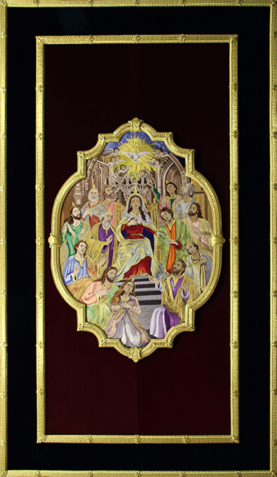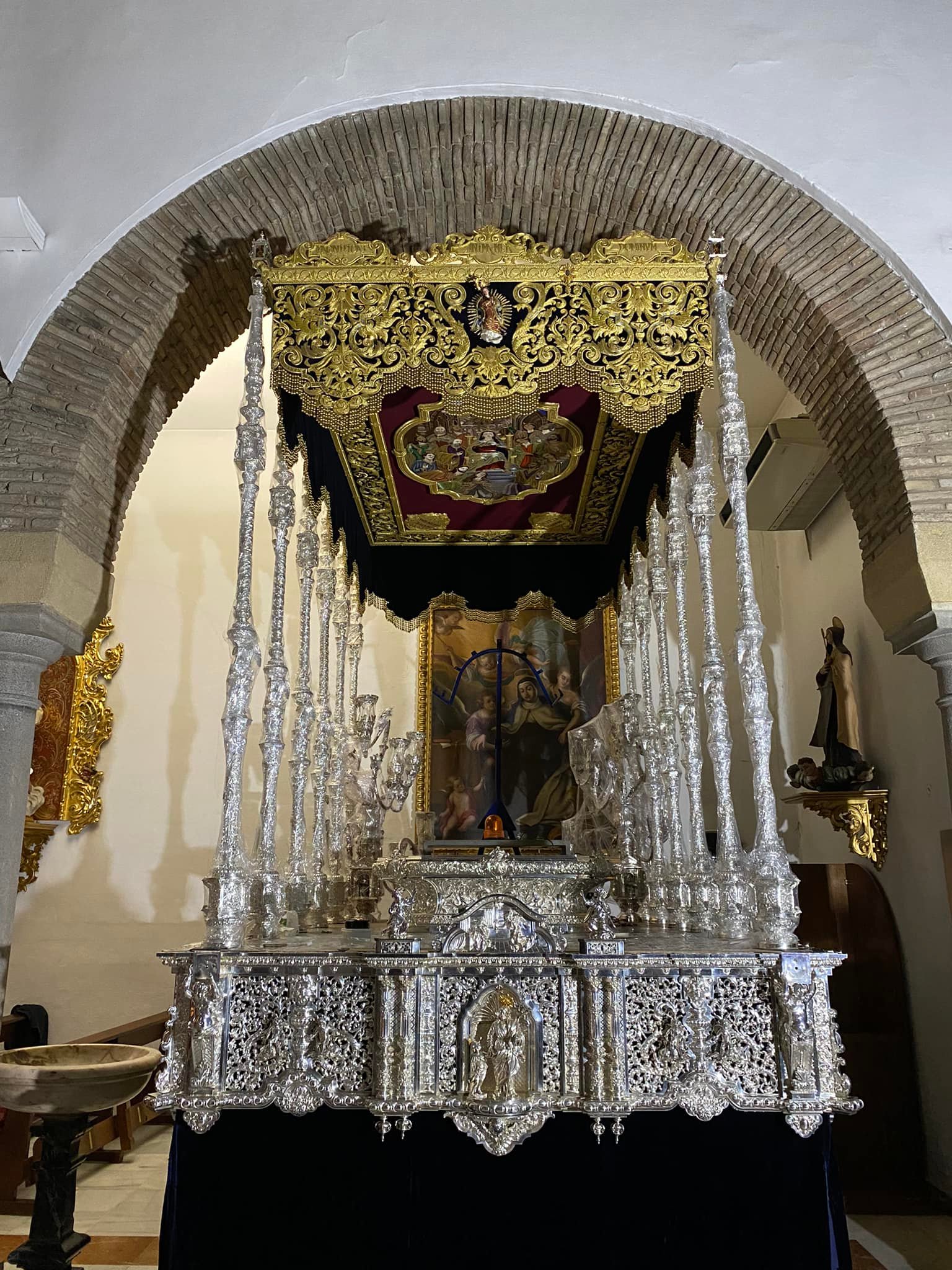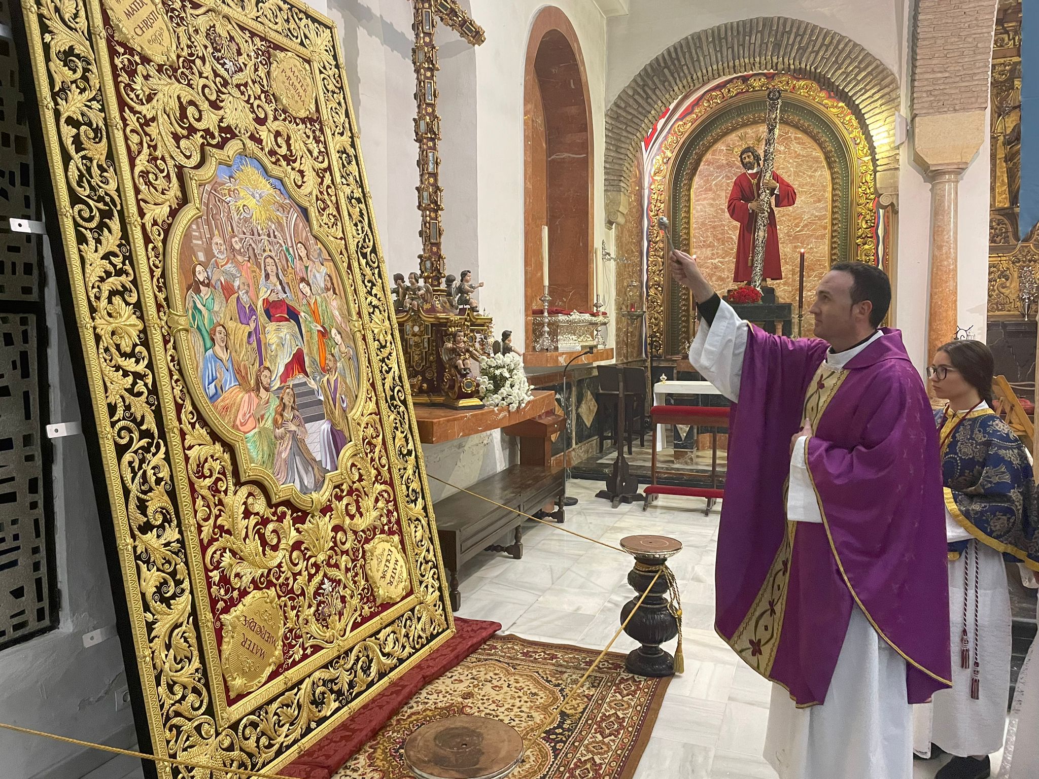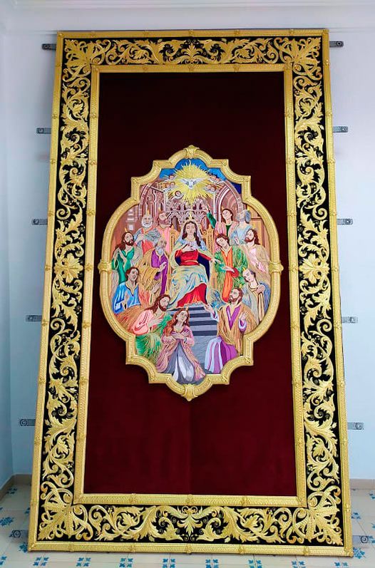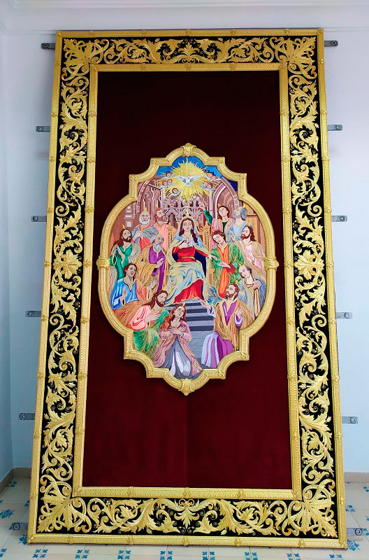 Como principal novedad, se incorporan nuevos elementos decorativos realizados por N.H.D. Julio Cachinero. Estas piezas comprenden el remate del dosel, concebido para aportar mayor elevación y sentido simbólico al conjunto, así como dos tondos ornamentales que enmarcan y equilibran la composición del altar.