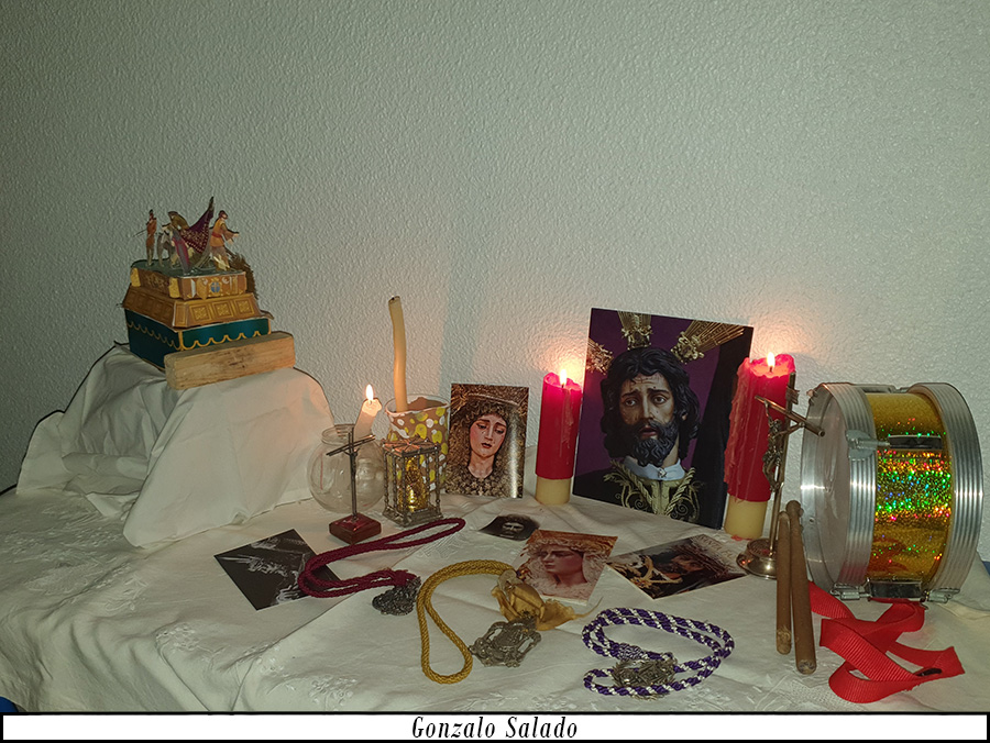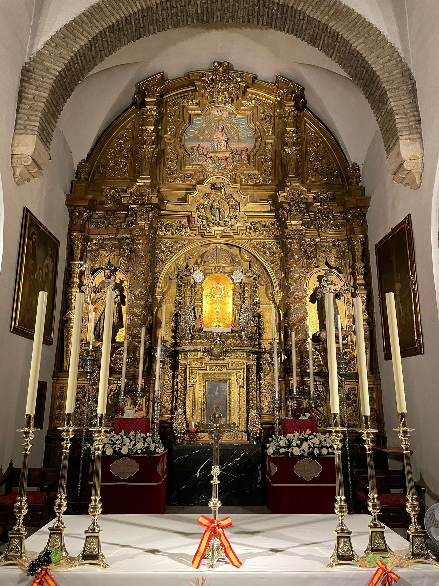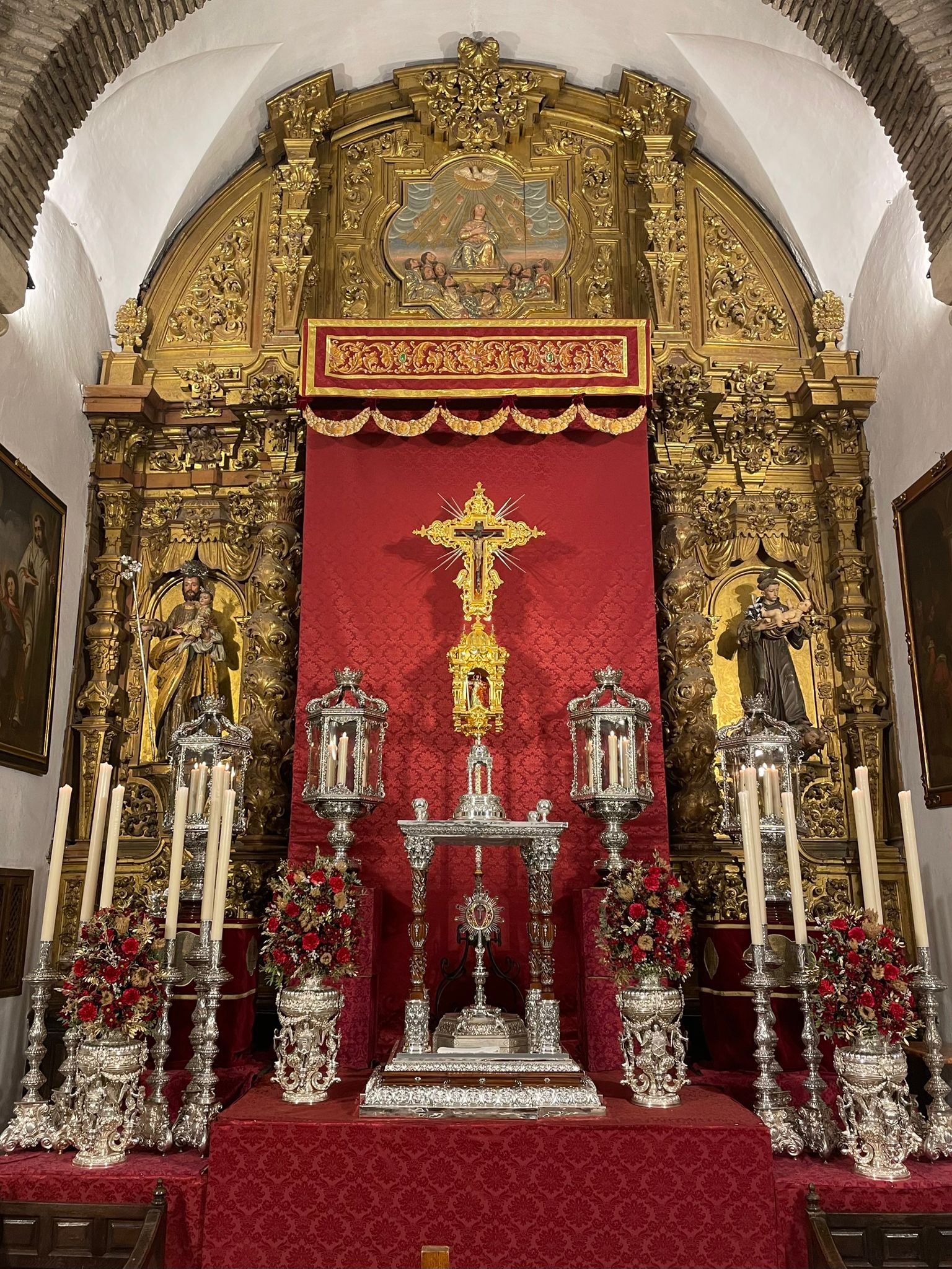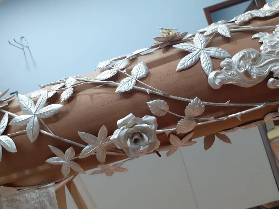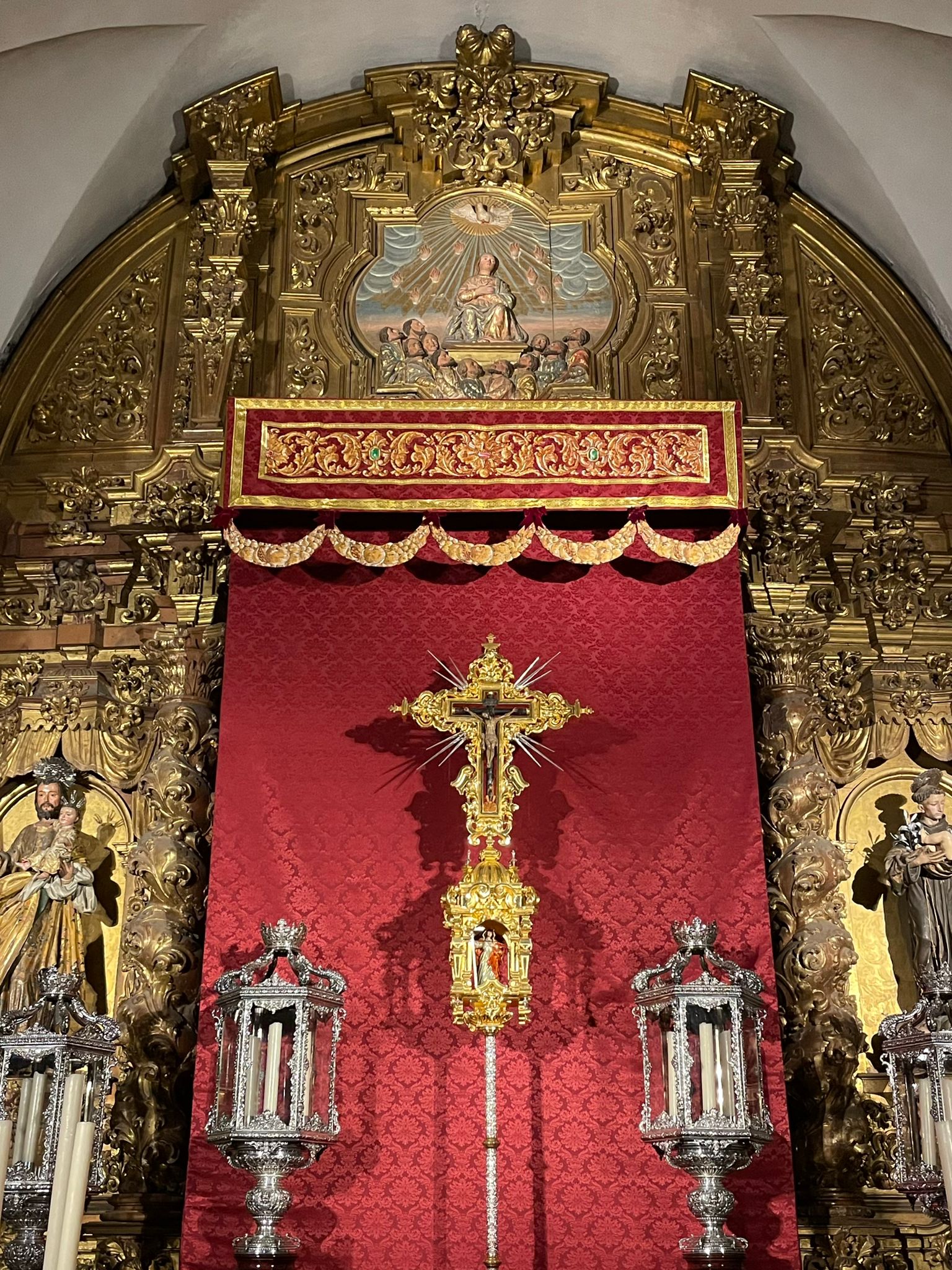 Como principal novedad, se incorporan nuevos elementos decorativos realizados por N.H.D. Julio Cachinero. Estas piezas comprenden el remate del dosel, concebido para aportar mayor elevación y sentido simbólico al conjunto, así como dos tondos ornamentales que enmarcan y equilibran la composición del altar.