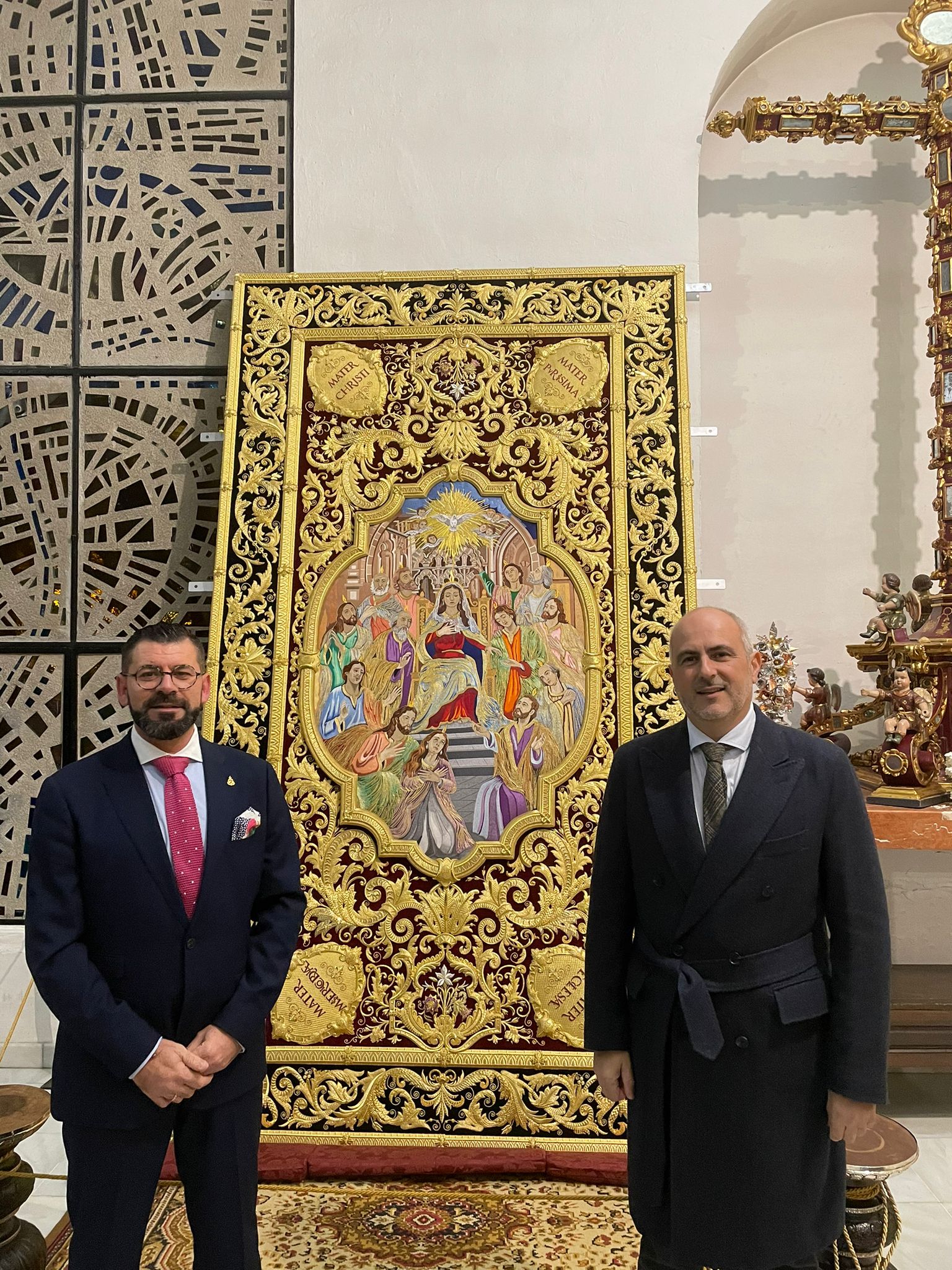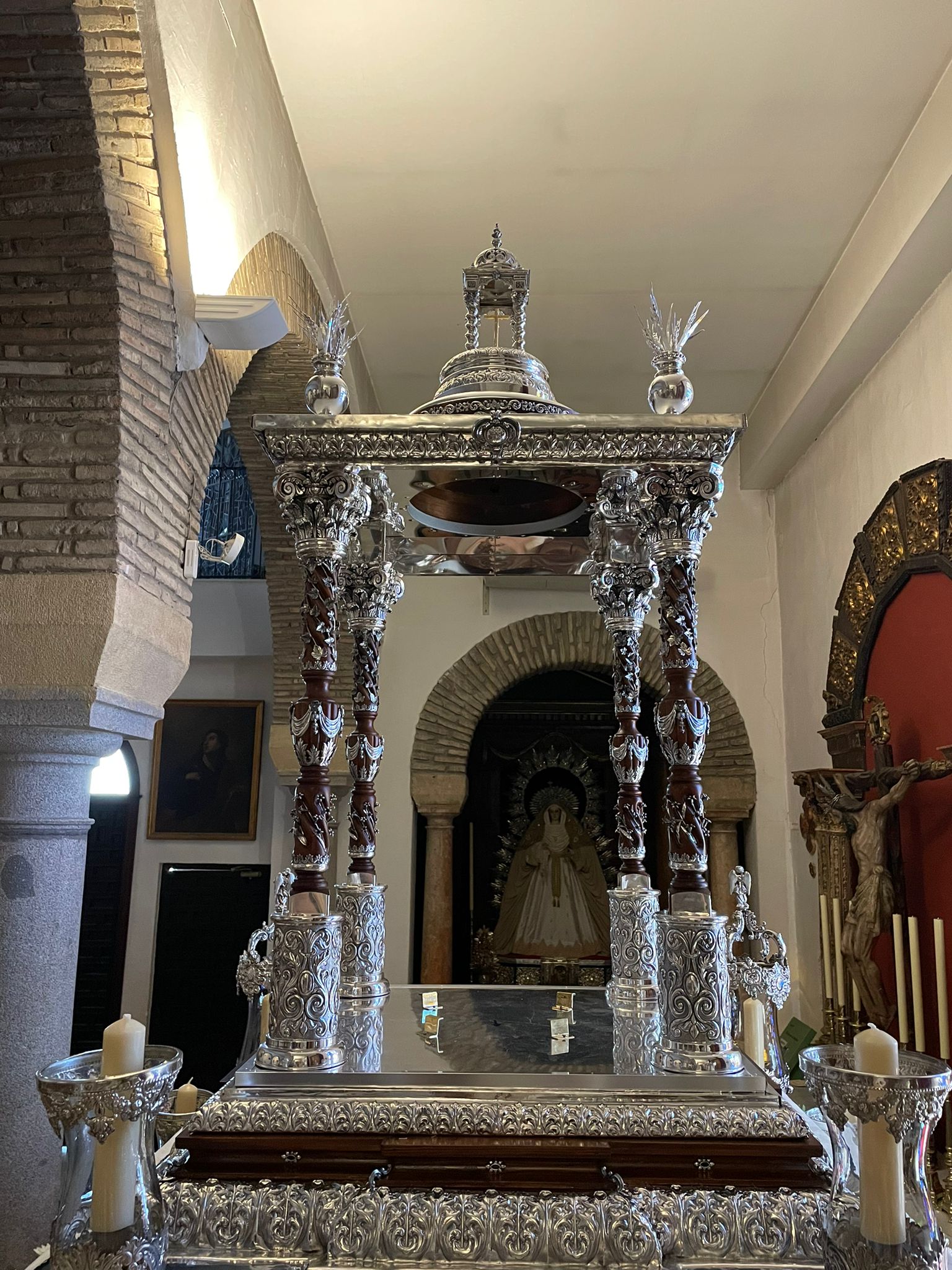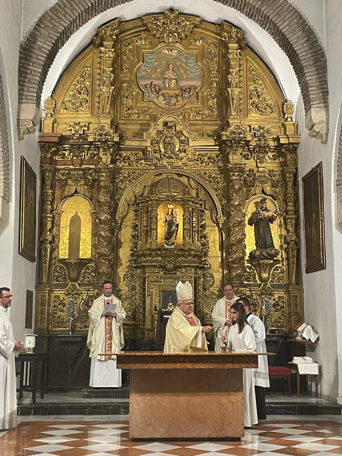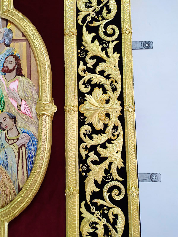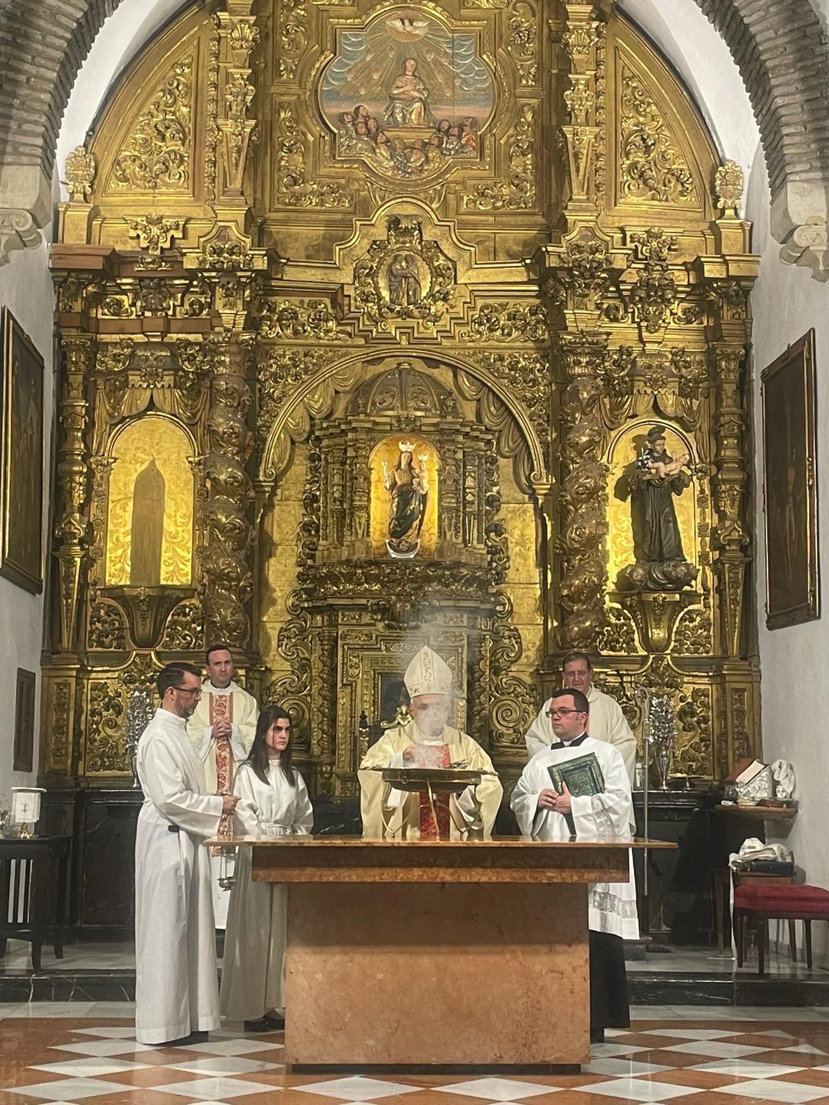 Como principal novedad, se incorporan nuevos elementos decorativos realizados por N.H.D. Julio Cachinero. Estas piezas comprenden el remate del dosel, concebido para aportar mayor elevación y sentido simbólico al conjunto, así como dos tondos ornamentales que enmarcan y equilibran la composición del altar.
