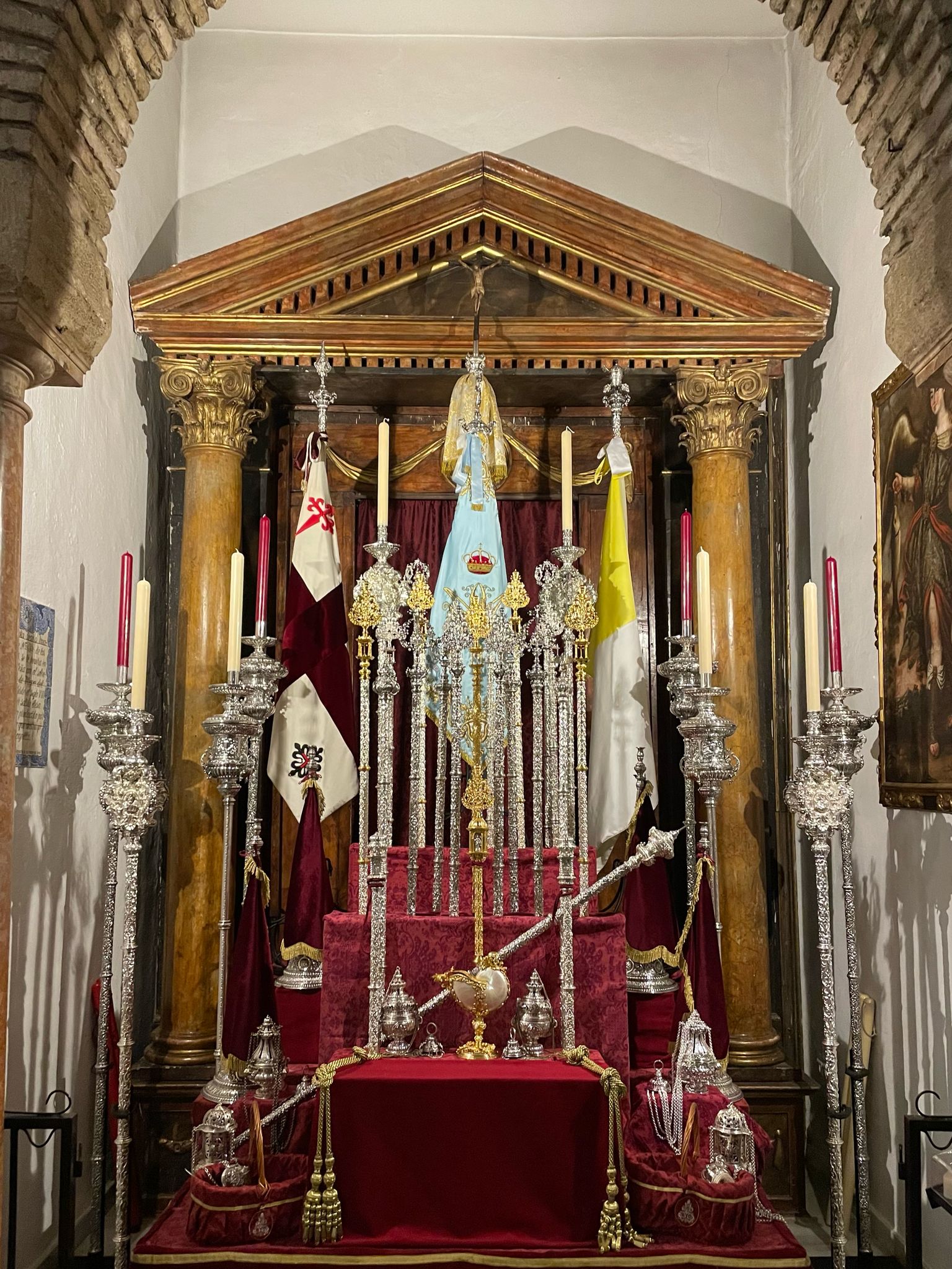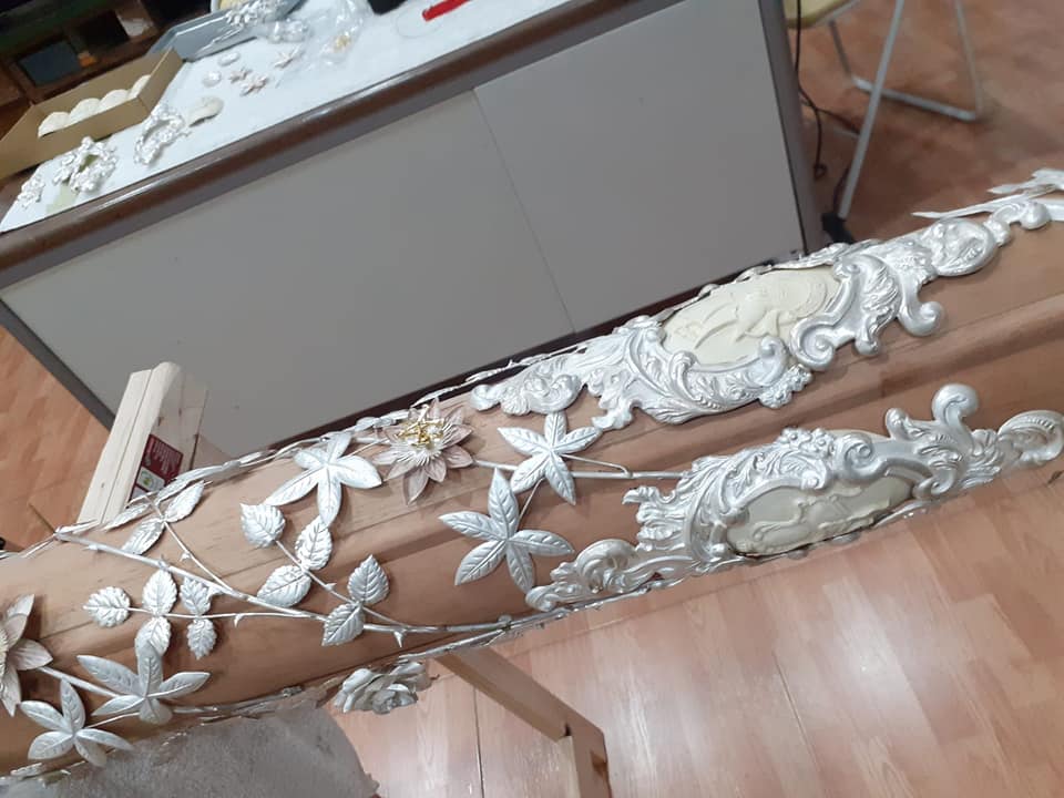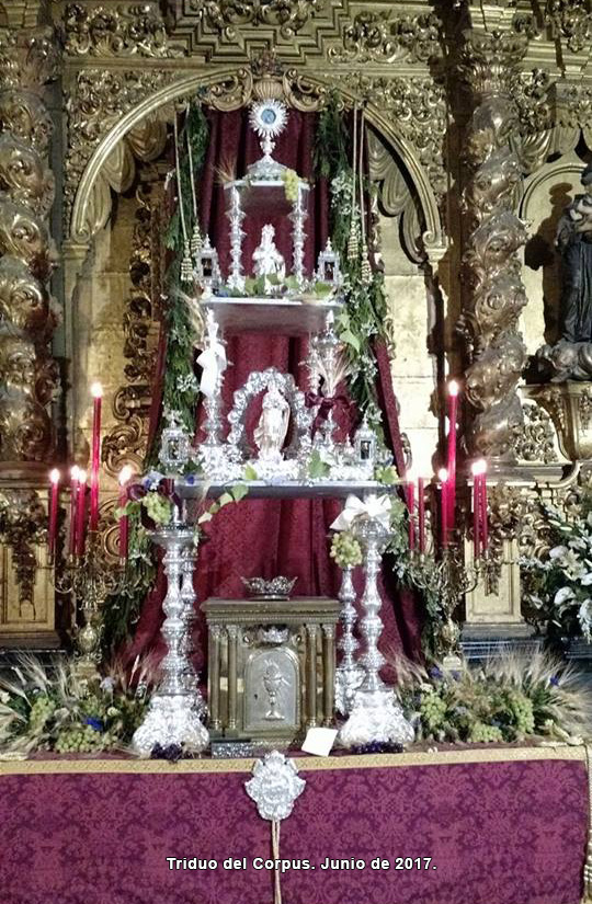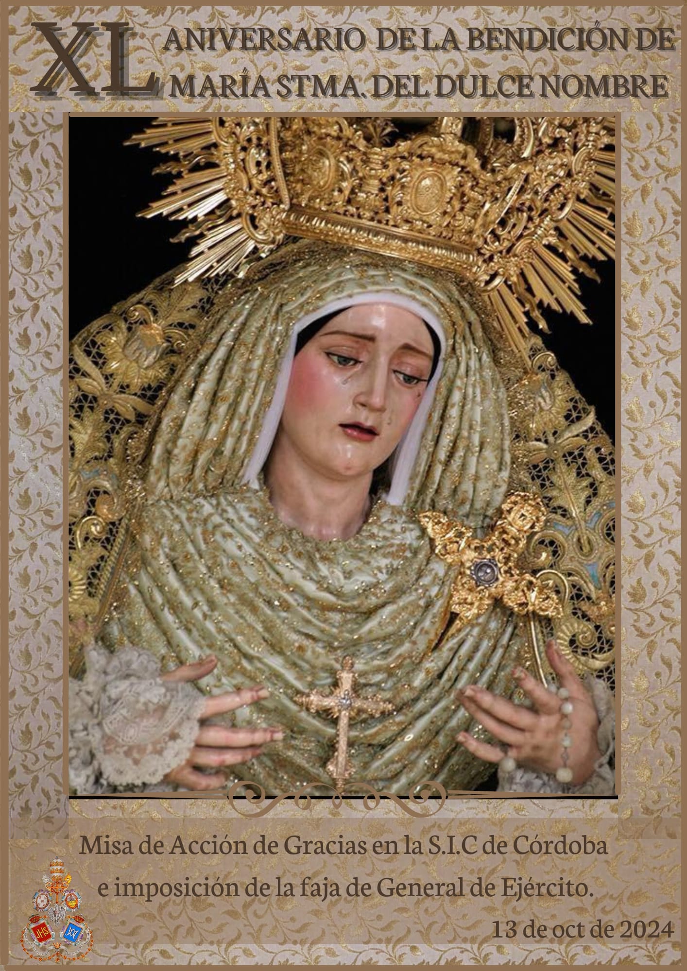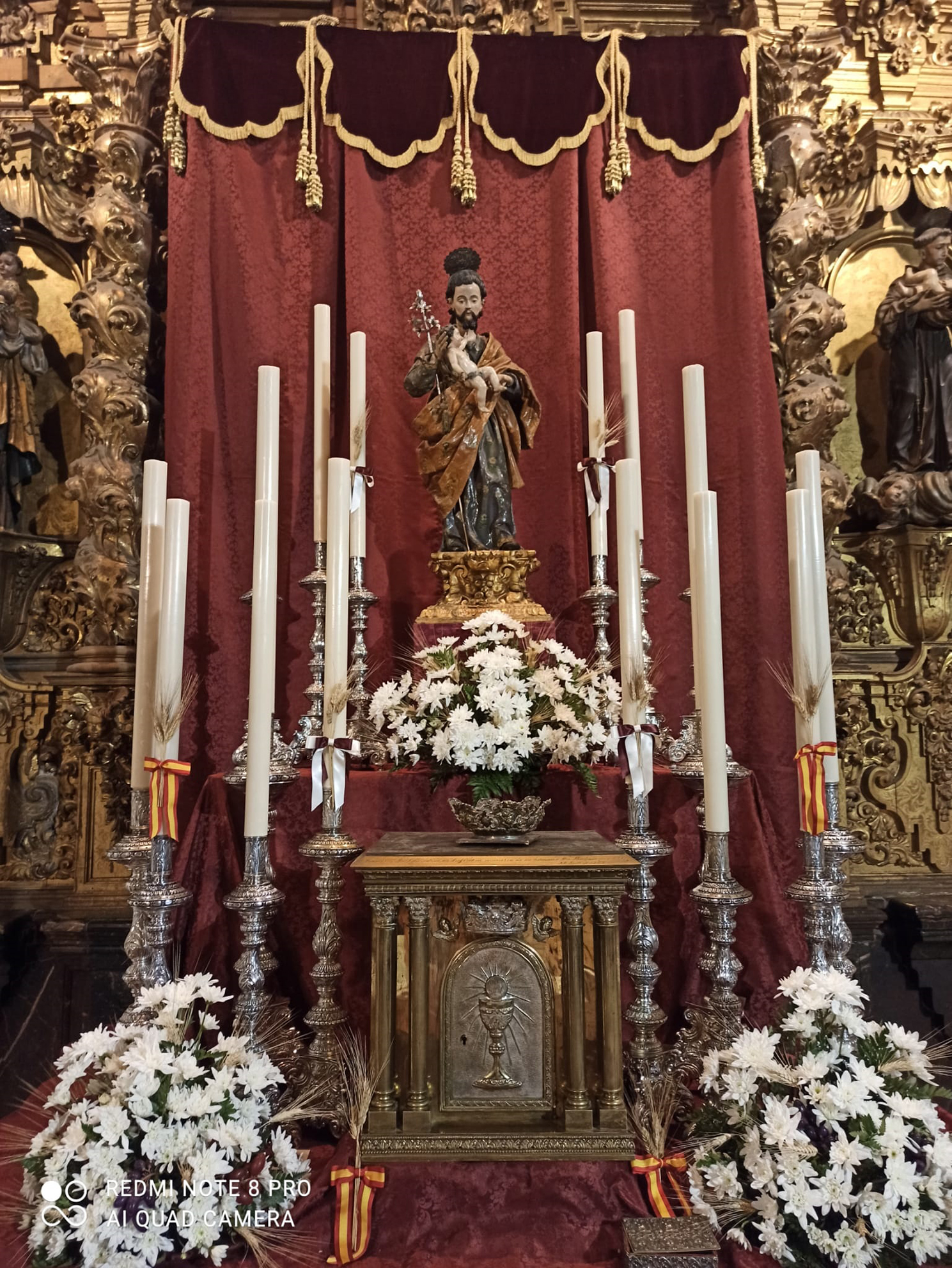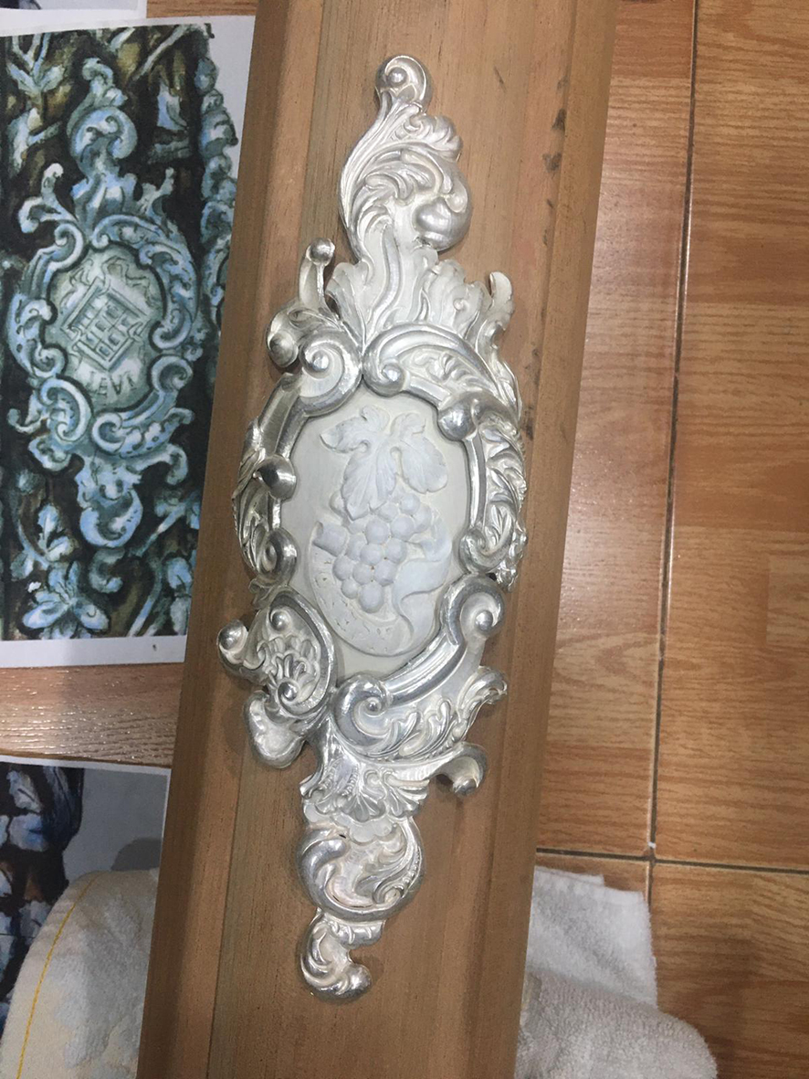 Como principal novedad, se incorporan nuevos elementos decorativos realizados por N.H.D. Julio Cachinero. Estas piezas comprenden el remate del dosel, concebido para aportar mayor elevación y sentido simbólico al conjunto, así como dos tondos ornamentales que enmarcan y equilibran la composición del altar.