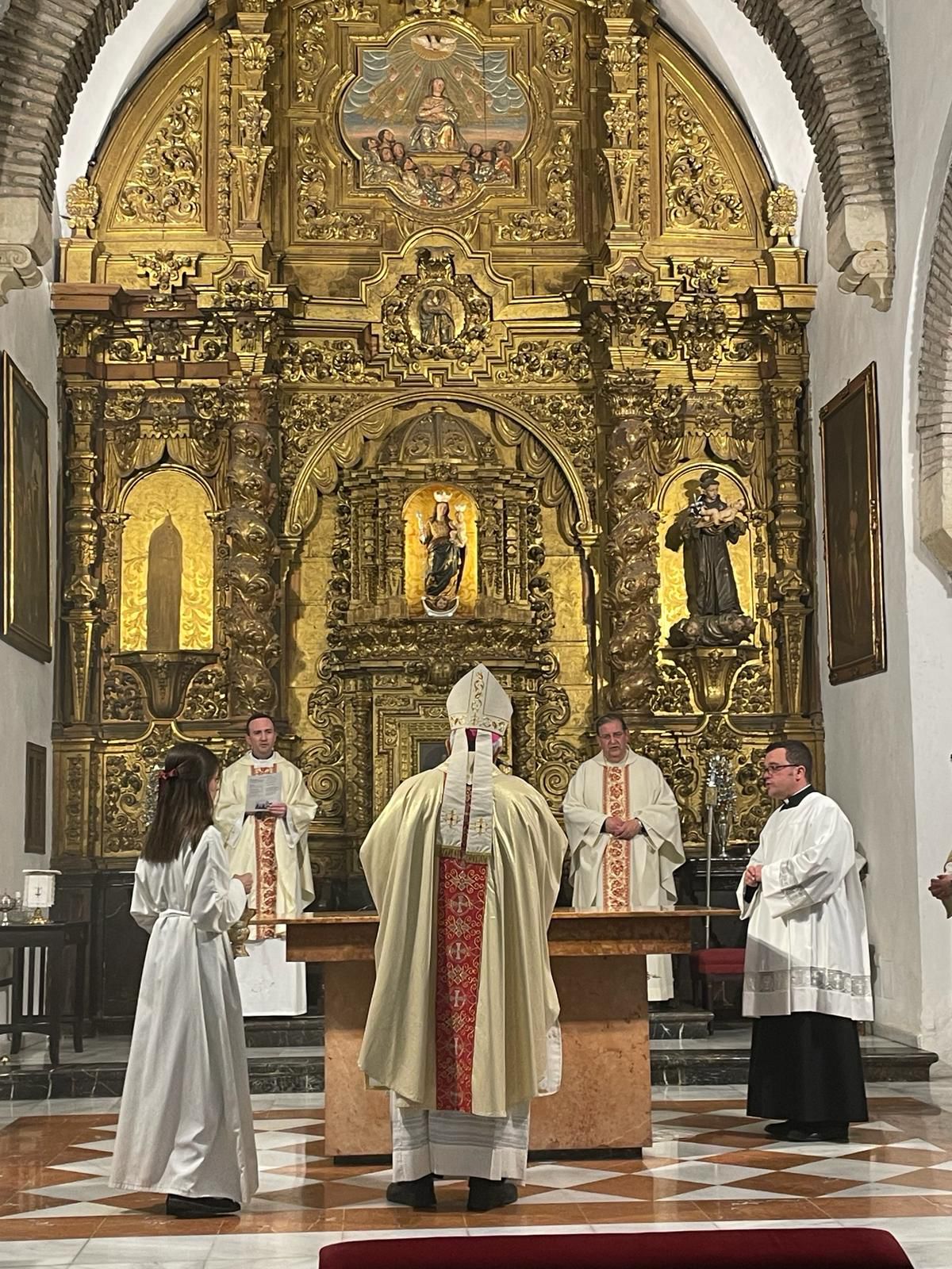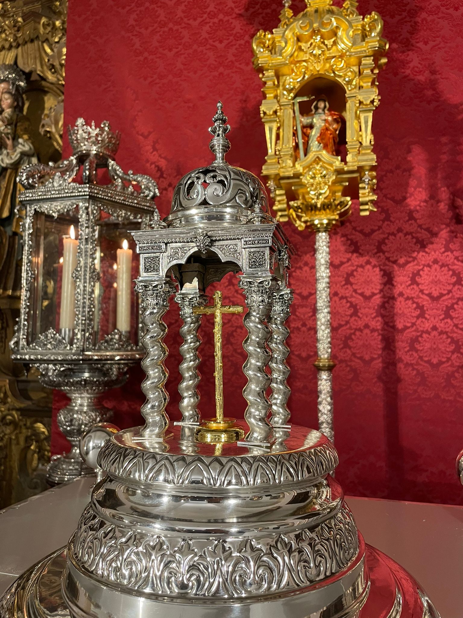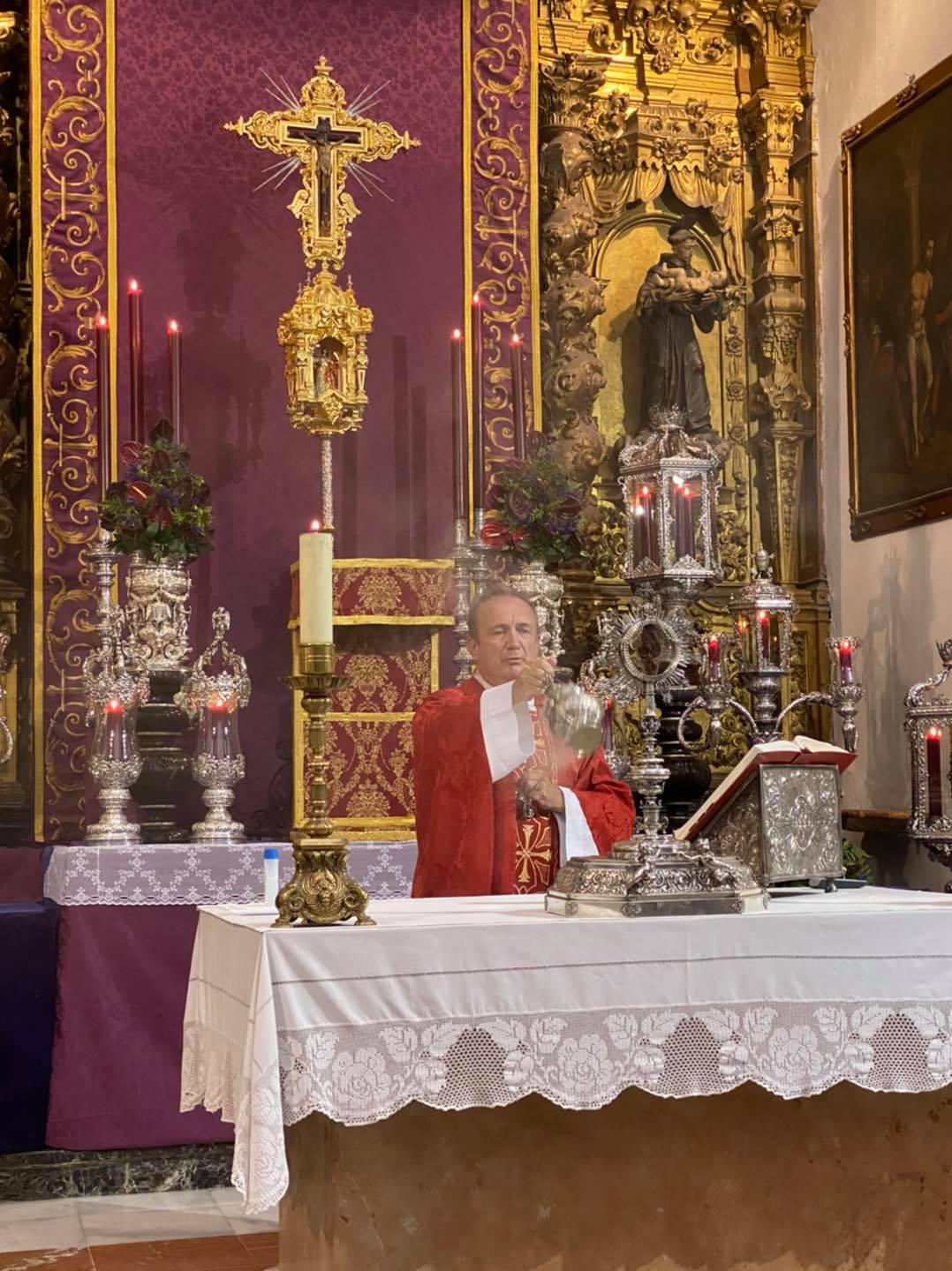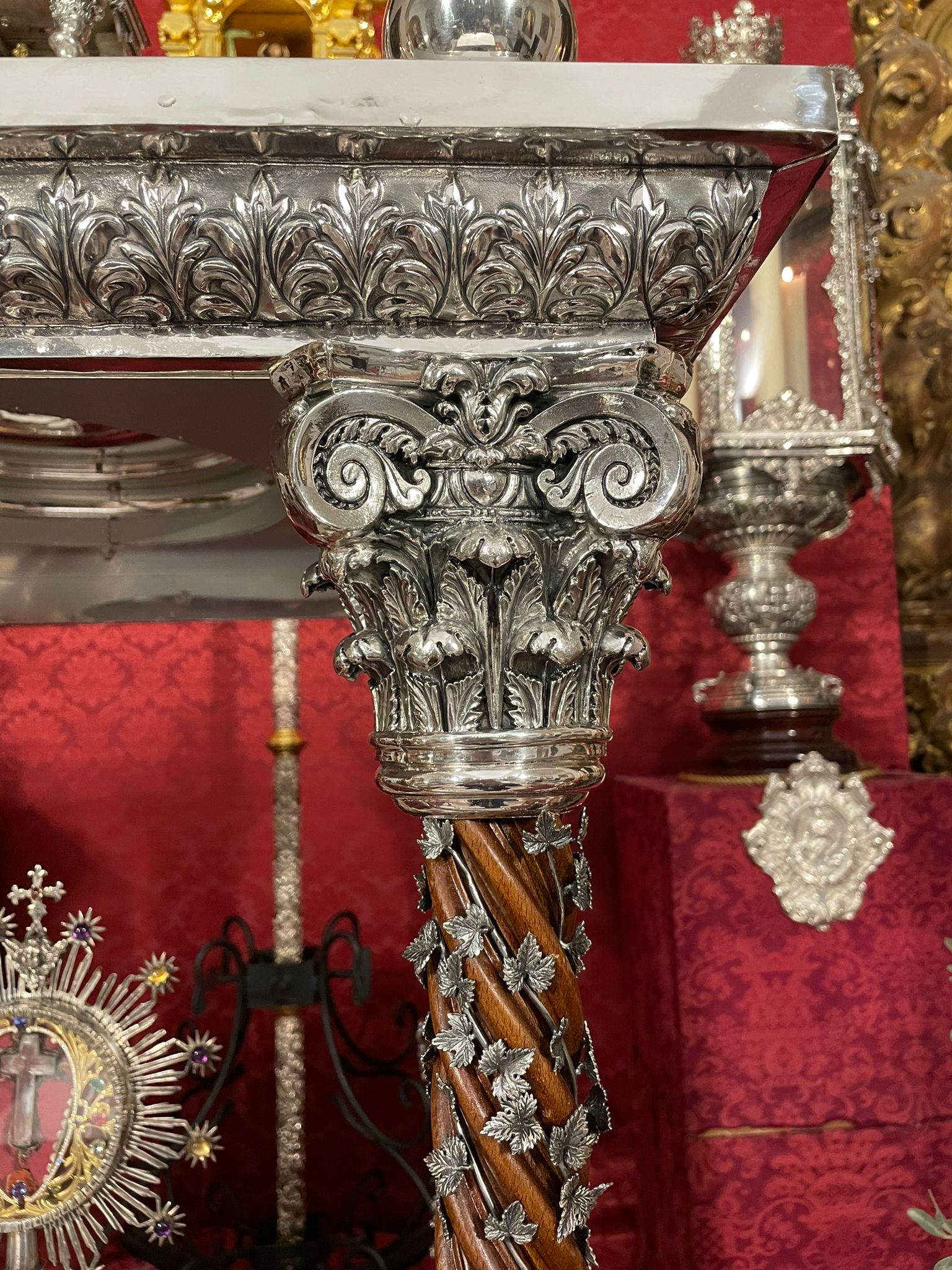 Como principal novedad, se incorporan nuevos elementos decorativos realizados por N.H.D. Julio Cachinero. Estas piezas comprenden el remate del dosel, concebido para aportar mayor elevación y sentido simbólico al conjunto, así como dos tondos ornamentales que enmarcan y equilibran la composición del altar.