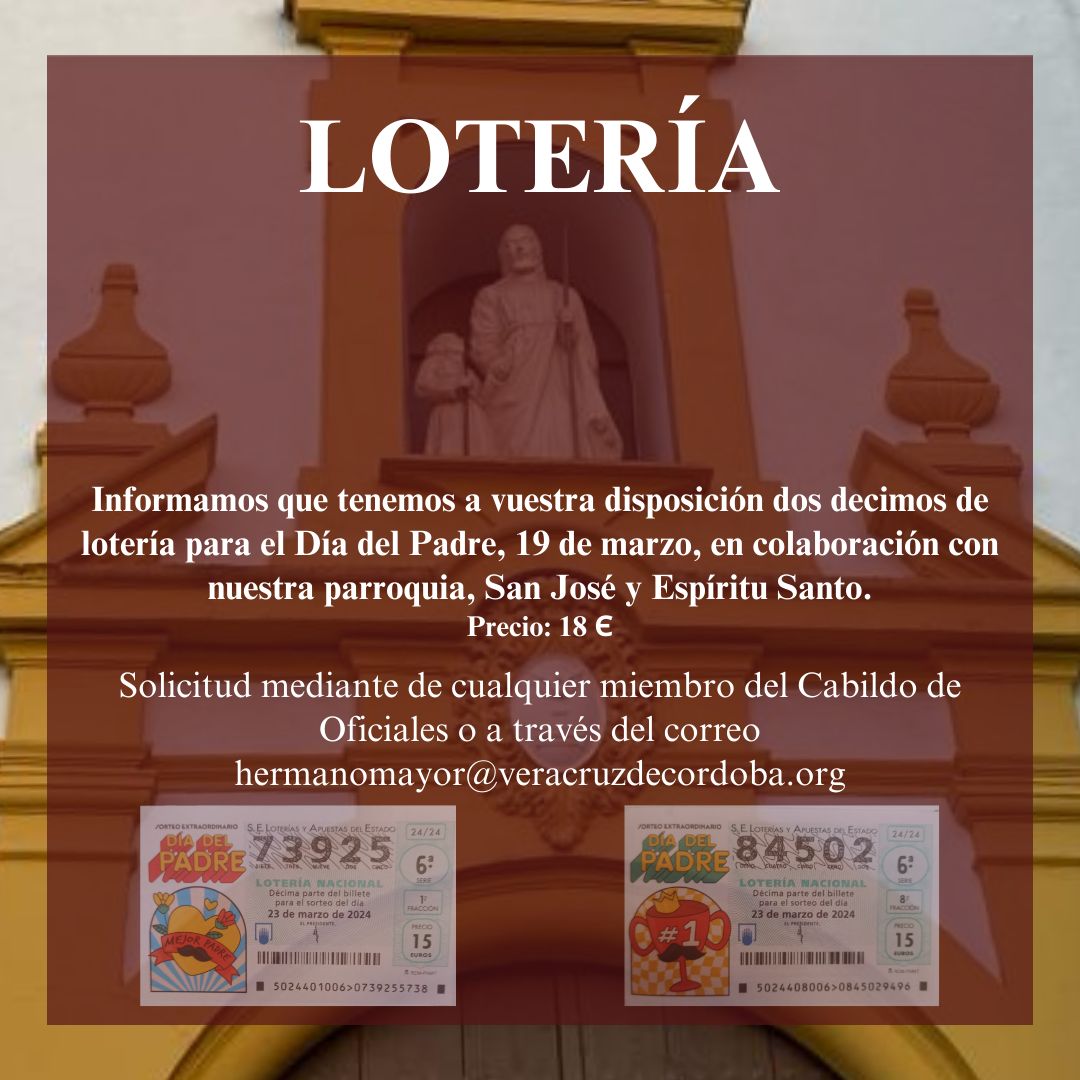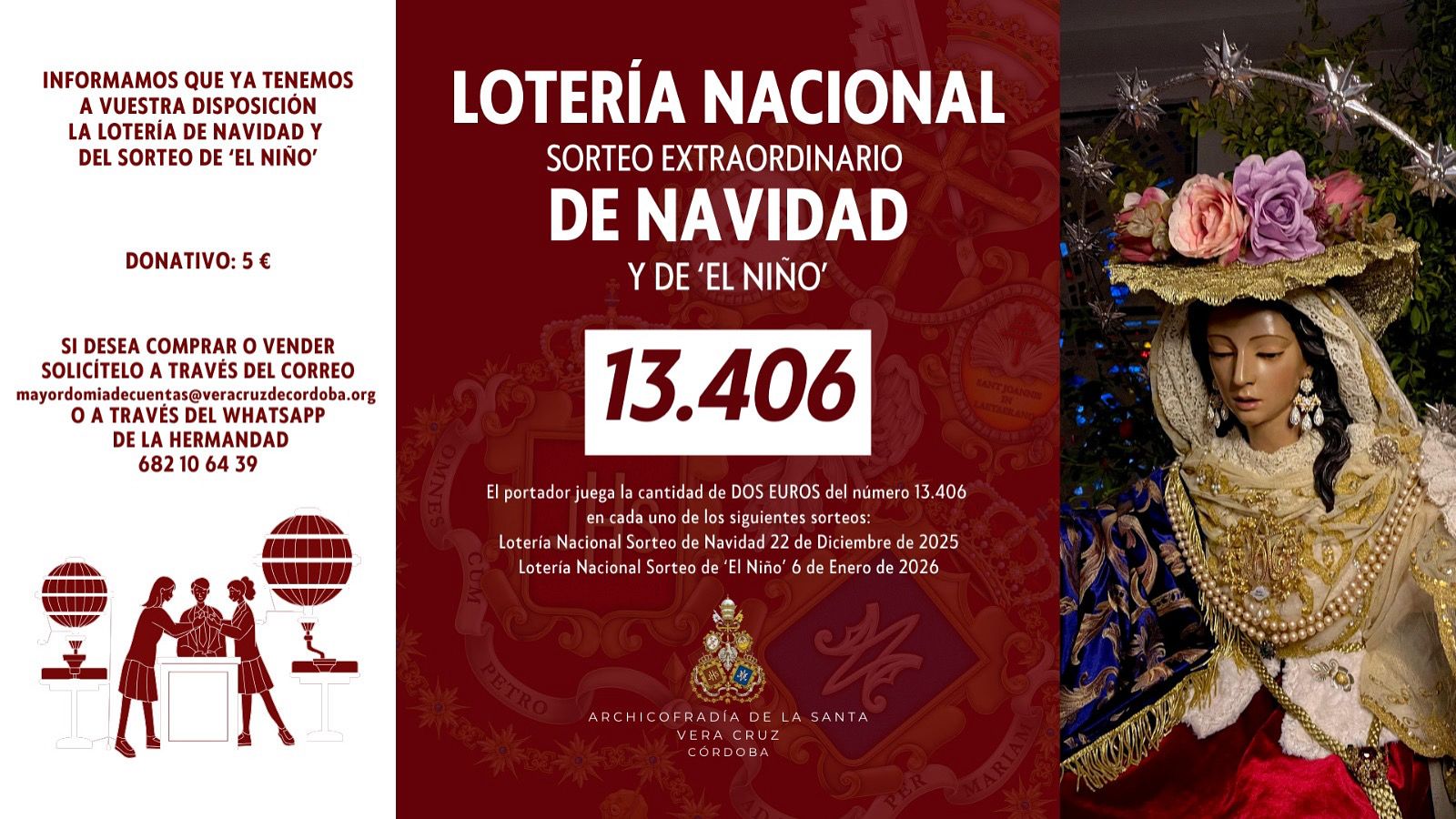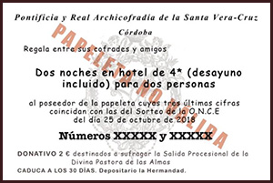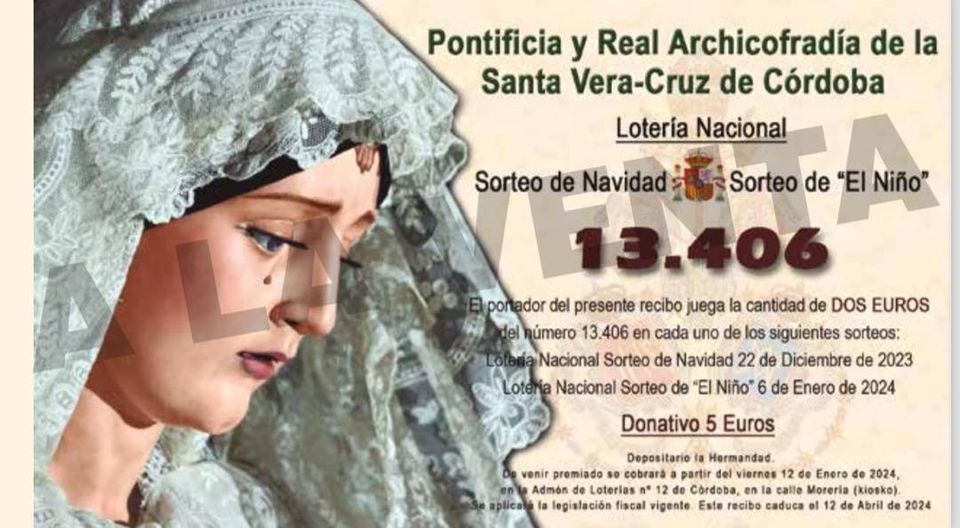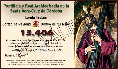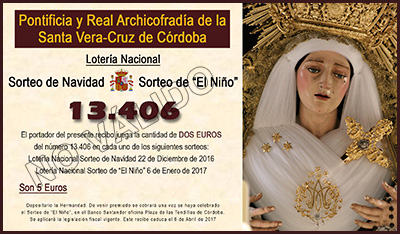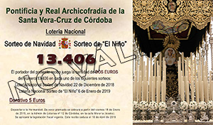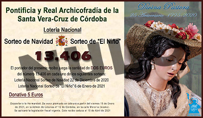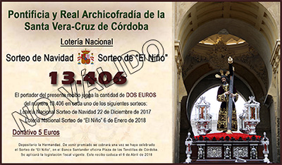 Como todos los años nuestra Archicofradía participará en los sorteos de Navidad del 22 de diciembre y en el sorteo de El Niño del 6 de enero. Con tal motivo ya se pueden adquirir las participaciones del número 13406 que la Hermandad ha realizado. Recordar que con la misma papeleta se participa en ambos sorteos. ¡¡ Mucha suerte a todos !!