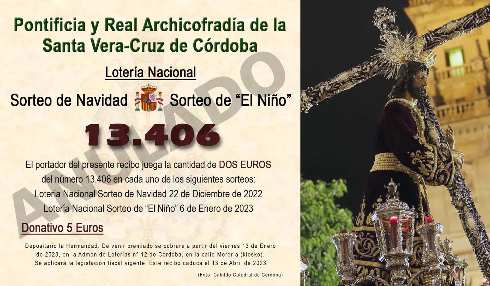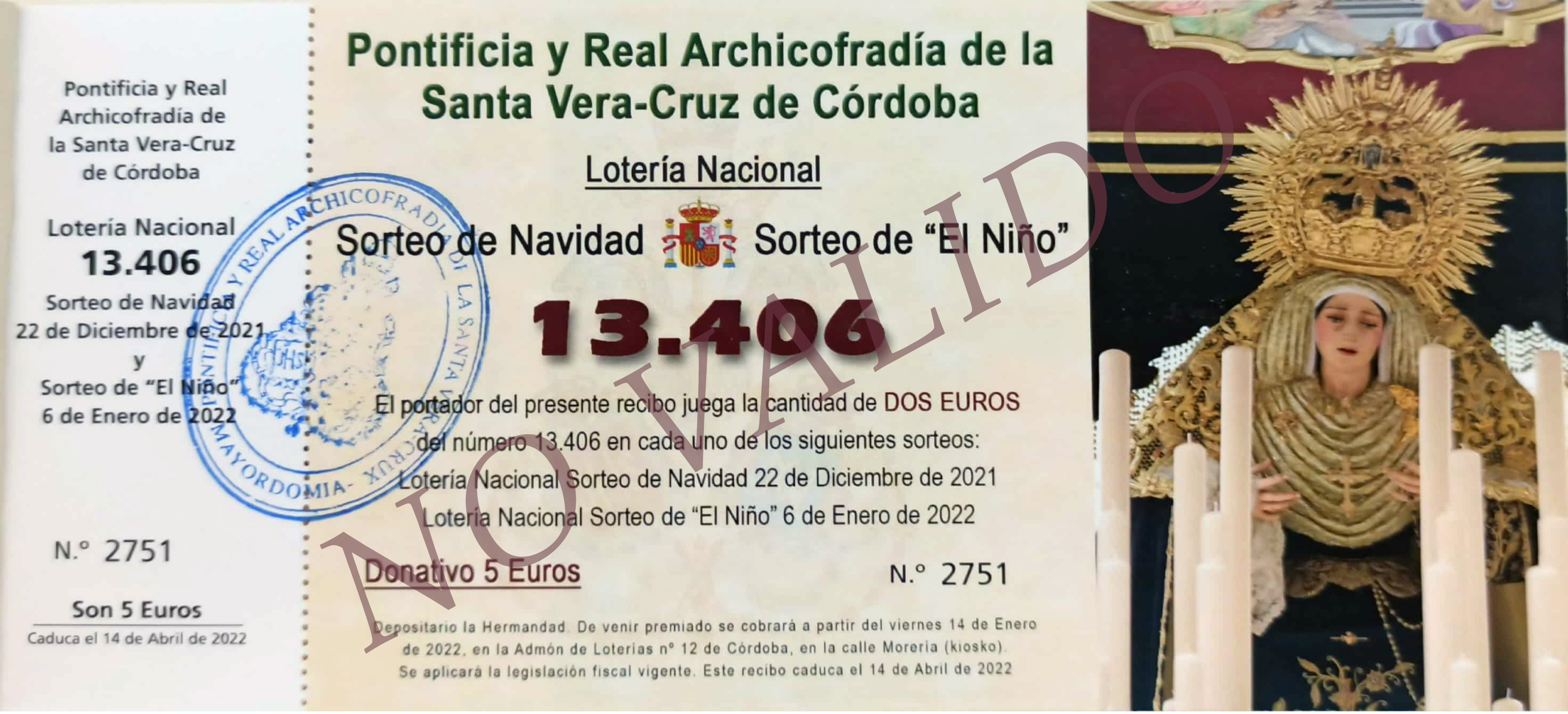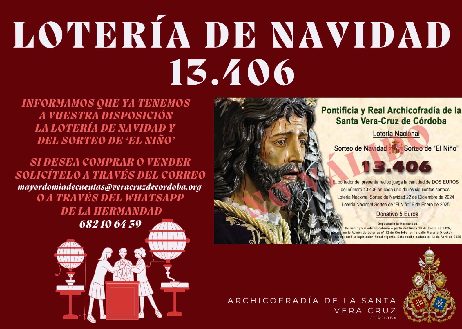 Como todos los años nuestra Archicofradía participará en los sorteos de Navidad del 22 de diciembre y en el sorteo de El Niño del 6 de enero. Con tal motivo ya se pueden adquirir las participaciones del número 13406 que la Hermandad ha realizado. Recordar que con la misma papeleta se participa en ambos sorteos. ¡¡ Mucha suerte a todos !!