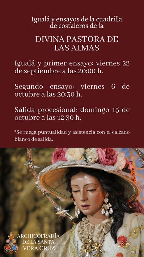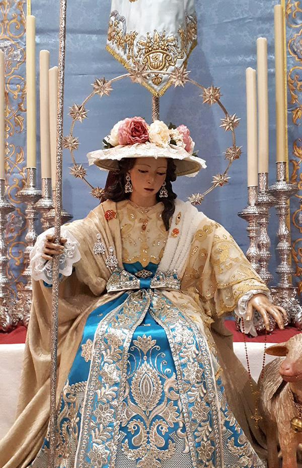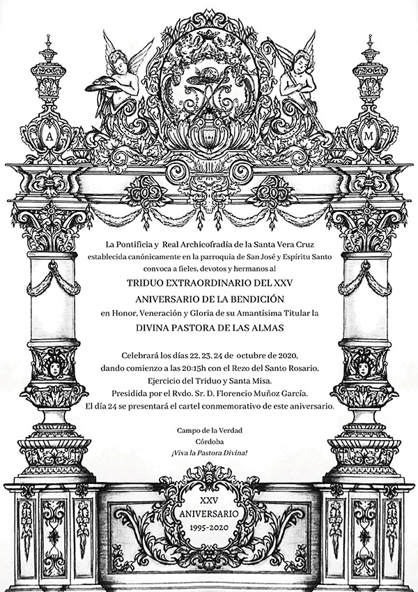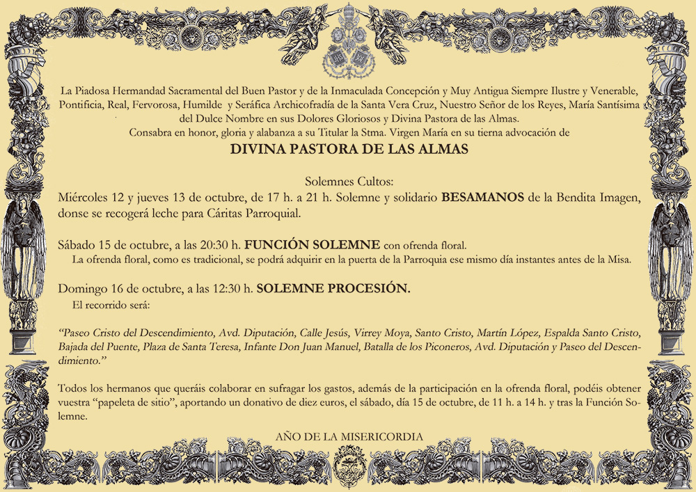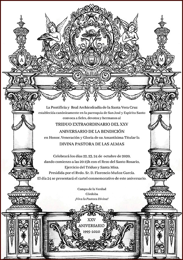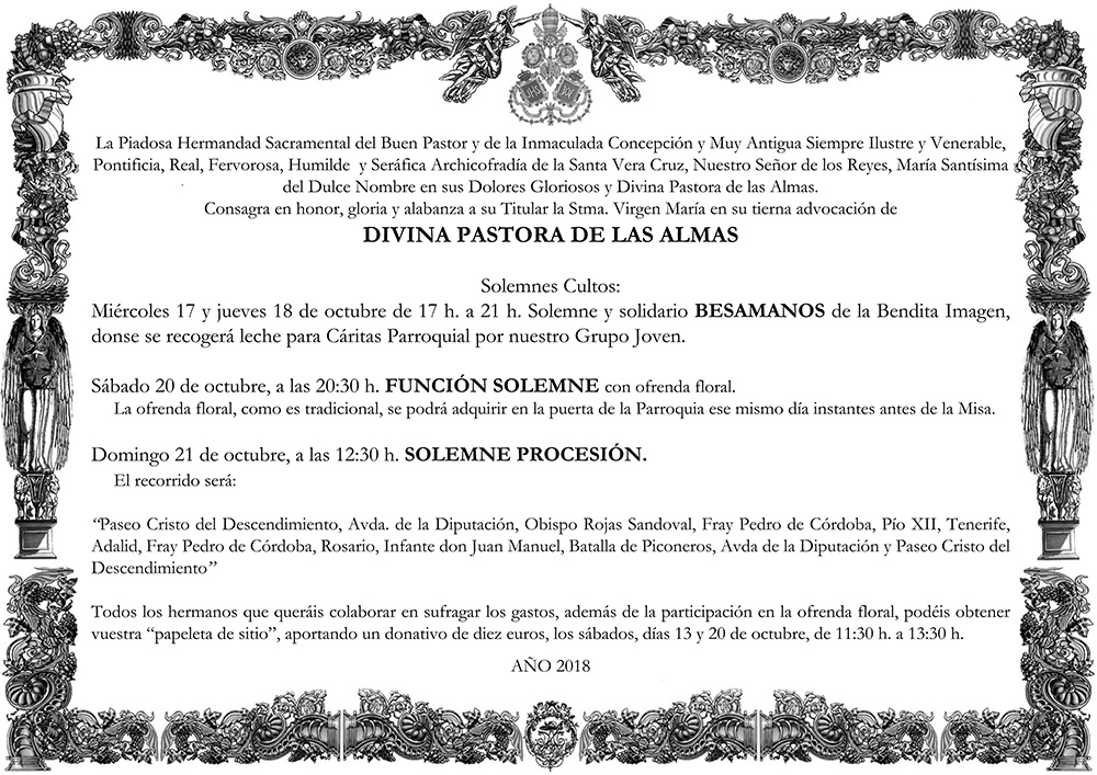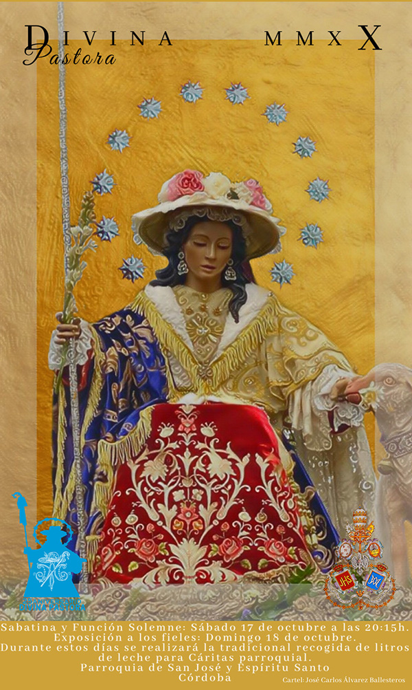 Nos adentramos de lleno en los días grandes en torno a la Divina Pastora de las Almas, Titular de Gloria de nuestra Archicofradía. Así, el sábado 15 de octubre celebramos la Función Principal en Su honor a las 20:30 horas en nuestra Parroquia. Durante la misma se realizará la ofrenda de flores que serán depositadas ante Ella, que ya estará entronizada en Su Paso. Las flores podrán ser adquiridas en la puerta de la Parroquia antes del comienzo de la Santa Misa. La Función Principal será armonizada musicalmente por el Coro Yerbabuena.