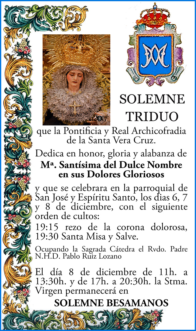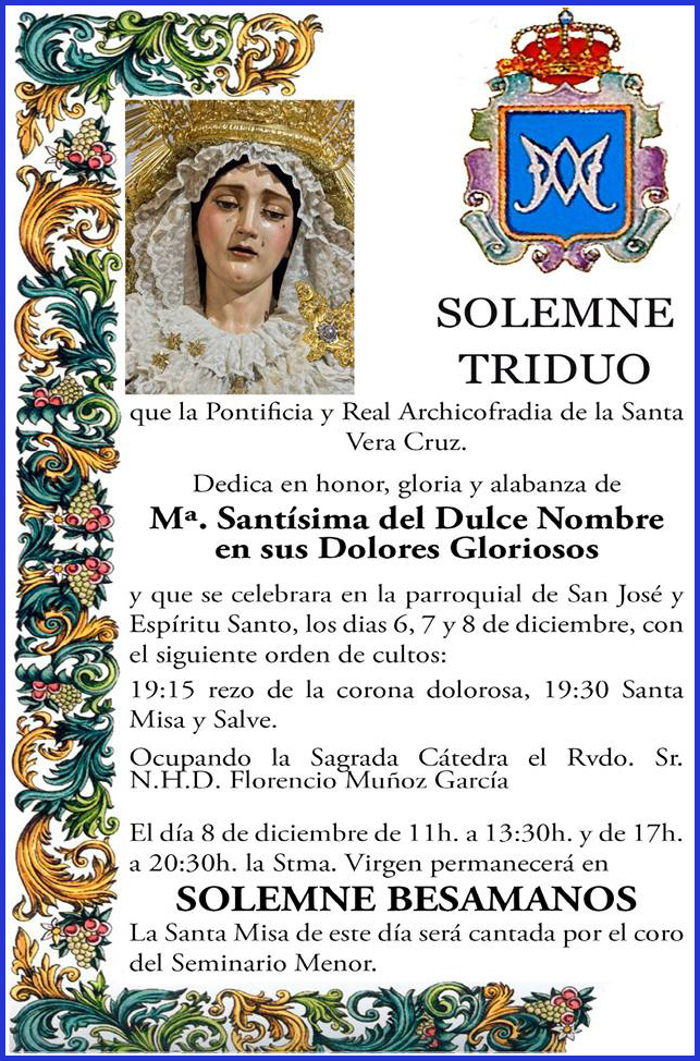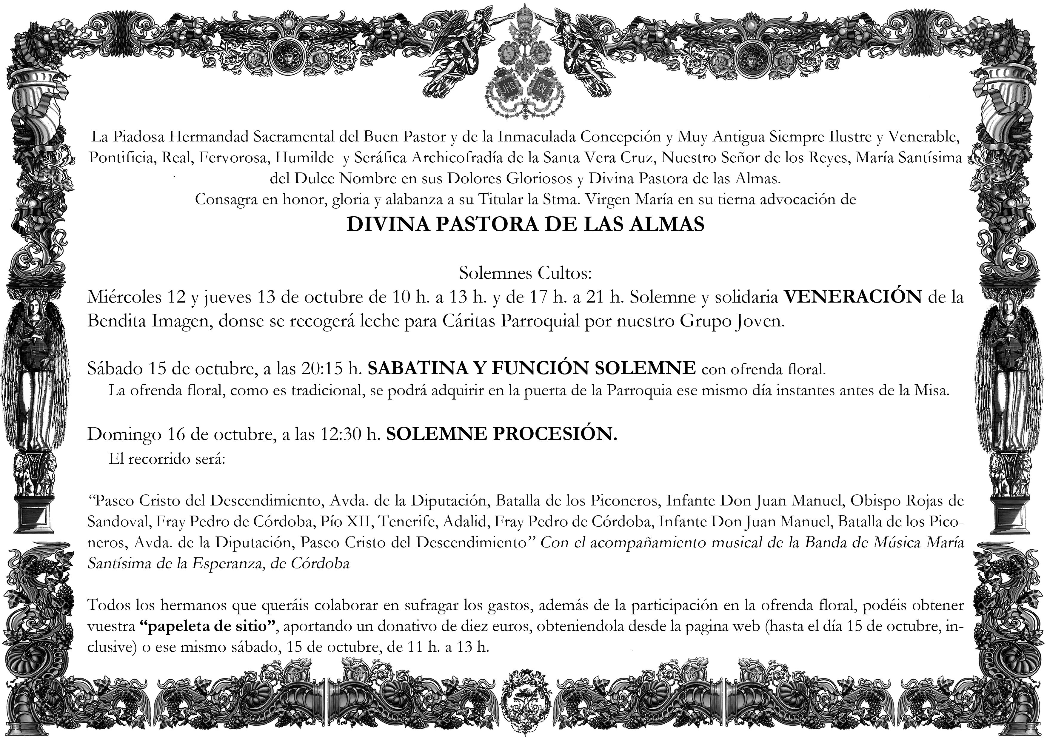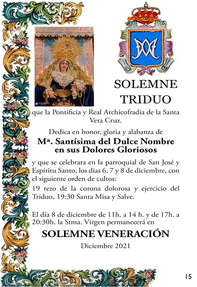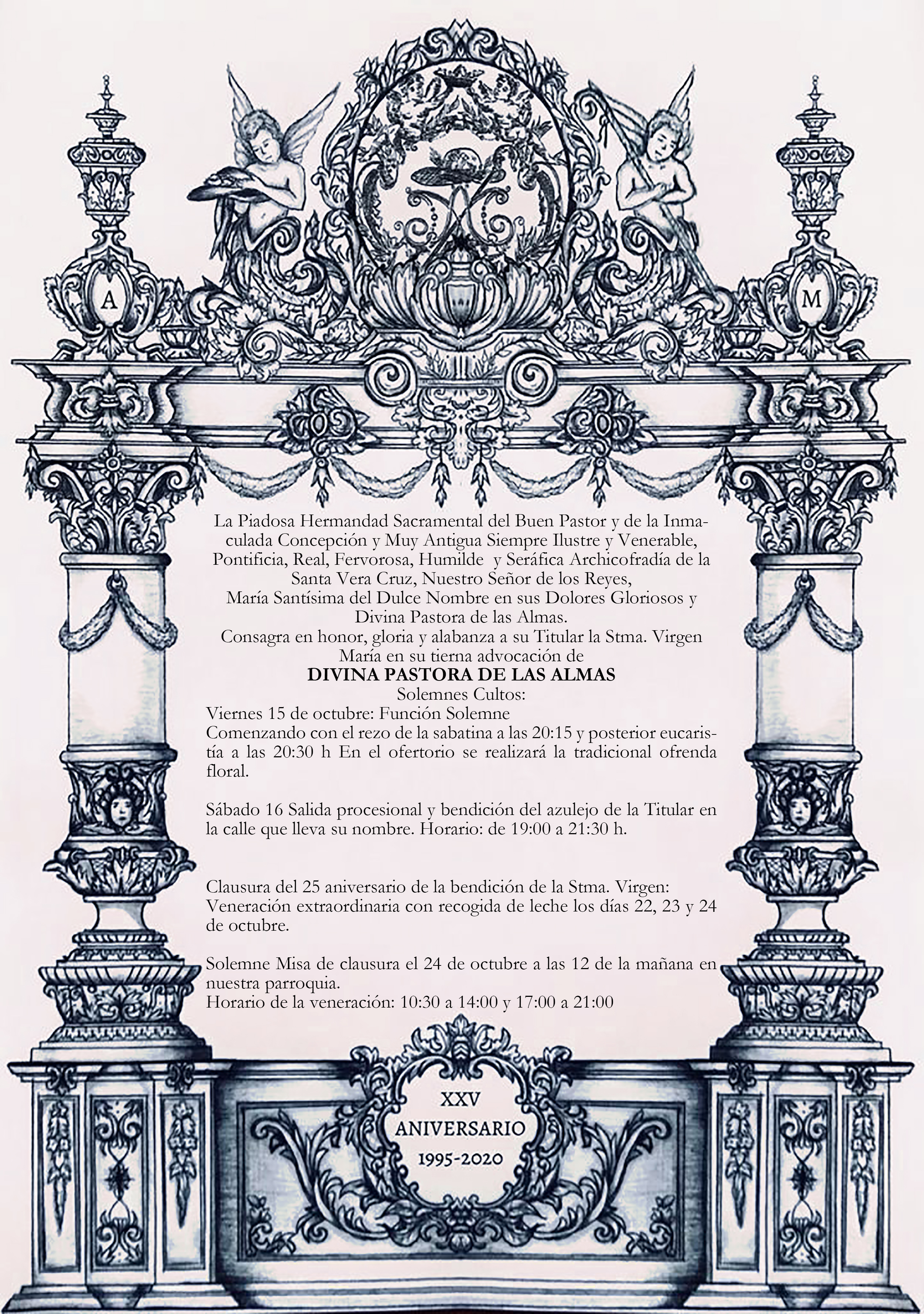 Nos adentramos de lleno en los días grandes en torno a la Divina Pastora de las Almas, Titular de Gloria de nuestra Archicofradía. Así, el sábado 15 de octubre celebramos la Función Principal en Su honor a las 20:30 horas en nuestra Parroquia. Durante la misma se realizará la ofrenda de flores que serán depositadas ante Ella, que ya estará entronizada en Su Paso. Las flores podrán ser adquiridas en la puerta de la Parroquia antes del comienzo de la Santa Misa. La Función Principal será armonizada musicalmente por el Coro Yerbabuena.
