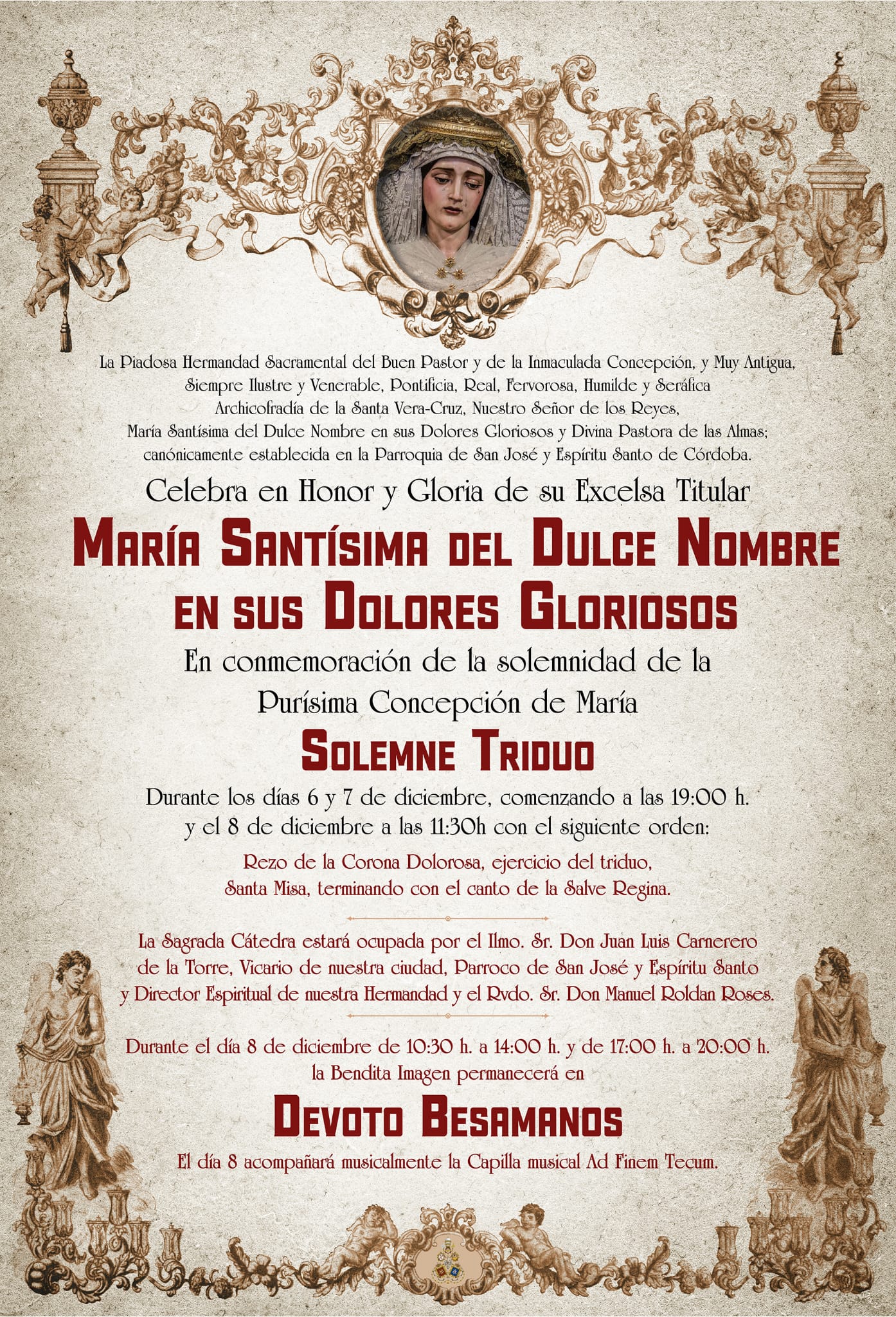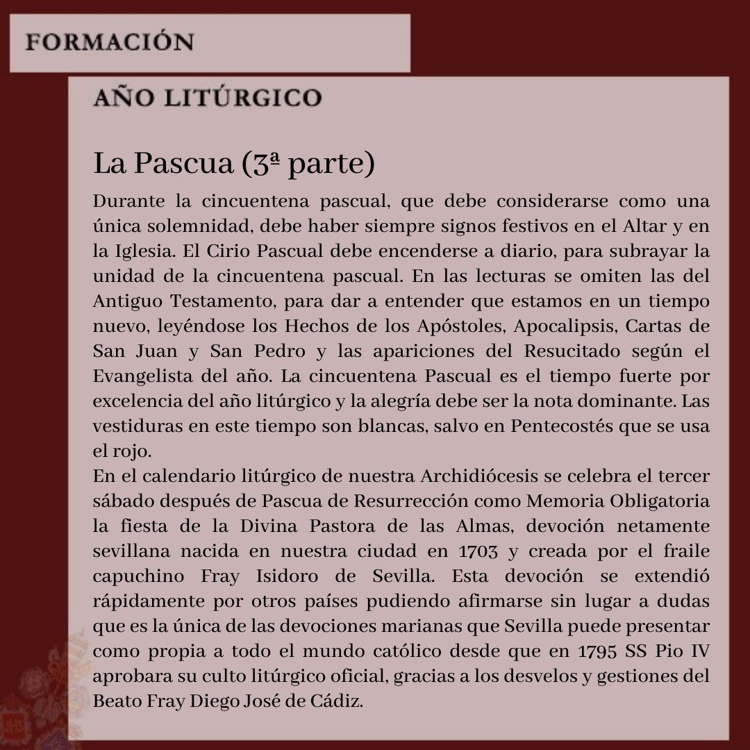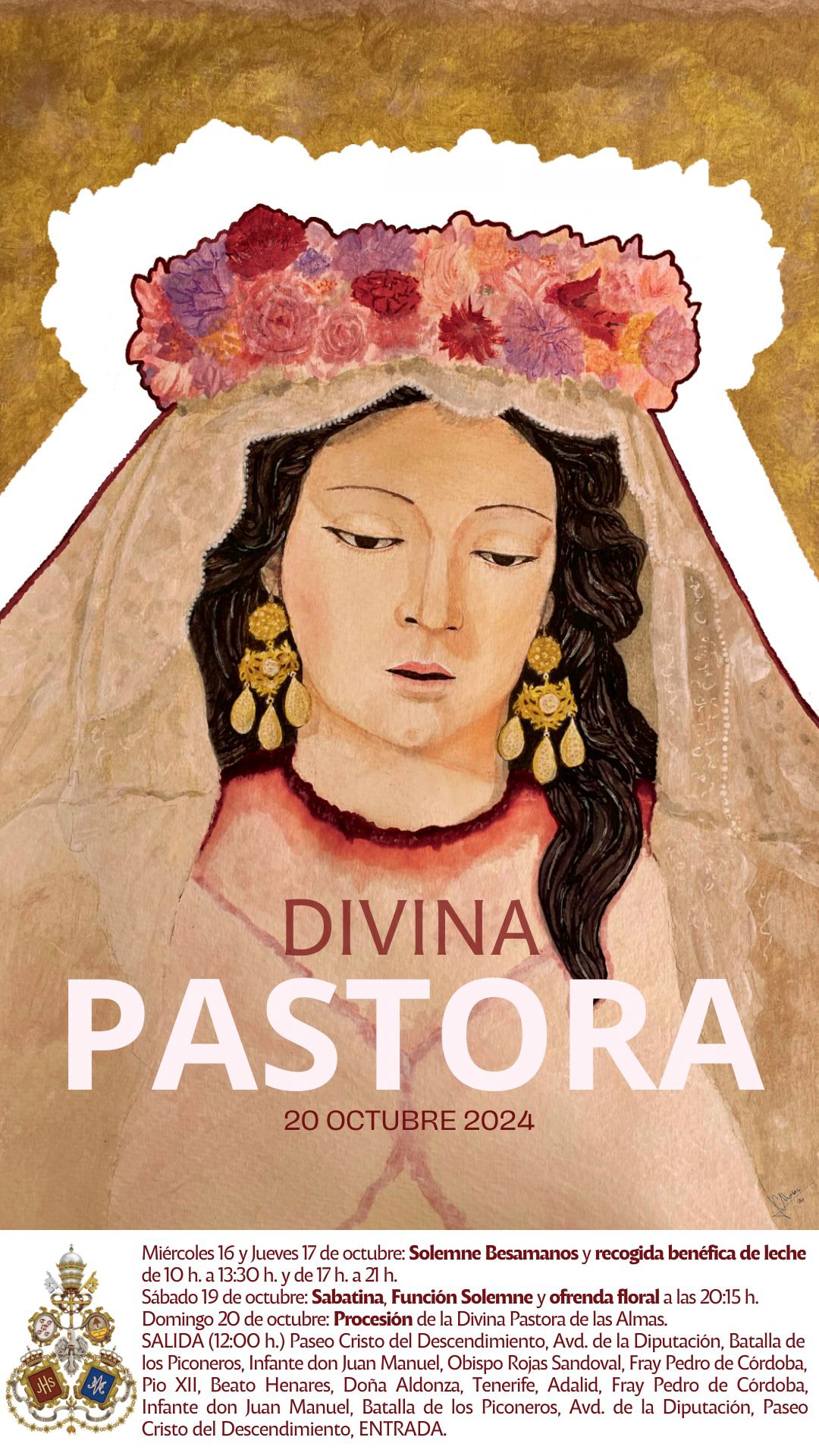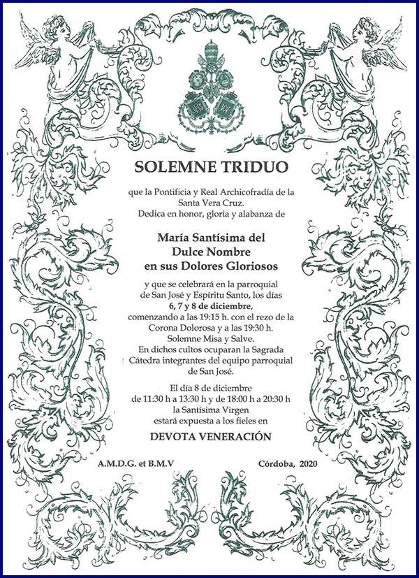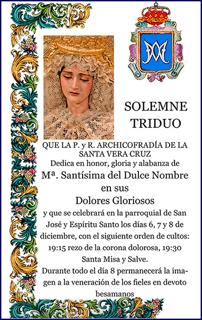 Nos adentramos de lleno en los días grandes en torno a la Divina Pastora de las Almas, Titular de Gloria de nuestra Archicofradía. Así, el sábado 15 de octubre celebramos la Función Principal en Su honor a las 20:30 horas en nuestra Parroquia. Durante la misma se realizará la ofrenda de flores que serán depositadas ante Ella, que ya estará entronizada en Su Paso. Las flores podrán ser adquiridas en la puerta de la Parroquia antes del comienzo de la Santa Misa. La Función Principal será armonizada musicalmente por el Coro Yerbabuena.