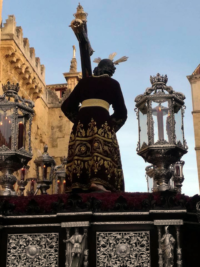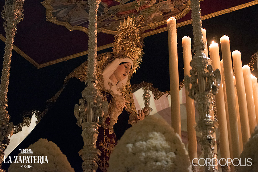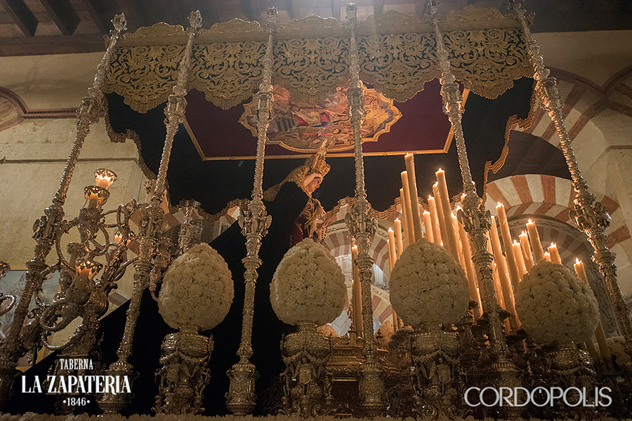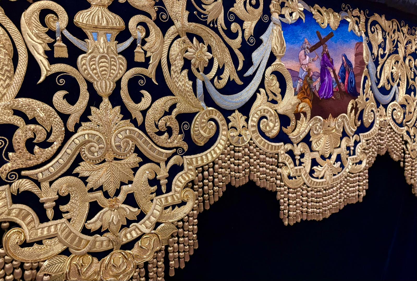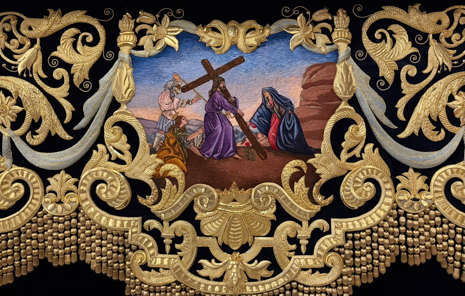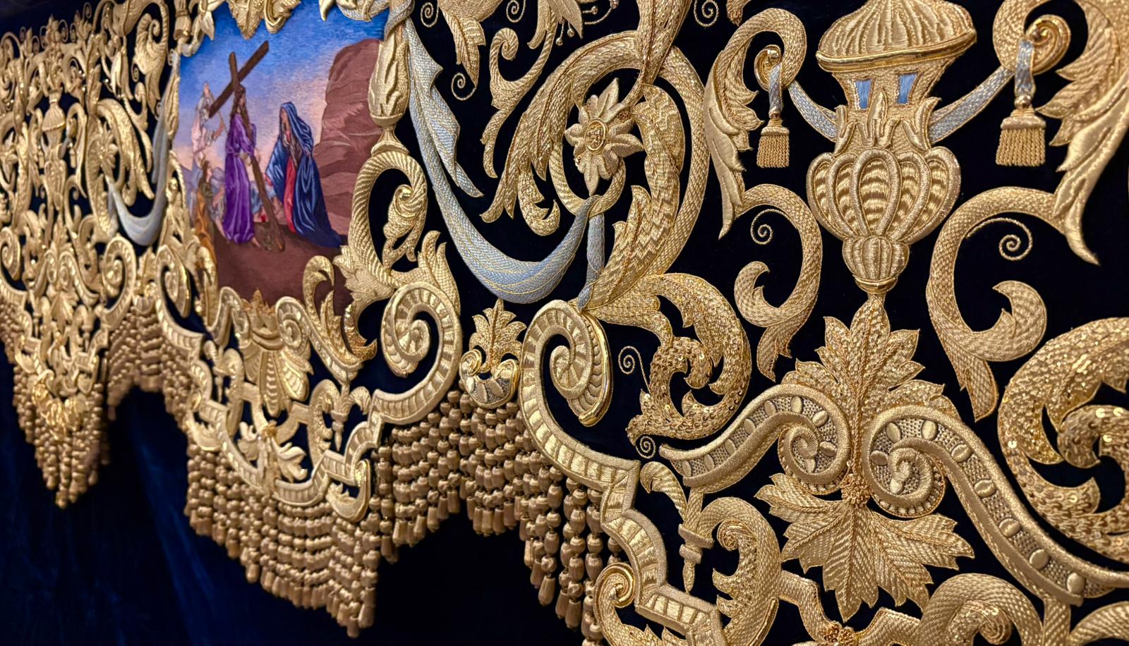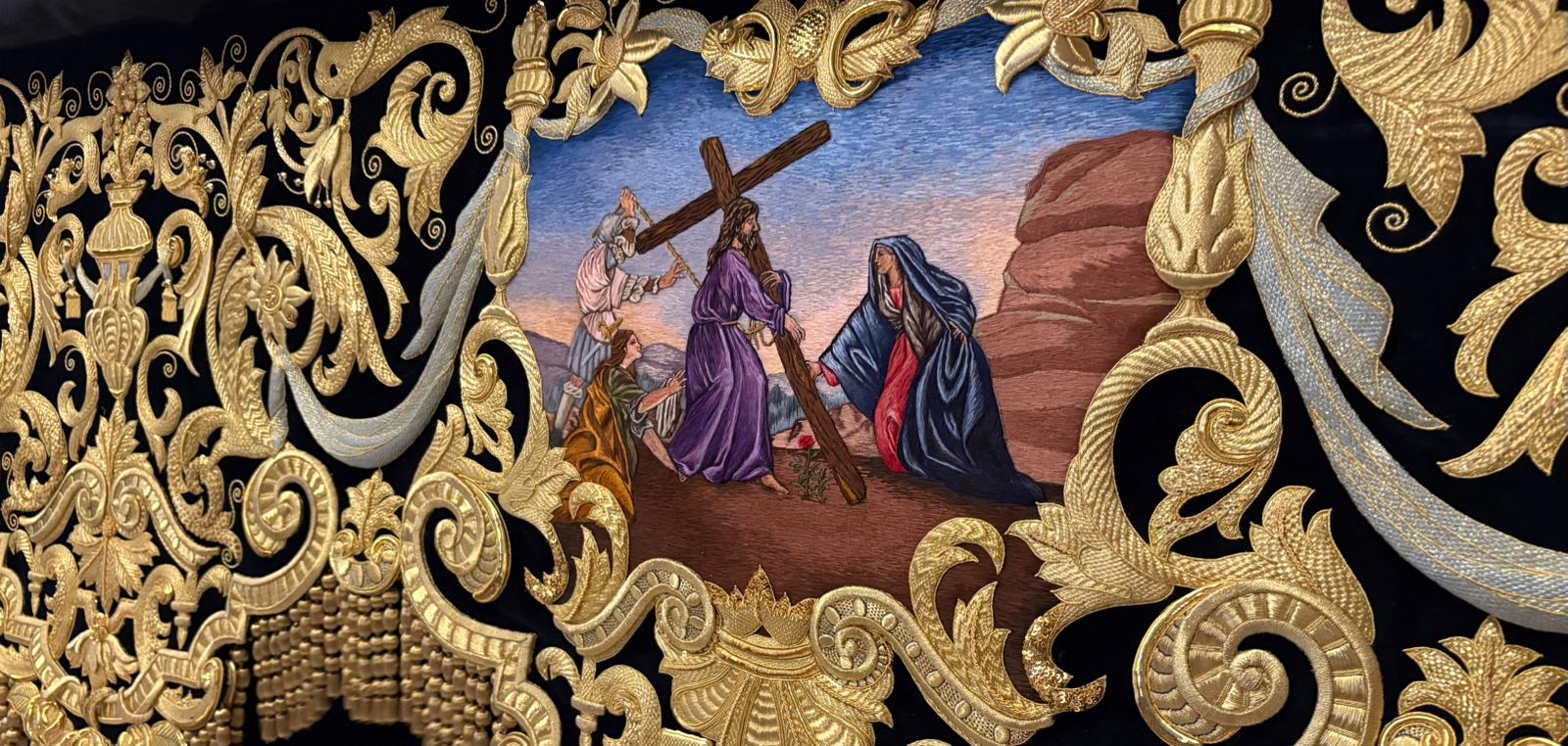 En el centro puede apreciarse una gran orla bordada en sedas de colores, siguiendo el dibujo original del pintor cordobés Raúl Muñoz, que representa el encuentro de la Virgen con su Hijo en la calle de la Amargura. La imagen de Cristo recuerda iconográficamente al Señor de los Reyes.
