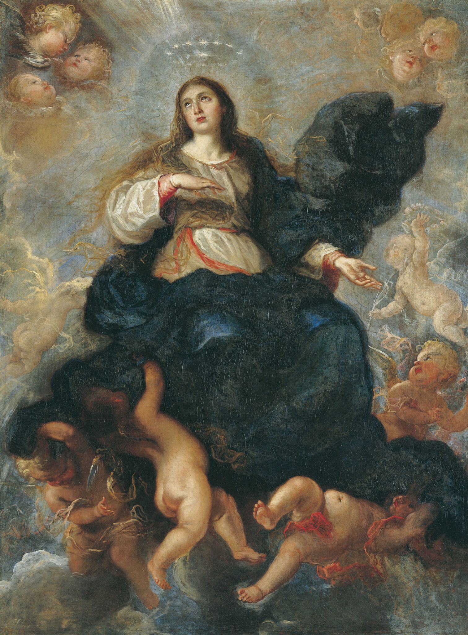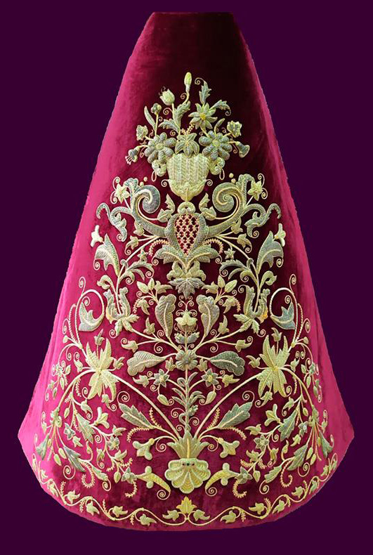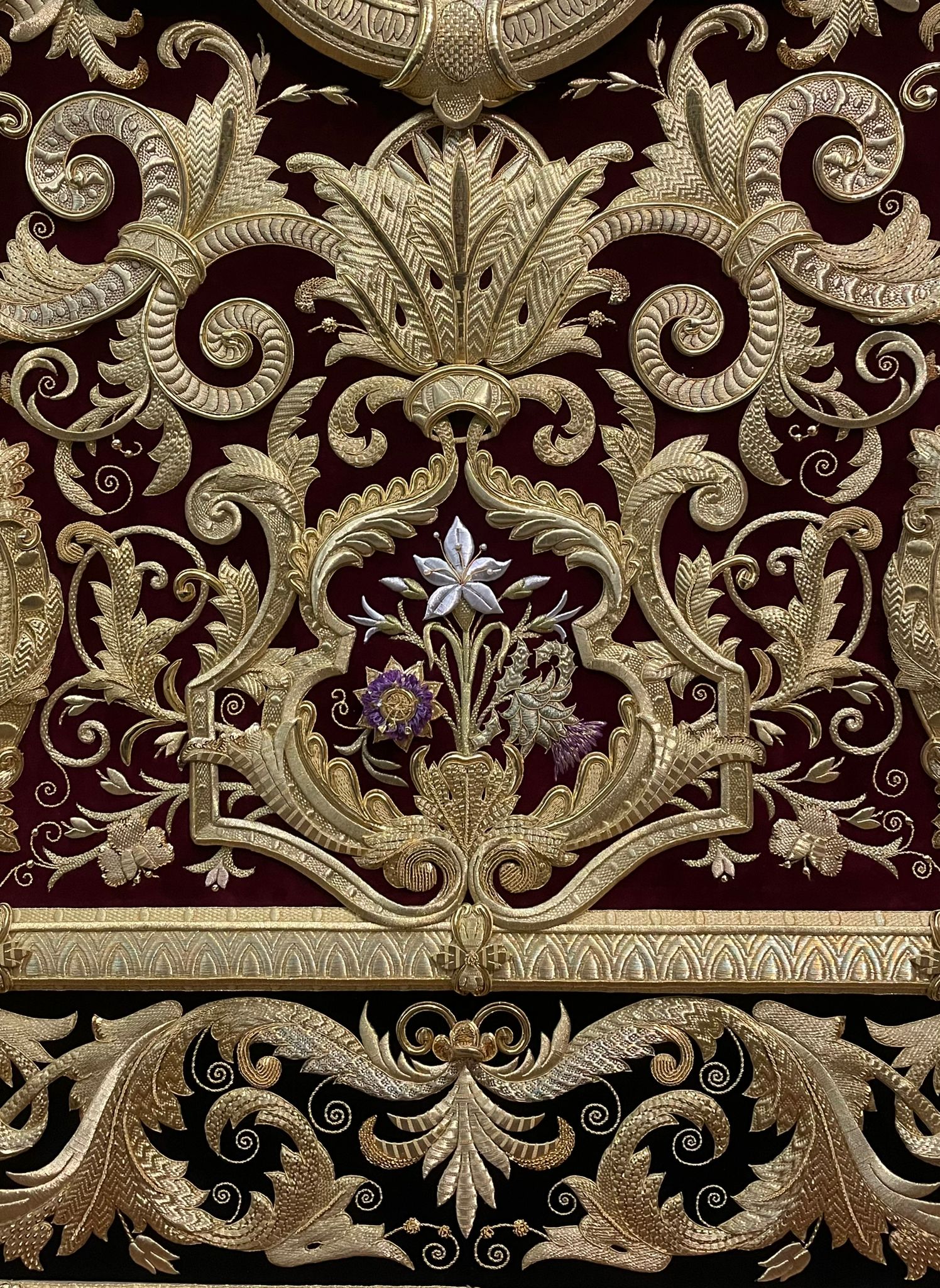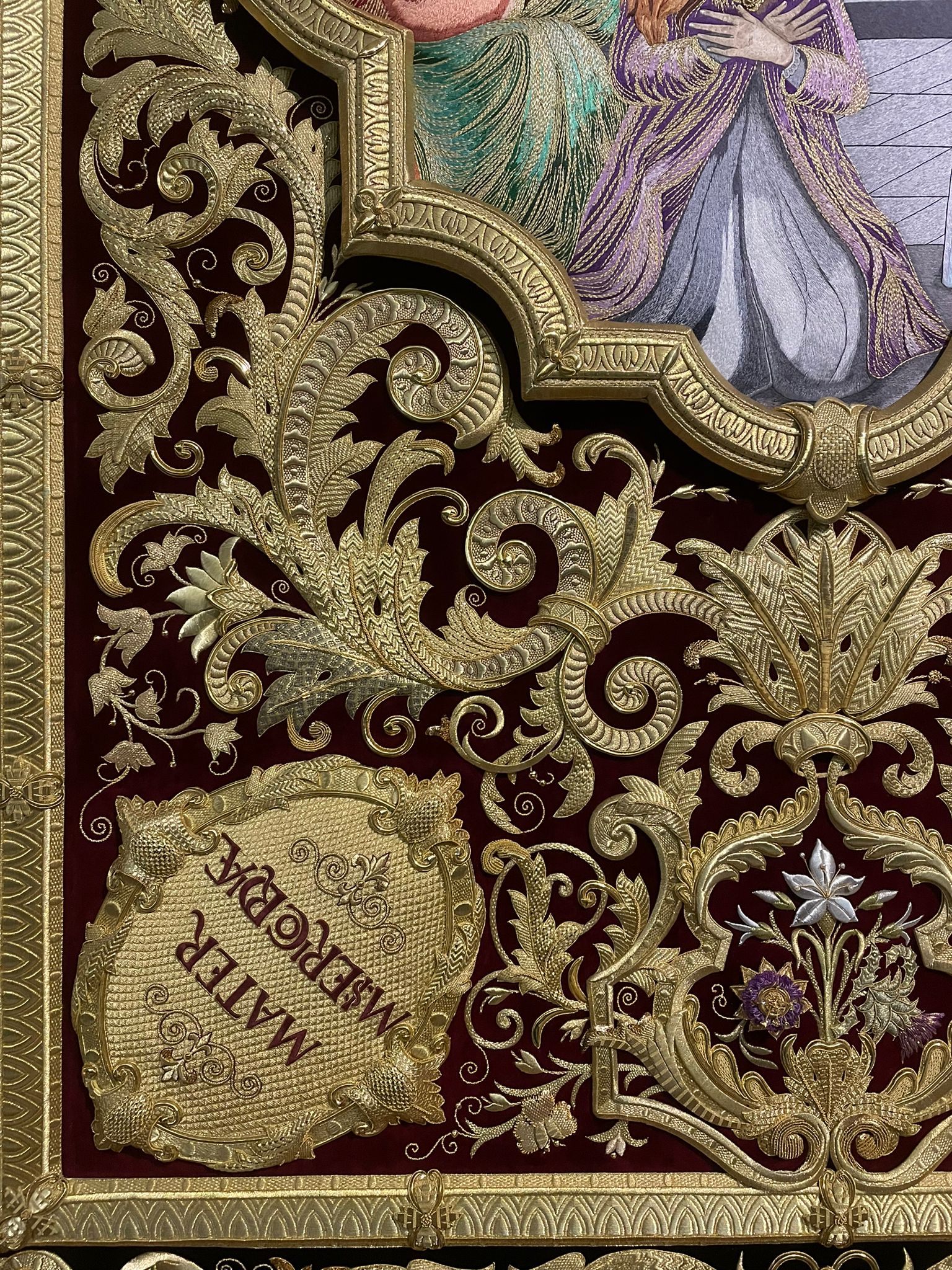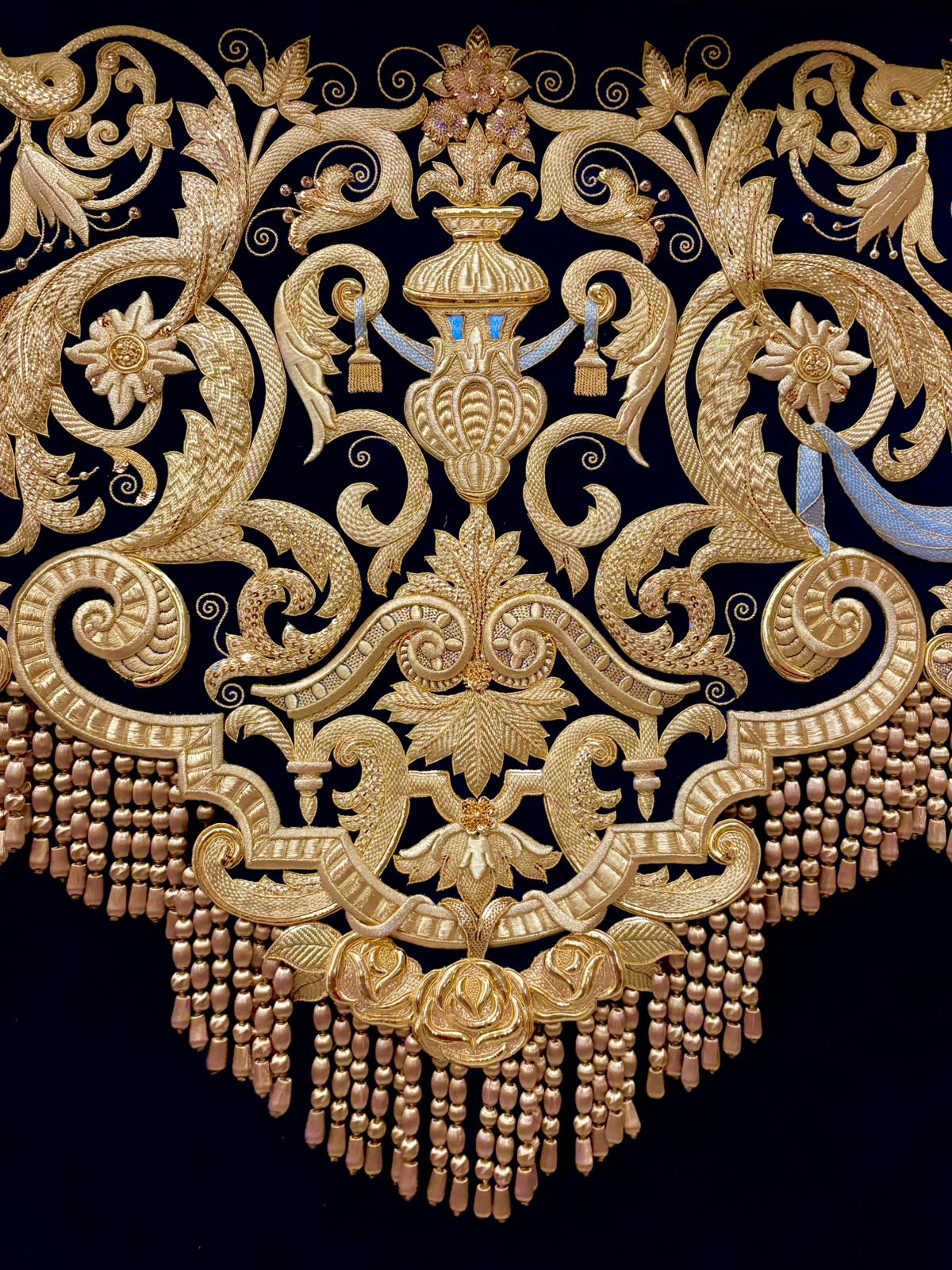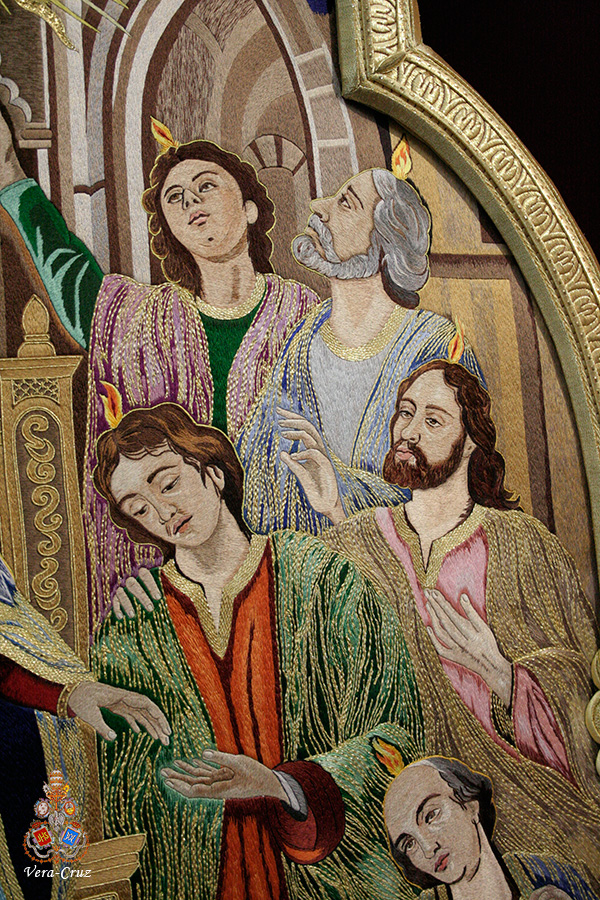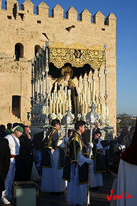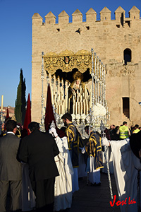 En el centro puede apreciarse una gran orla bordada en sedas de colores, siguiendo el dibujo original del pintor cordobés Raúl Muñoz, que representa el encuentro de la Virgen con su Hijo en la calle de la Amargura. La imagen de Cristo recuerda iconográficamente al Señor de los Reyes.