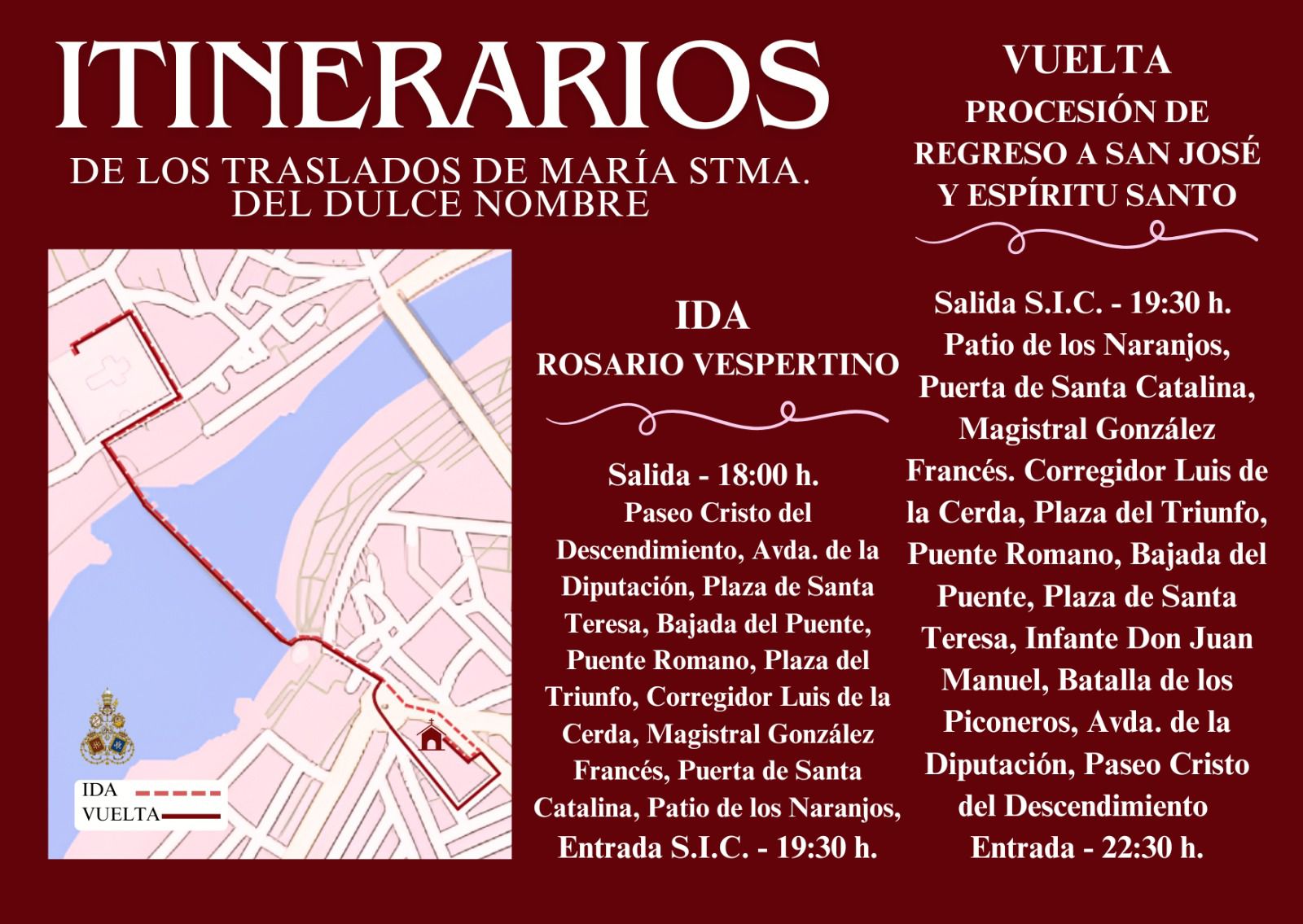El domingo 16 de octubre celebramos la gloriosa Procesión de la Divina Pastora por las calles del Campo de la Verdad. La salida está prevista para las 12:30 horas, al finalizar la Misa dominical de 12:00. Este año el recorrido será principalmente por las calles del barrio antiguo, es decir, en el entorno de la Ermita del Santo Cristo. Así, tras bajar la rampa del Paseo Cristo del Descendimiento, seguirá por Avd Diputación, Jesús, Virrey Moya, Santo Cristo, Martín López, Espalda Santo Cristo, Bajada del Puente, Plaza Santa Teresa, Infante Don Juan Manuel, Batalla de los Piconeros, Avd Diputación, Paseo Cristo del Descendimiento. Mismo recorrido previsto para el año pasado pero que no pudo ser estrenado debido a la suspensión de la salida por la lluvia. Parece que este año sí podrá ser.