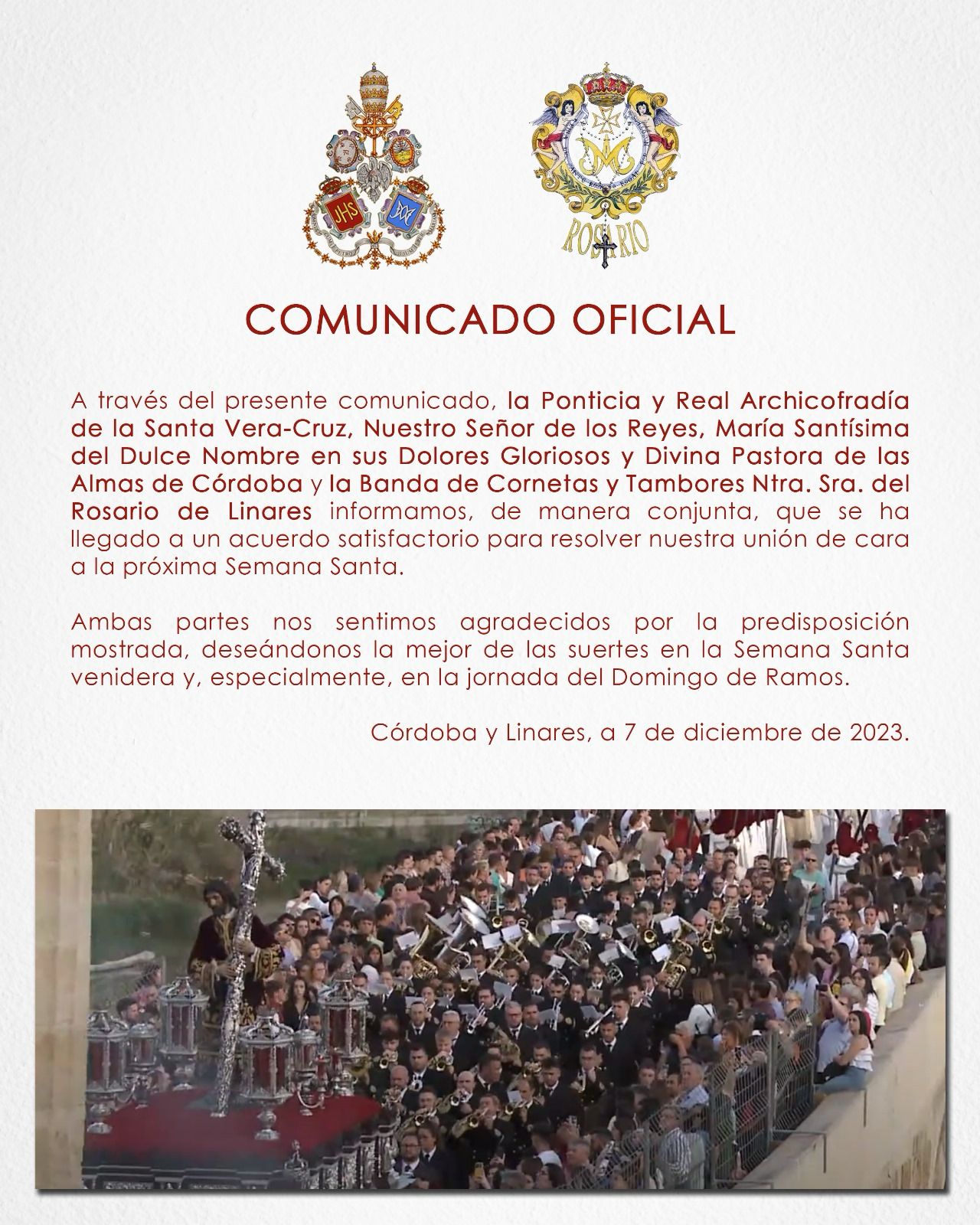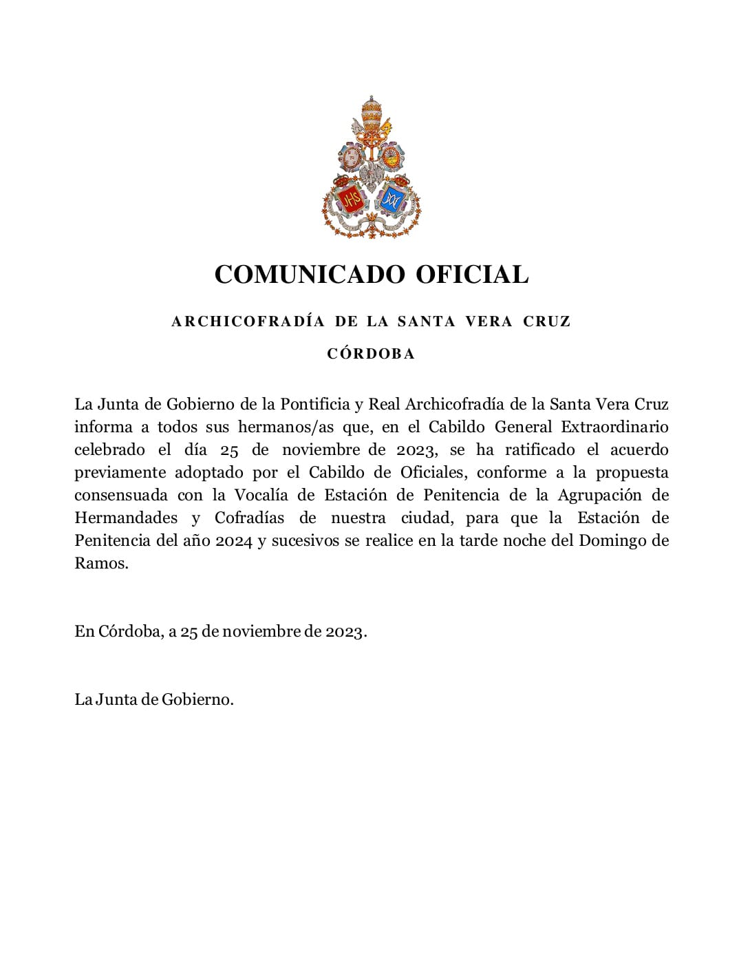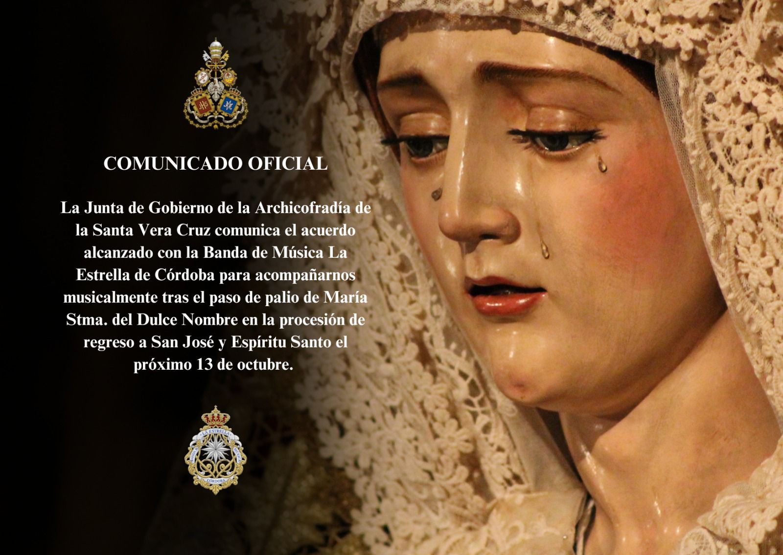 Esta Pontificia y Real Archicofradia se congratula al poder informar a hermanos y devotos que un sueño mucho tiempo anhelado por esta corporación, será una realidad el próximo día 28 de octubre. Gracias a la Fundación Marqués de Vivanco y a Don José María Horrillo López del Rey, presidente de la misma y actual marqués, la Vera-Cruz tendrá su Lignum Crucis. El ha pensado en esta humilde corporación para depositar de forma permanente Sine Die, la Sagrada y Santa Reliquia, que durante siglos pertenece a su familia, para que en nuestra casa reciba culto y veneración. Agradecer desde esta Archicofradía a Don José María y a su Fundación este gran gesto para con nosotros. Una vez que la Santa Reliquia de la Cruz de Cristo esté entre nosotros, podrá ser contemplada y venerada en la Magna Exposición 'Eterna es Su Misericordia' que organiza nuestra Archicofradía entre el 23 de octubre y el 20 de noviembre en la Santa Iglesia Catedral de Córdoba.