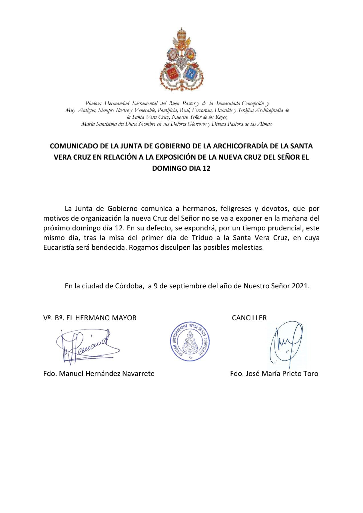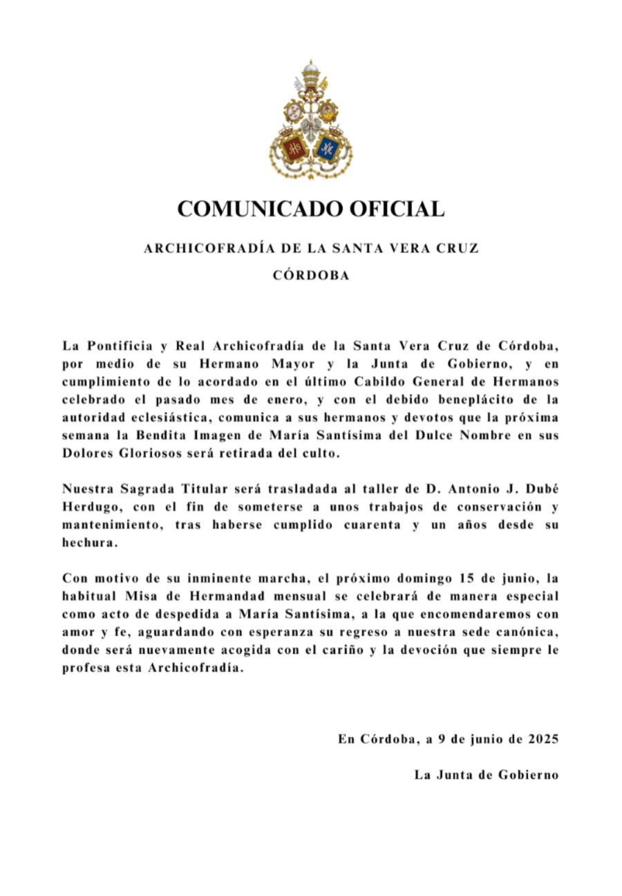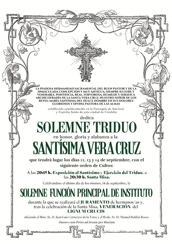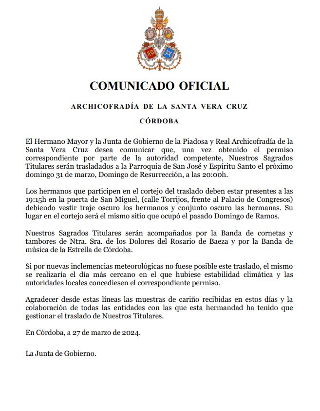 Como bien saben, el próximo domingo 23 de octubre inauguramos la Exposición 'Eterna es Su Miseridordia: la Vera-Cruz en la Diócesis de Córdoba'. La imagen bendita de Nuestro Señor de los Reyes estará presente en dicha exposición, motivo por el cual será trasladado en solemne Via Crucis el jueves 20 de octubre a las 21 horas desde la Parroquia de San José y Espíritu Santo, estando prevista la entrada a la Santa Iglesia Catedral a las 22:30 horas. Los hermanos que van a participar en el cortejo deben estar en la Casa de Hermandad a las 20:30 horas con traje oscuro.