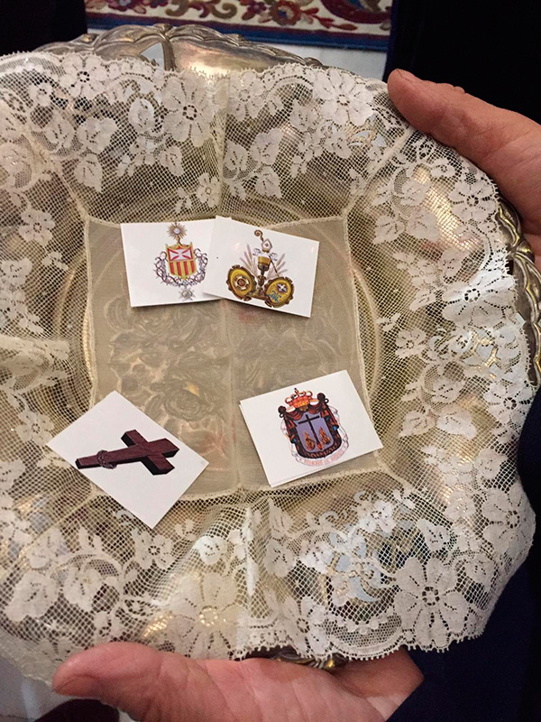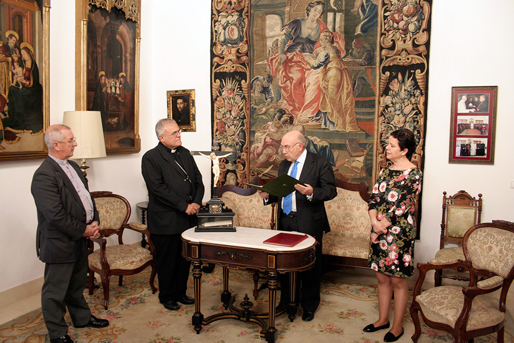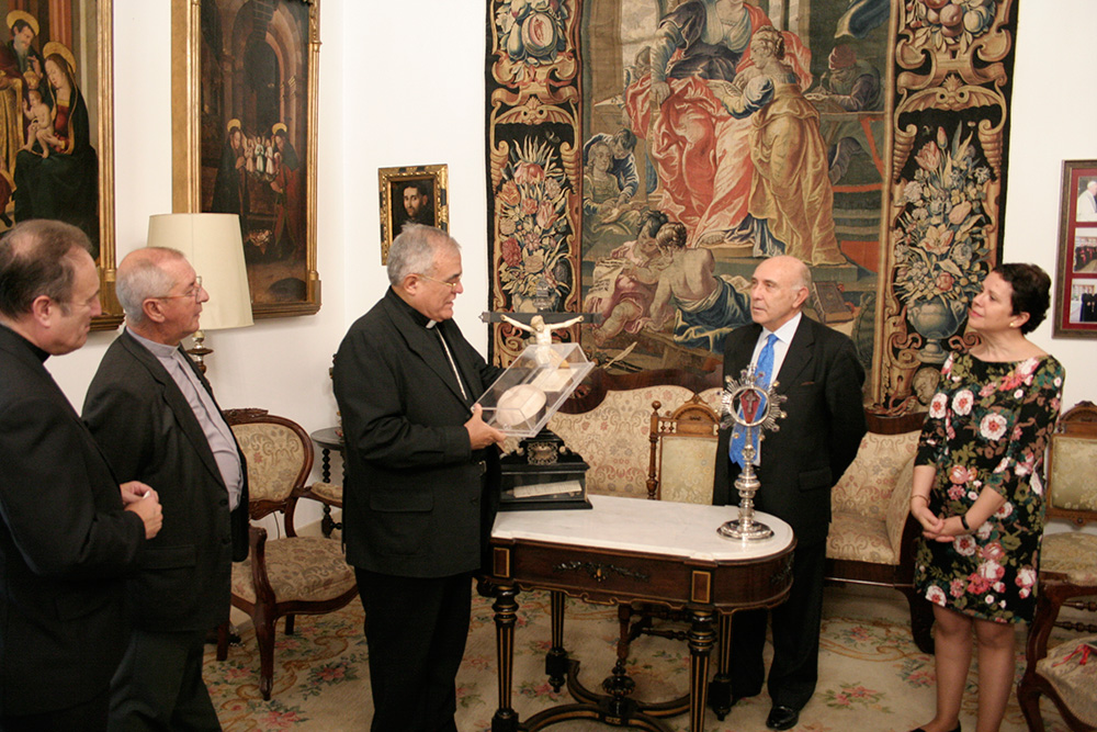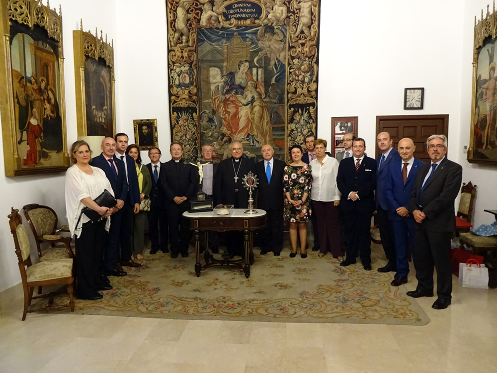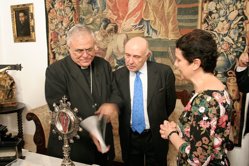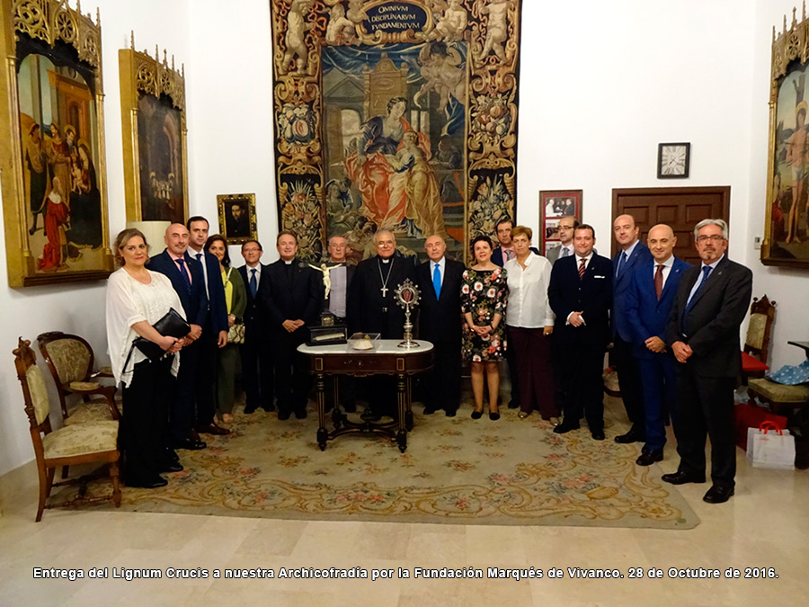 En un sentido e íntimo acto, el Marqués de Vivanco nos ha expuesto las diferentes actividades sociales y caritativas de la Fundación que preside, y su deseo de que la Santa Reliquia de la Cruz de Cristo que pertenece a su familia desde hace varios siglos, sea venerada en nuestra Archicofradía. La reliquia del Lignum Crucis, colocada en cristal de roca y custodia de plata, fue donada por S.S el Papa Clemente VIII a S.M. Católica el Rey Felipe III en el año 1.598, con motivo de su ascenso al trono. Regalada posteriormente por el Rey a don Bartolomé Ortiz de Vivanco en 1.605, en agradecimiento a los grandes servicios prestados a la Monarquía Hispánica por él y su familia a lo largo de los siglos, con lealtad y fidelidad. La Santa Reliquia ha permanecido en la familia durante generaciones, siendo venerada en la Capilla privada del Palacio-Abadía del lugar de Vivanco de Mena, sede del Abad Laico titular del Señorío y posteriormente del Marquesado de Vivanco.
