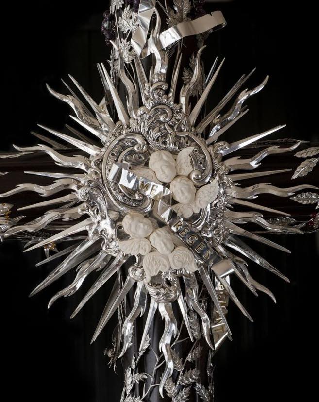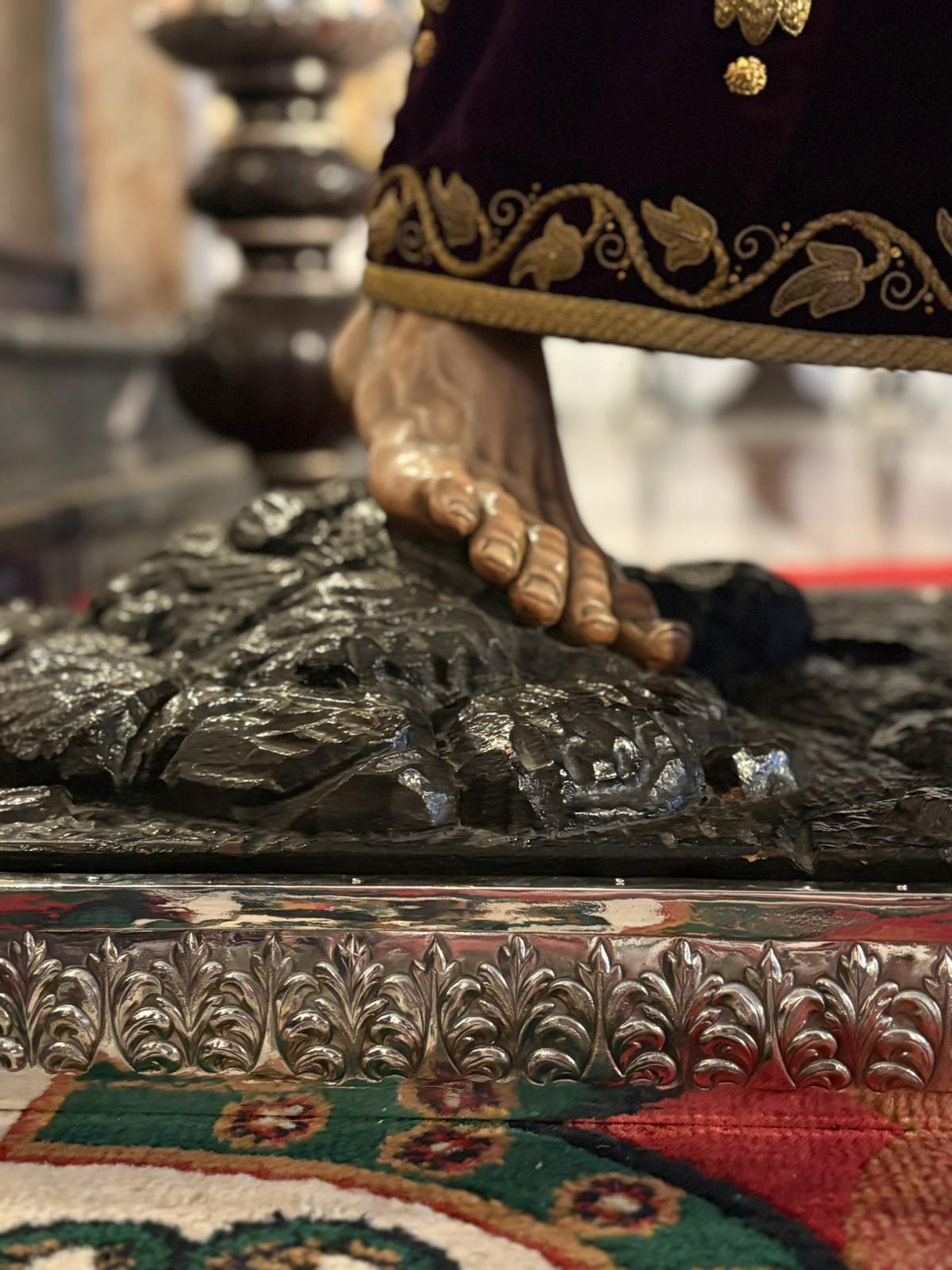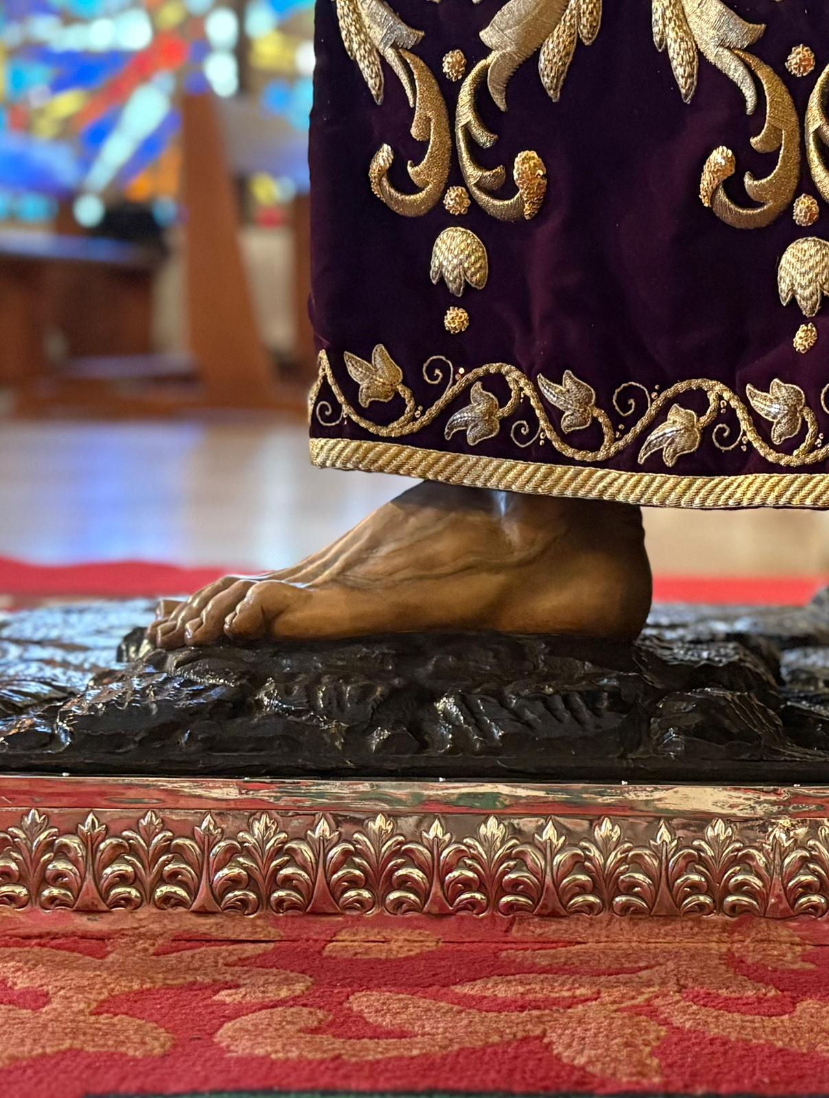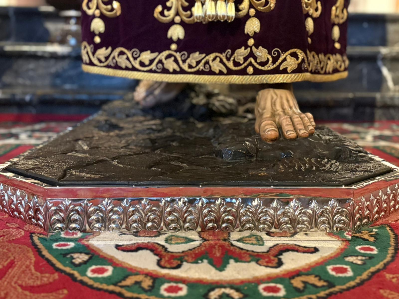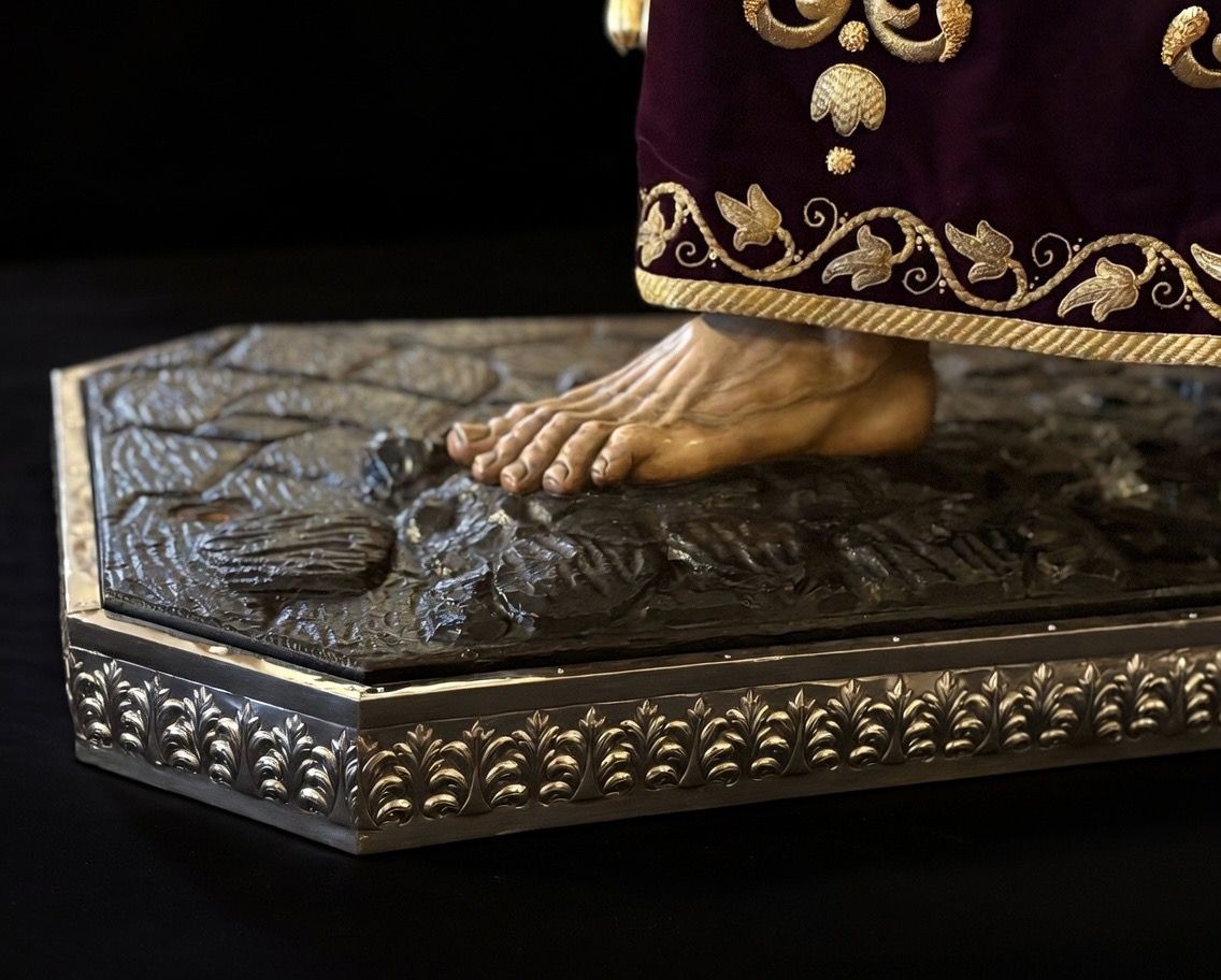 Nueva cubrepeana para Nuestro Señor de los Reyes, diseñada y ejecutada por el orfebre Manuel Valera. La pieza ha sido realizada en plata y presenta una cuidada decoración vegetal de inspiración barroca, en la que destacan elegantes hojas de acanto.