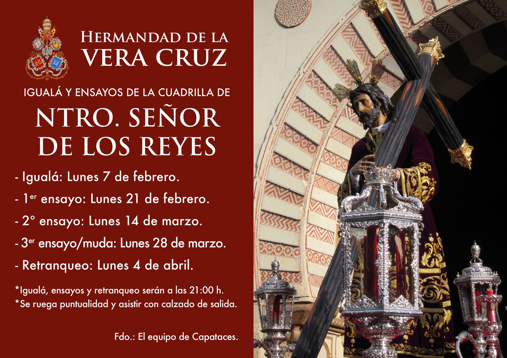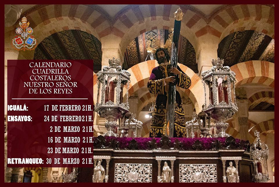 El próximo domingo 22 de marzo tendrá lugar la Meditación en honor a Nuestro Señor de los Reyes a cargo de n. h. D. José Miguel Sánchez Morales. Tras la misma realizaremos el ejercicio del Santo Vía Crucis, y la posterior subida al paso procesional del Señor.