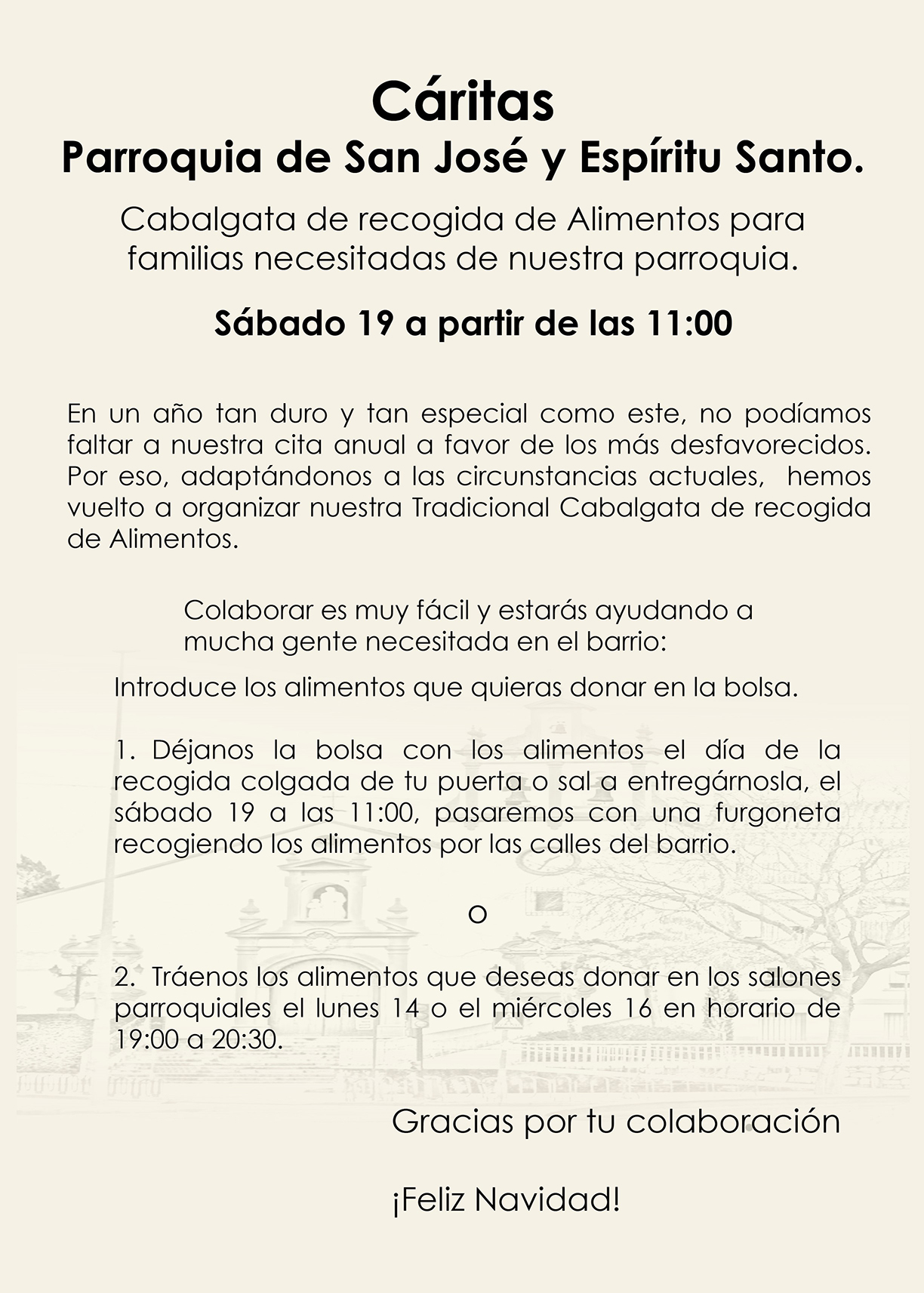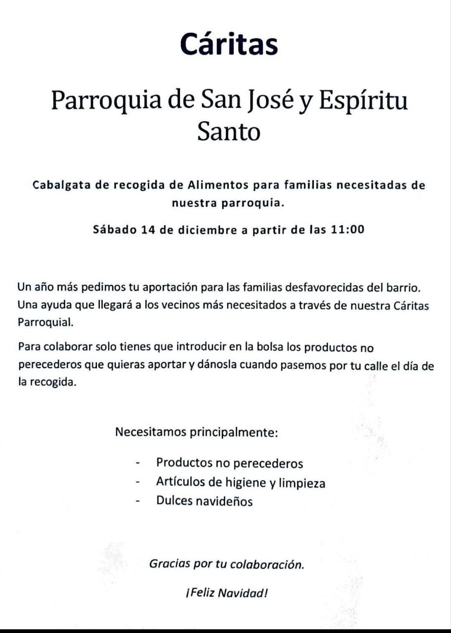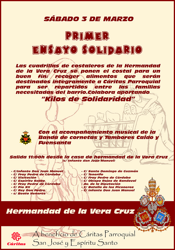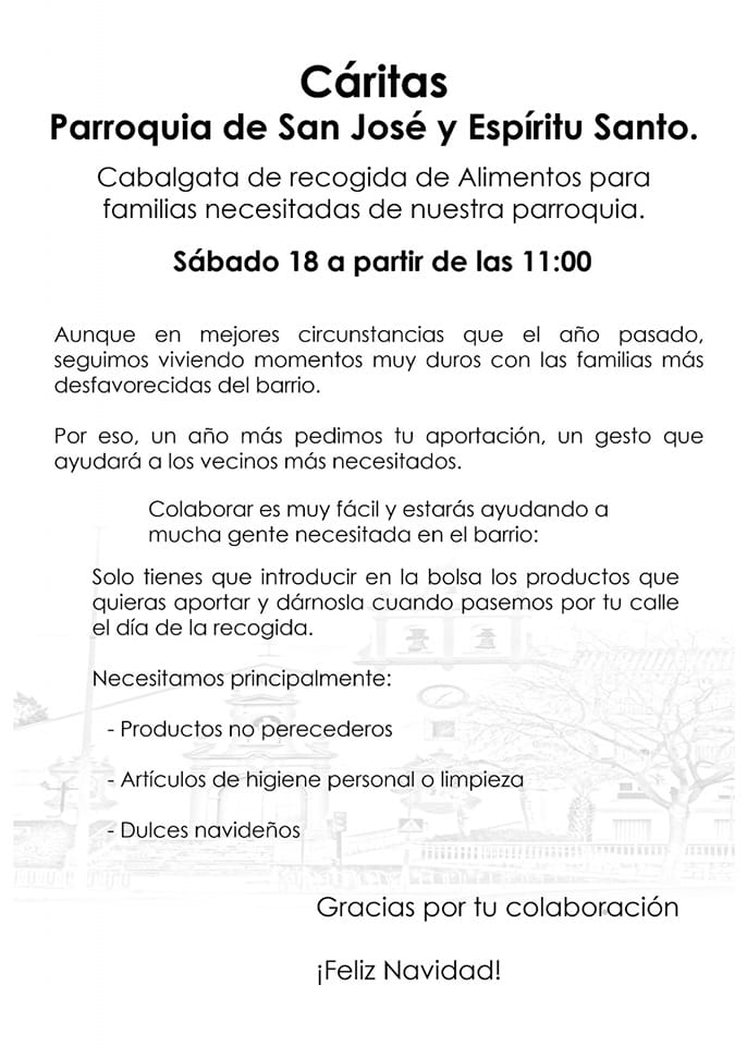 Este sábado 17 de diciembre a partir de las 11 de la mañana, nuestra Hermandad participa y colabora en la cabalgata de recogida de alimentos que organiza Cáritas de nuestra parroquia. Pasaremos por las calles del Campo de la Verdad recogiendo kilos de alimentos que sus vecinos aportan en señal de solidaridad y cariño hacia los más necesitados de nuestra feligresía. Es por ello que os animamos a todos a acercaros por el barrio, y en especial a los hermanos de nuestra Archicofradía, ofreciendo un poco de caridad hacia el que en estas fechas tan señaladas carece de los alimentos más básicos.
