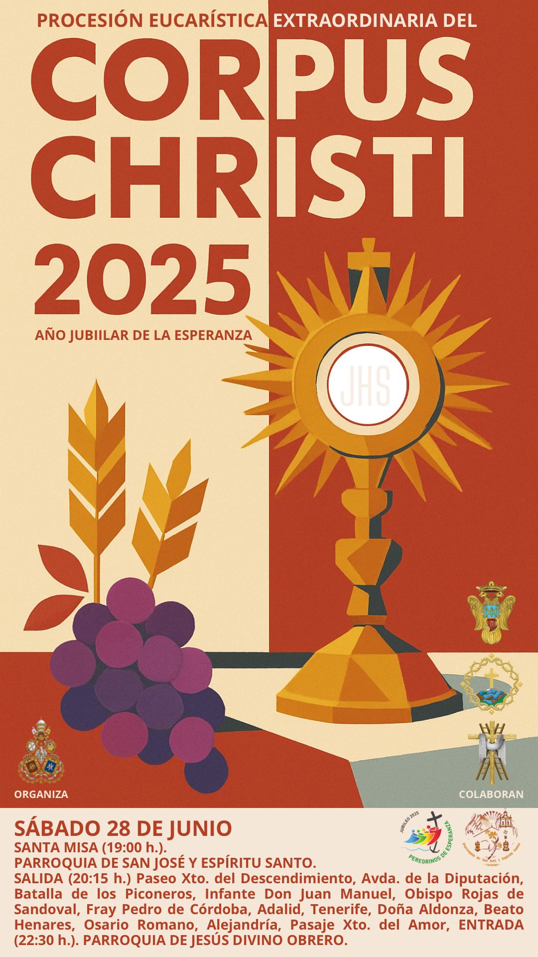 En la mañana de hoy ha tenido lugar la presentación oficial del cartel anunciador de la Semana Santa de Córdoba 2026, una obra firmada por el artista Jonathan Sánchez Aguilera. La composición sitúa en el eje central a Nuestro Padre Jesús Nazareno Rescatado; en torno a Él se despliega un sugerente cielo concebido a modo de mosaico simbólico, en el que se entrelazan recuerdos, devociones y estampas profundamente arraigadas en la tradición cofrade de la ciudad. Este entramado visual articula la memoria colectiva de la Semana Santa cordobesa, evocando momentos, imágenes y sentimientos compartidos por generaciones de fieles.