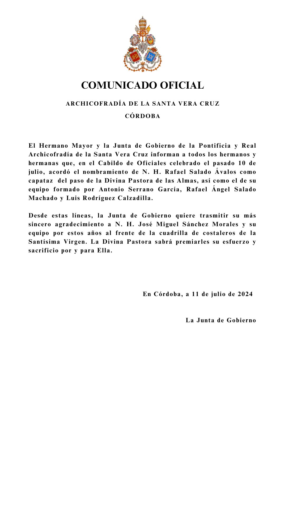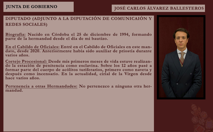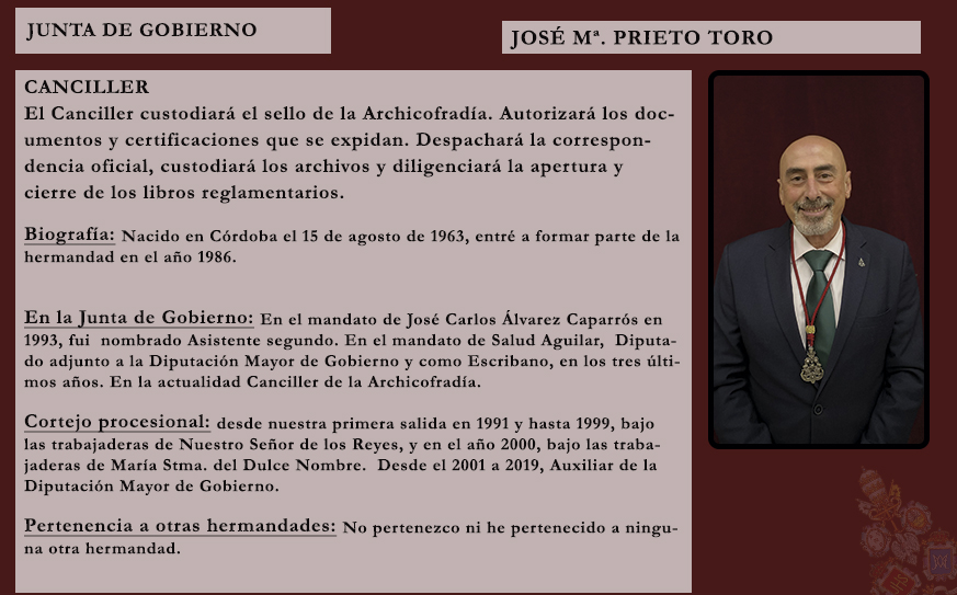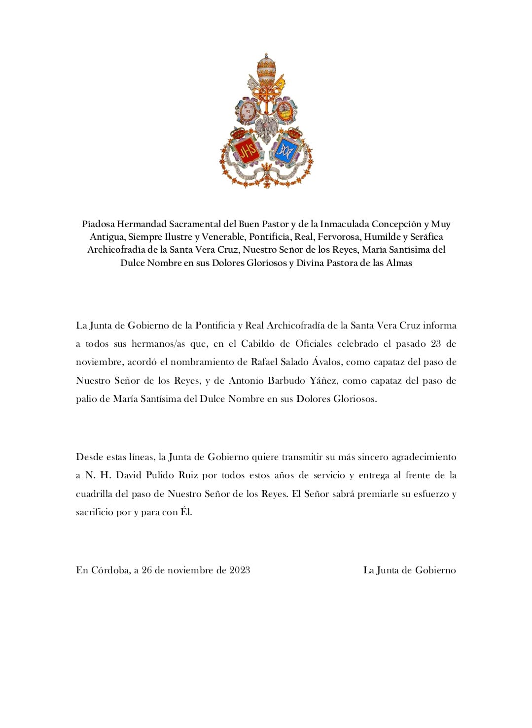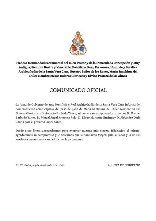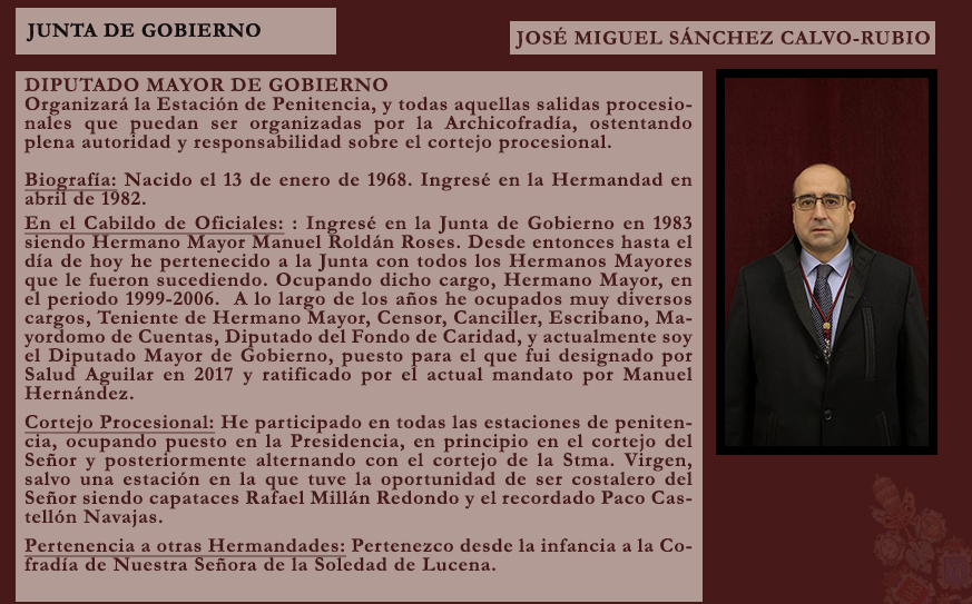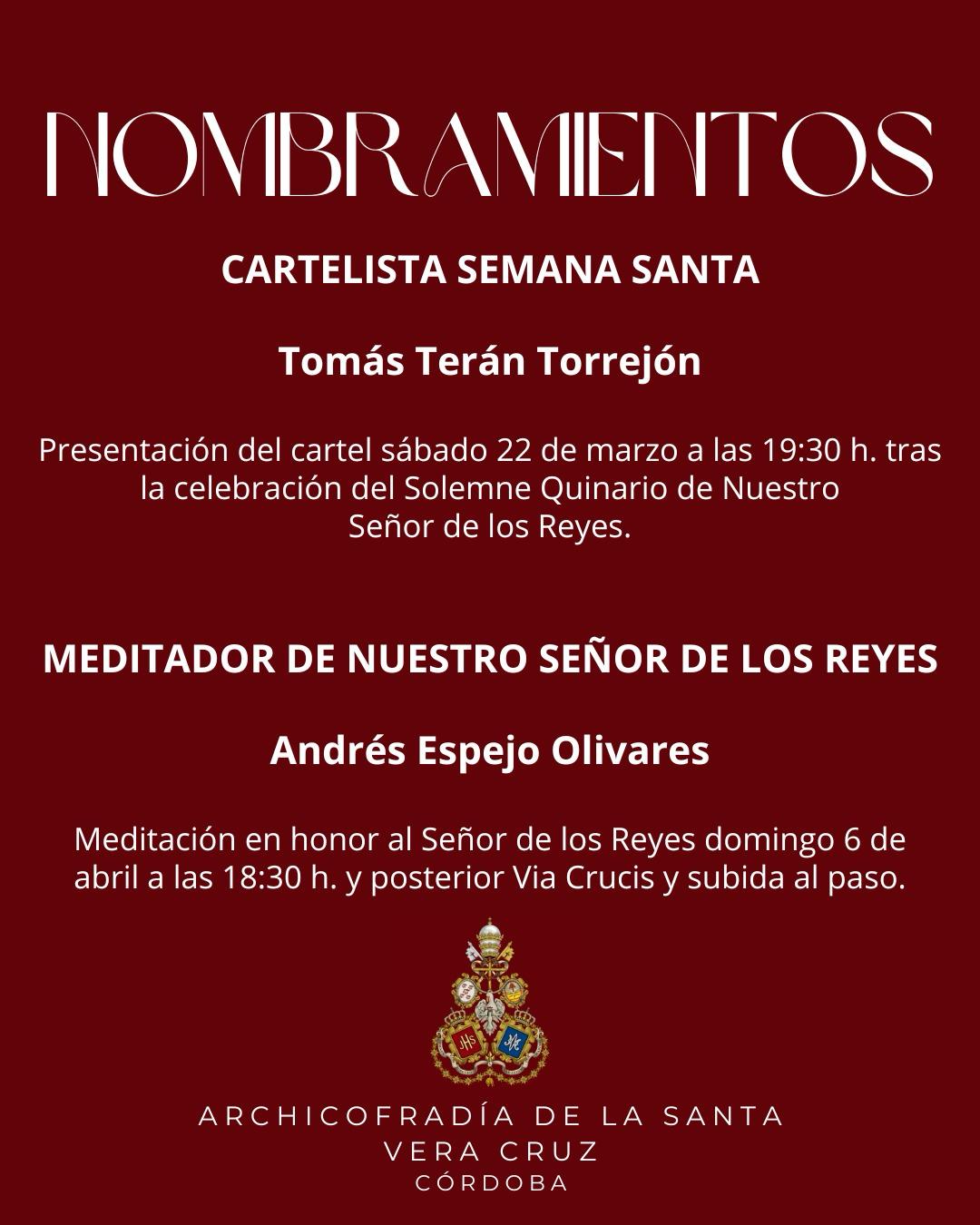 La Junta de Gobierno de la Archicofradía de la Santa Vera Cruz tiene el honor de anunciar el nombramiento de nuestro hermano José Miguel Sánchez Morales como Meditador del Señor de los Reyes para la presente Cuaresma.