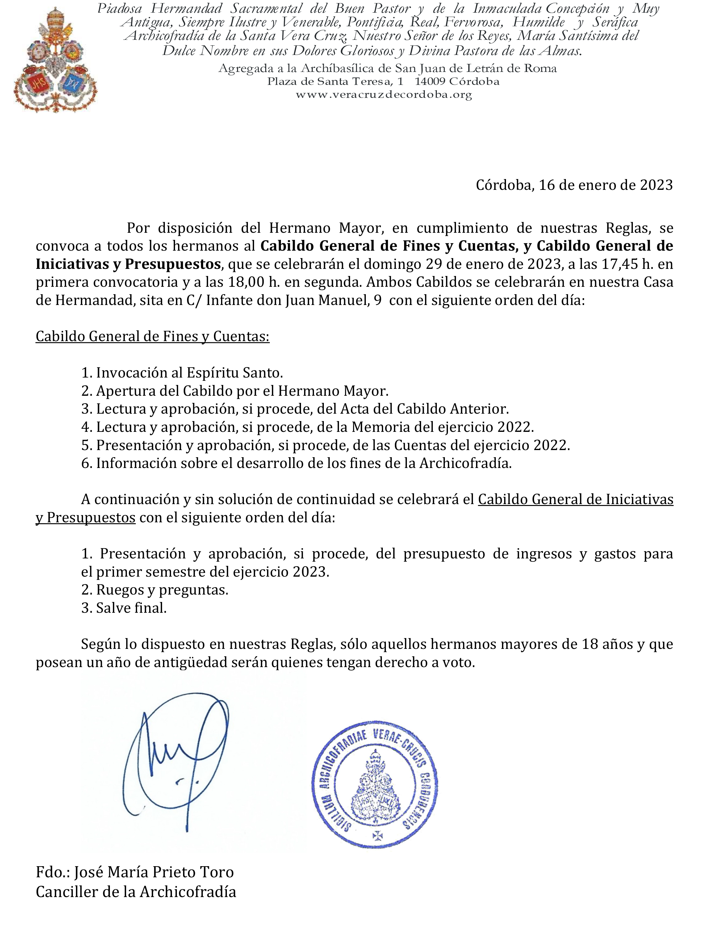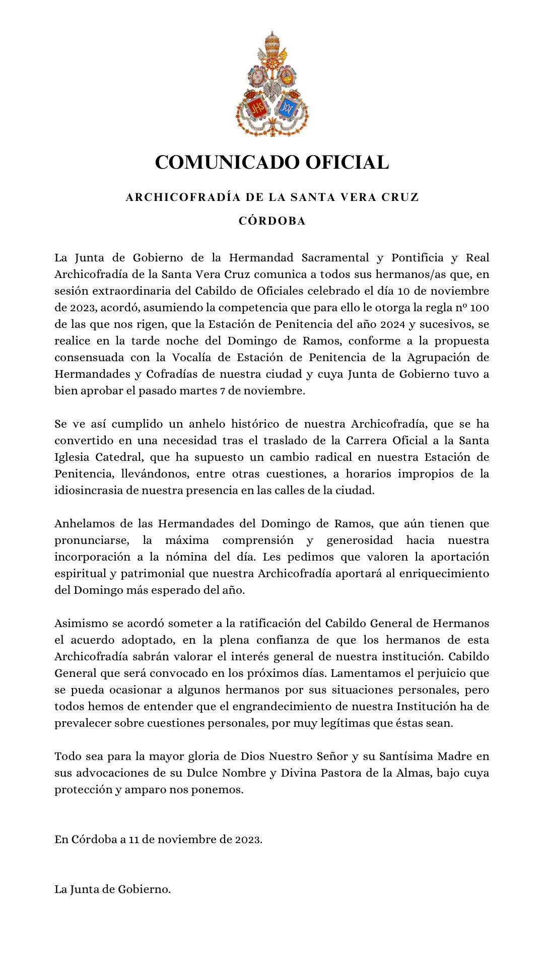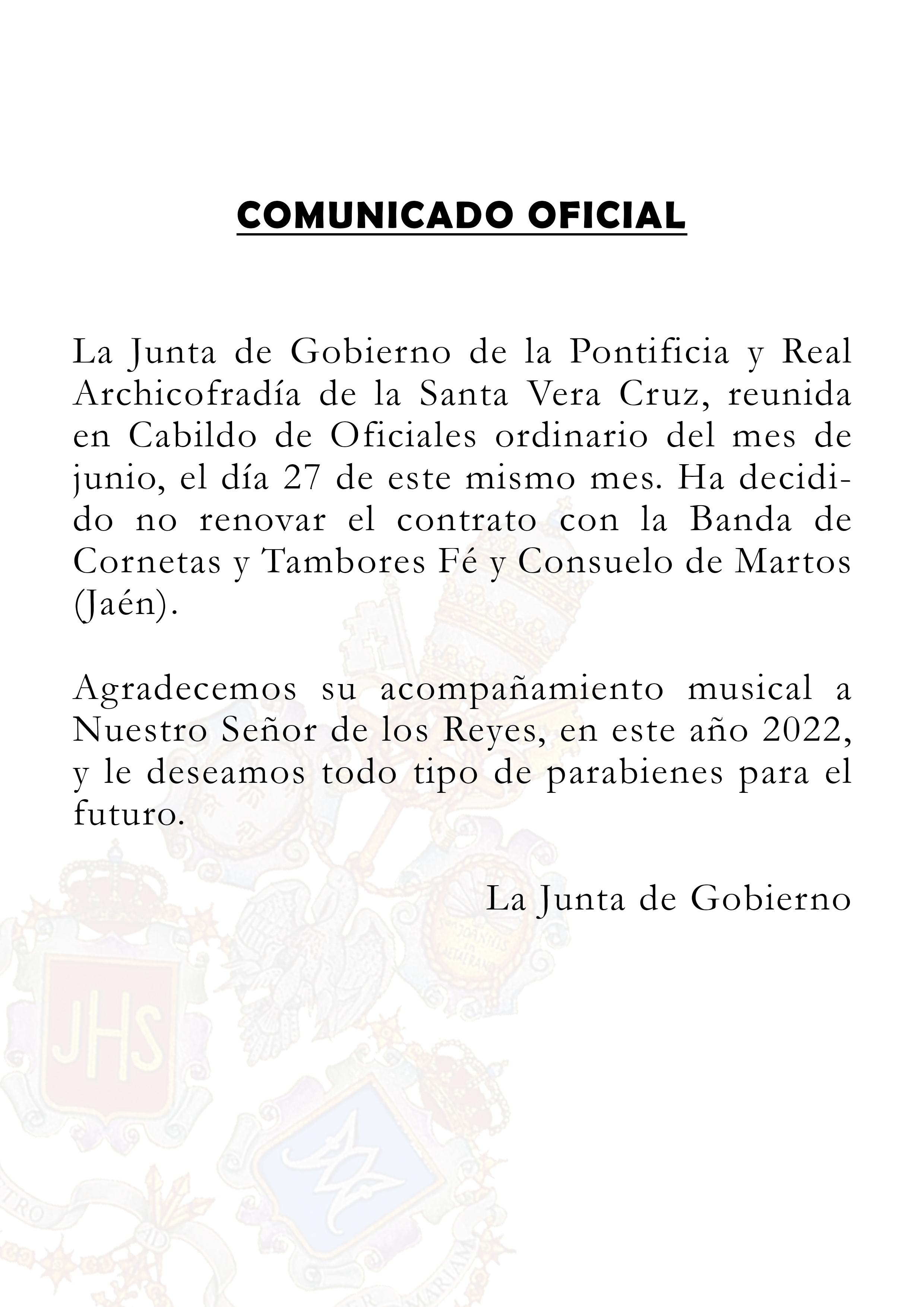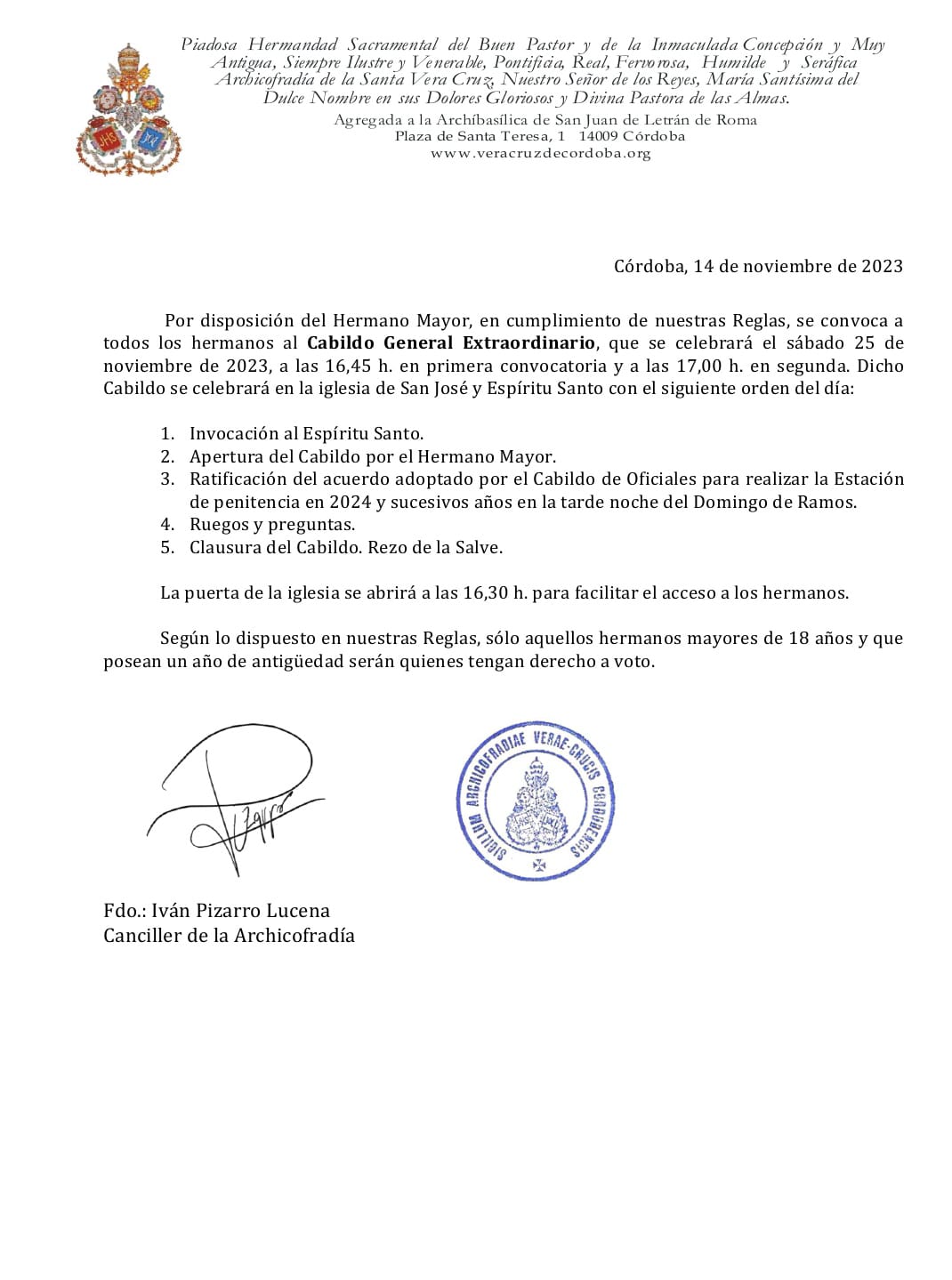 La Junta de Gobierno de la Archicofradía de la Santa Vera Cruz tiene el honor de anunciar el nombramiento de nuestro hermano José Miguel Sánchez Morales como Meditador del Señor de los Reyes para la presente Cuaresma.